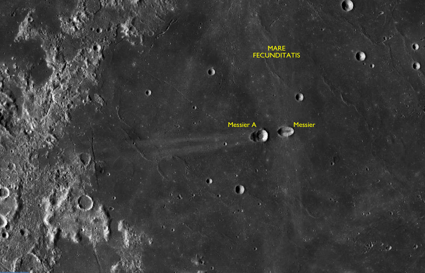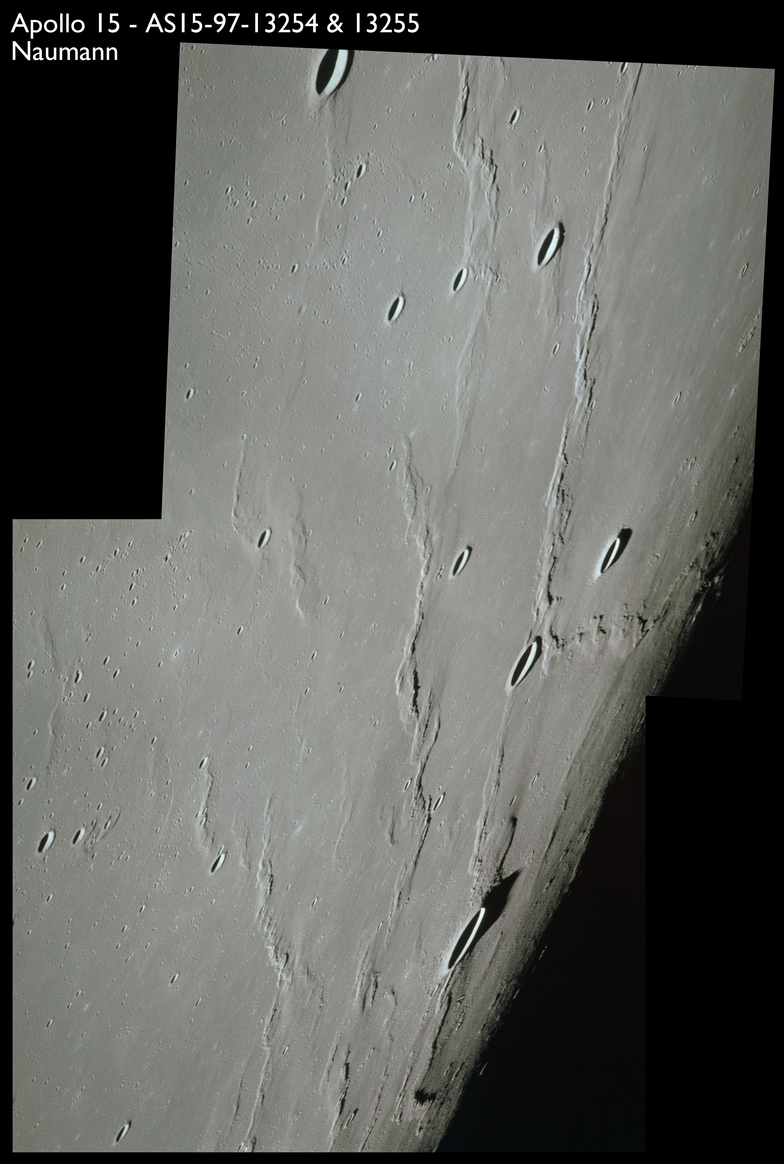A composite of these two frames shows the 9.6-km Naumann at the bottom and the complex of wrinkle ridges that cross Oceanus Procellarum.