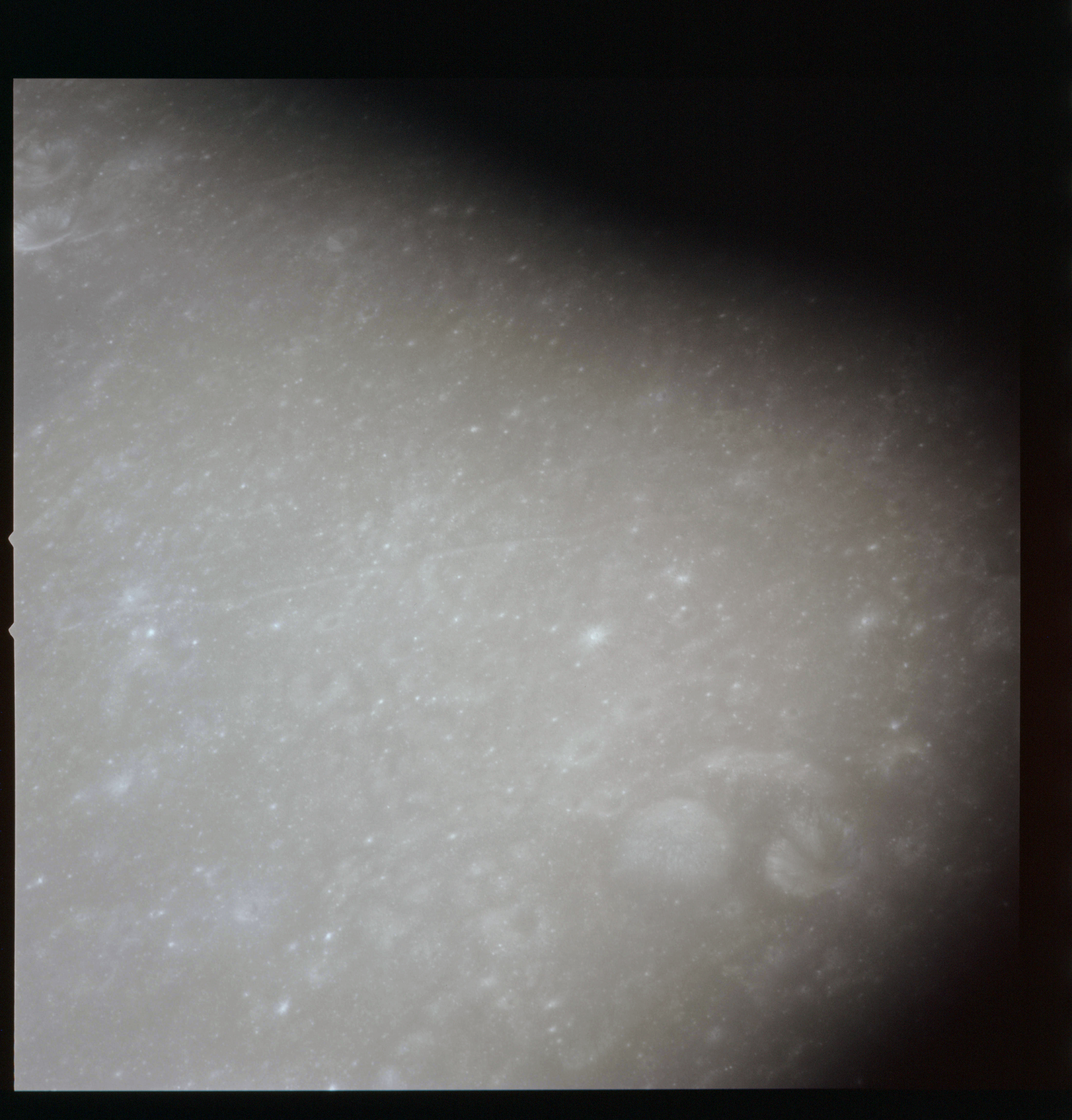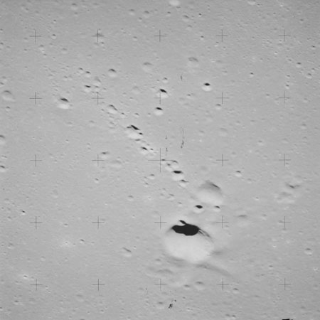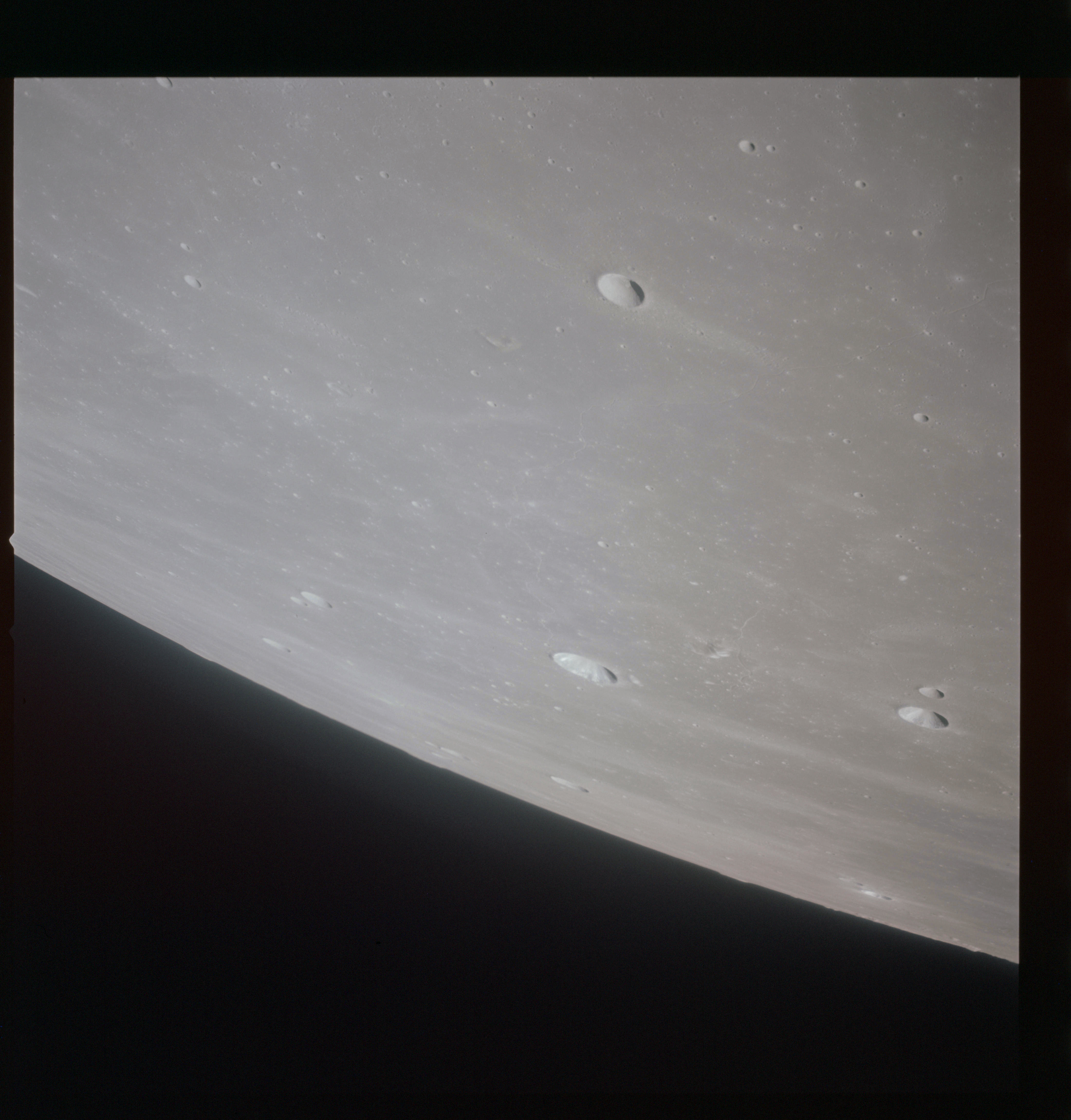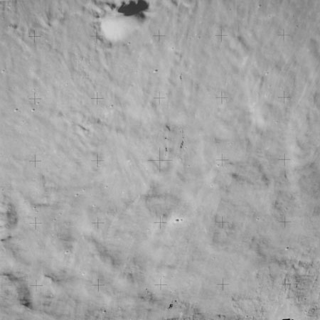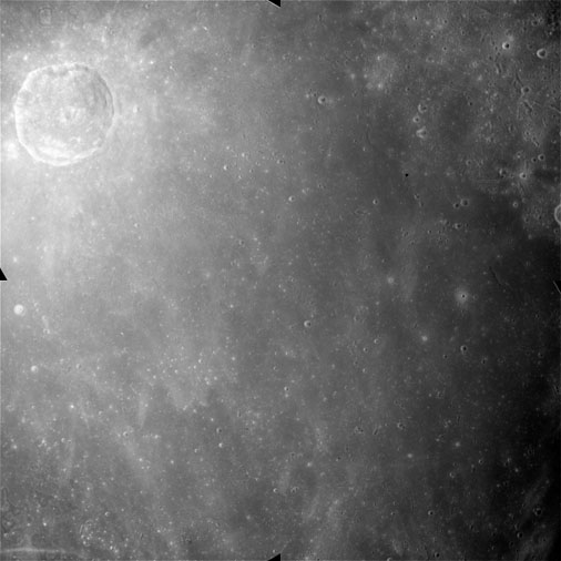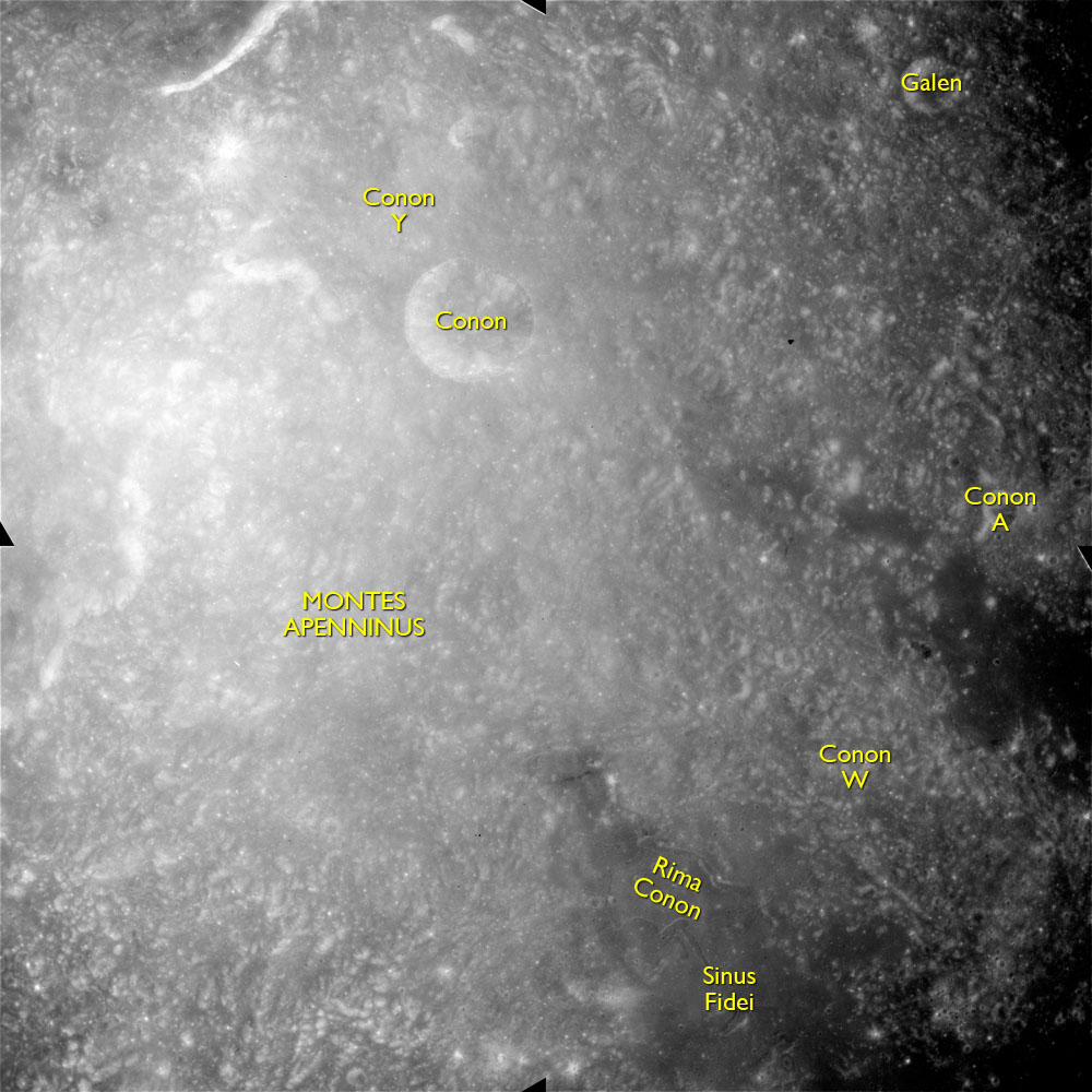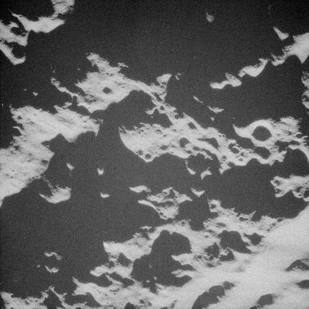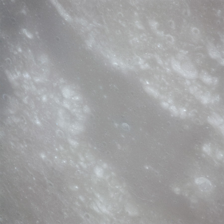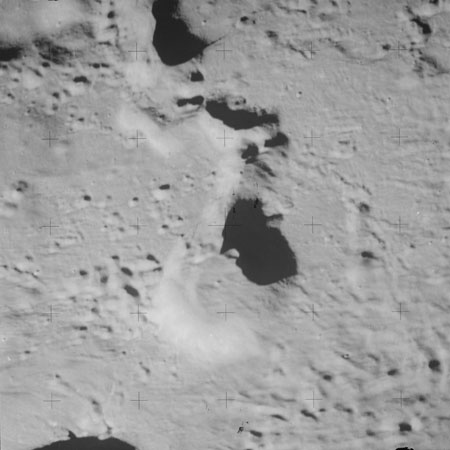 When the terminator does arrive, the Mapping Camera is started, its PAD T-start time being 214:20:03. In this pass it will take 143 frames between the sunset and sunrise terminators, about one frame every 25 seconds. These are AS15-M-2351 to 2493 and they will be looking directly downwards. Beginning with AS15-M-2354, every tenth image from this sequence will be presented here.