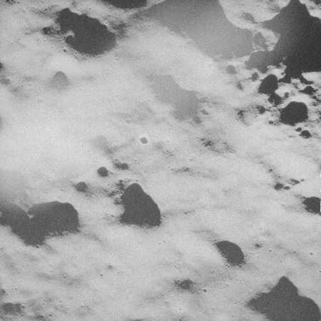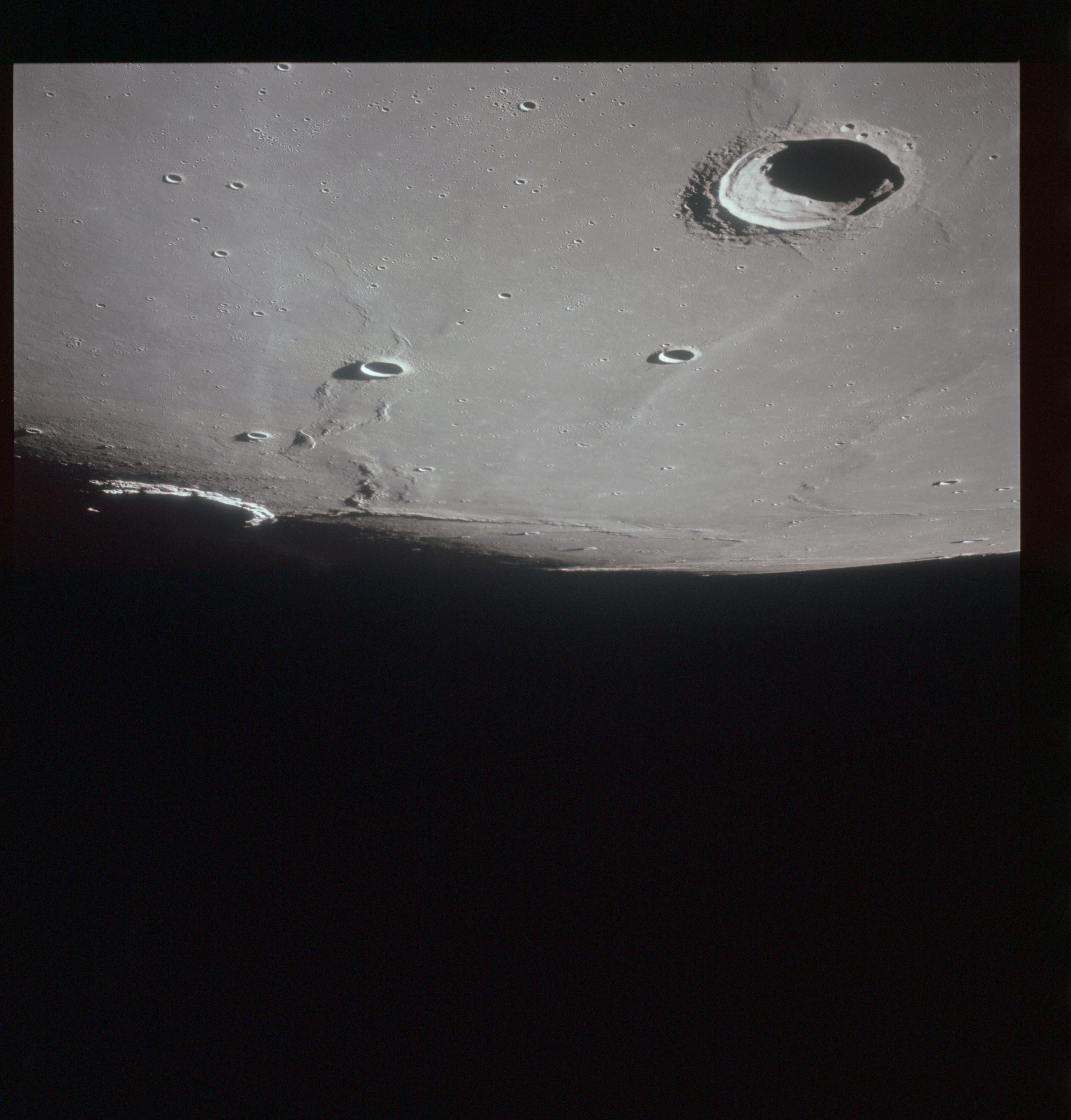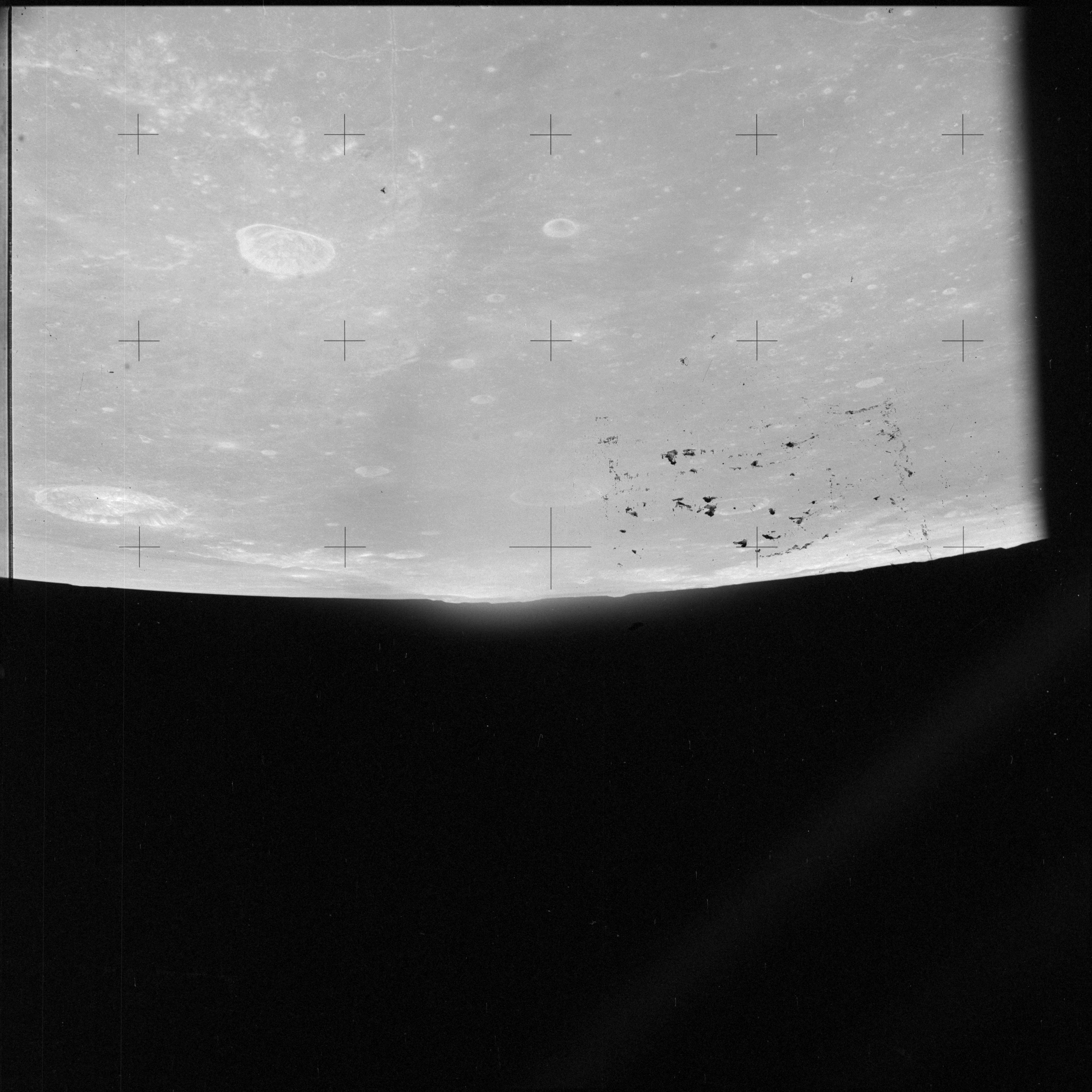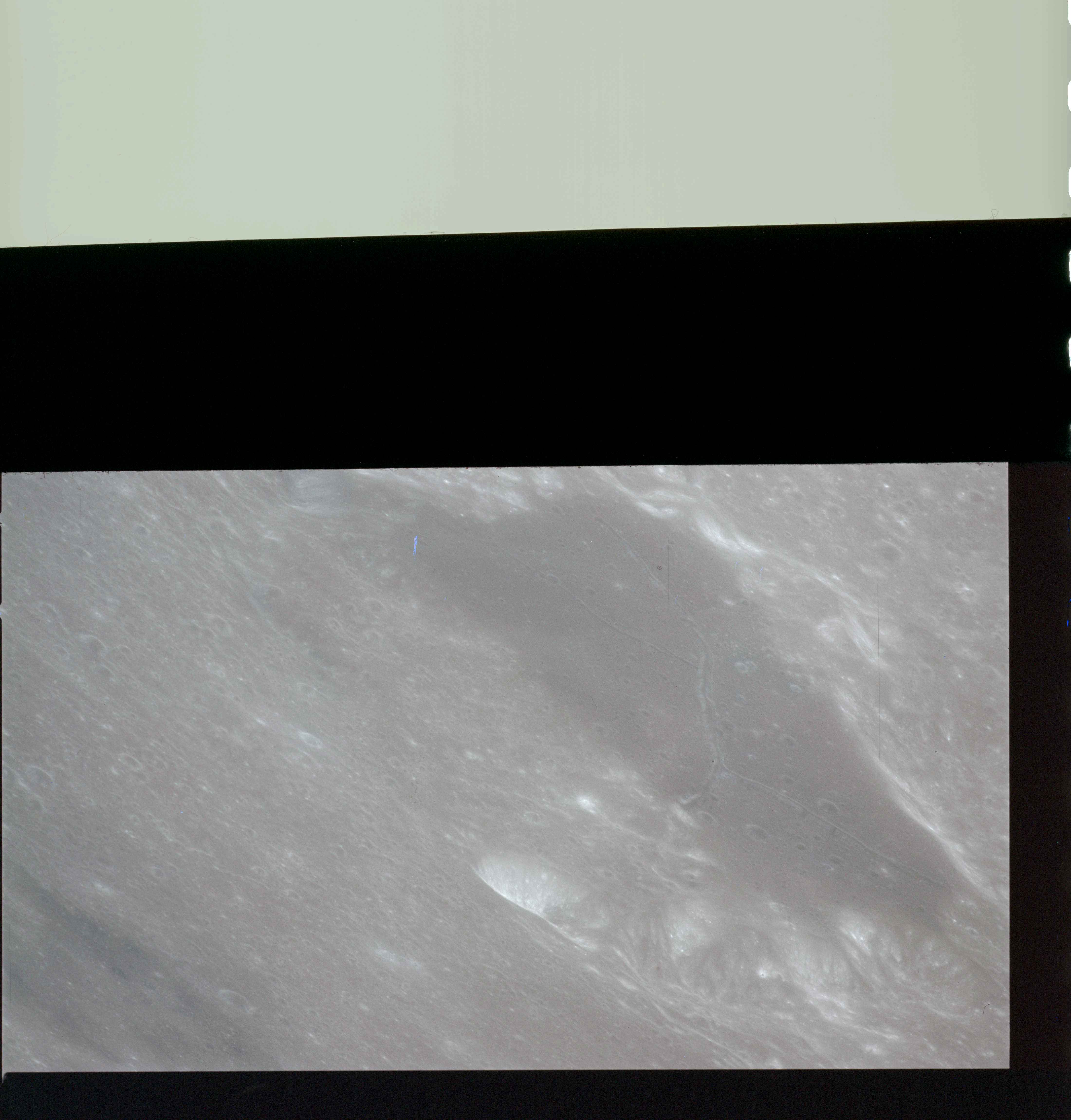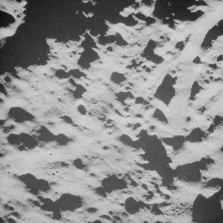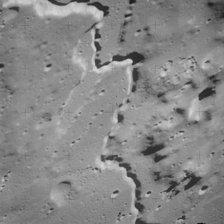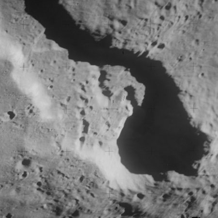 When the terminator does arrive, the Mapping Camera is started, its PAD T-start time being 214:20:03. In this pass it will take 143 frames between the sunset and sunrise terminators, about one frame every 25 seconds. These are AS15-M-2351 to 2493 and they will be looking directly downwards. Beginning with AS15-M-2354, every tenth image from this sequence will be presented here.