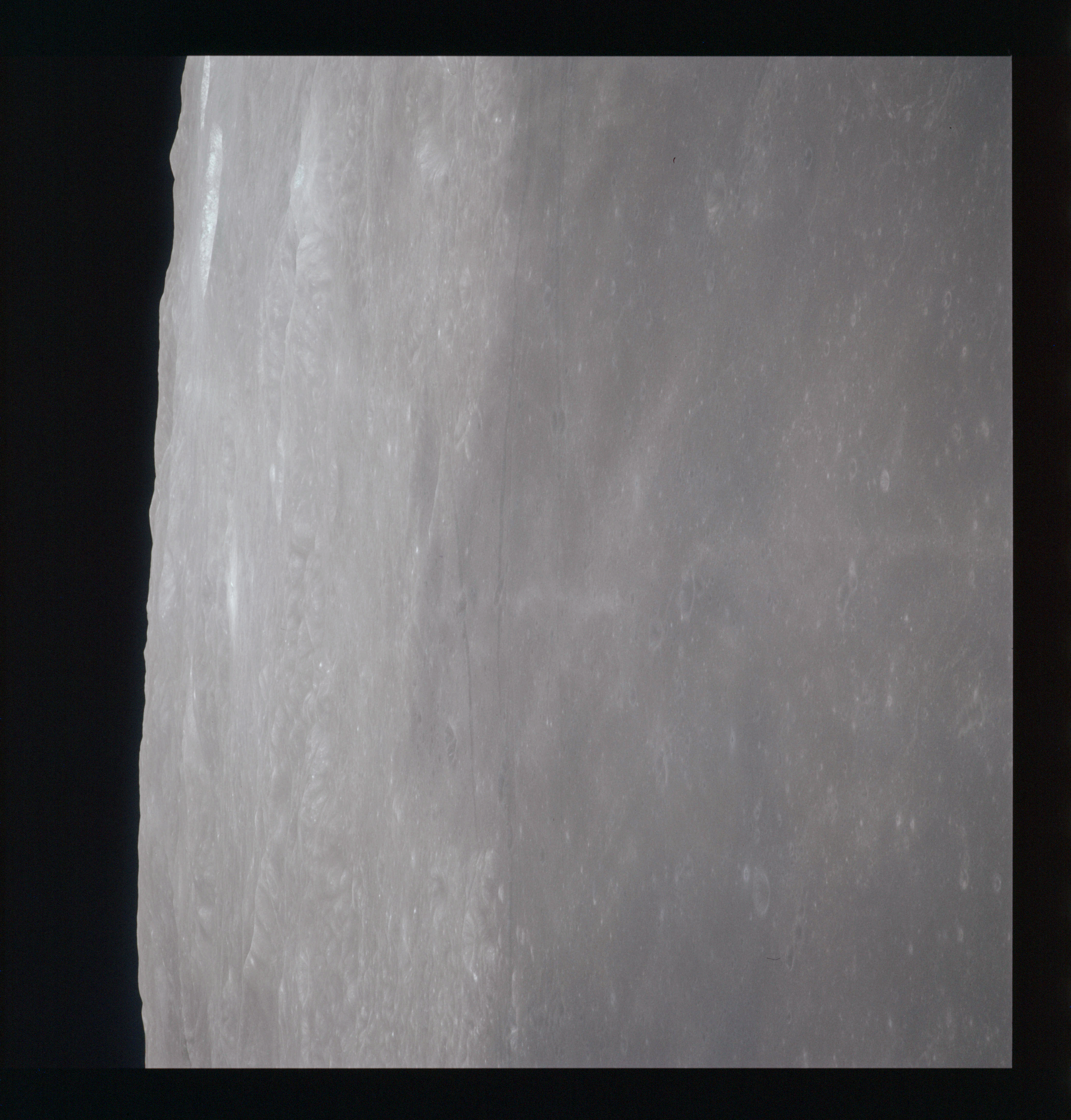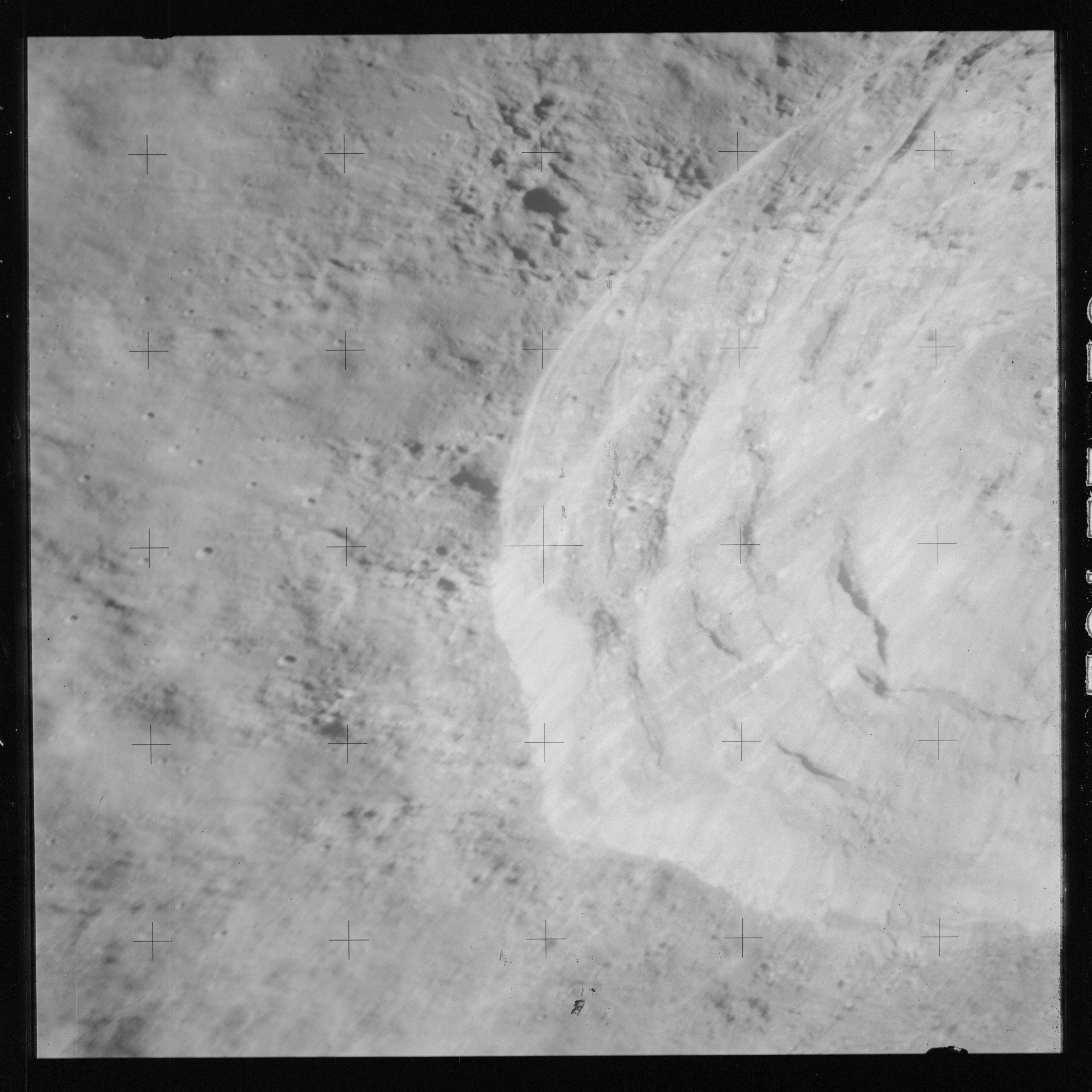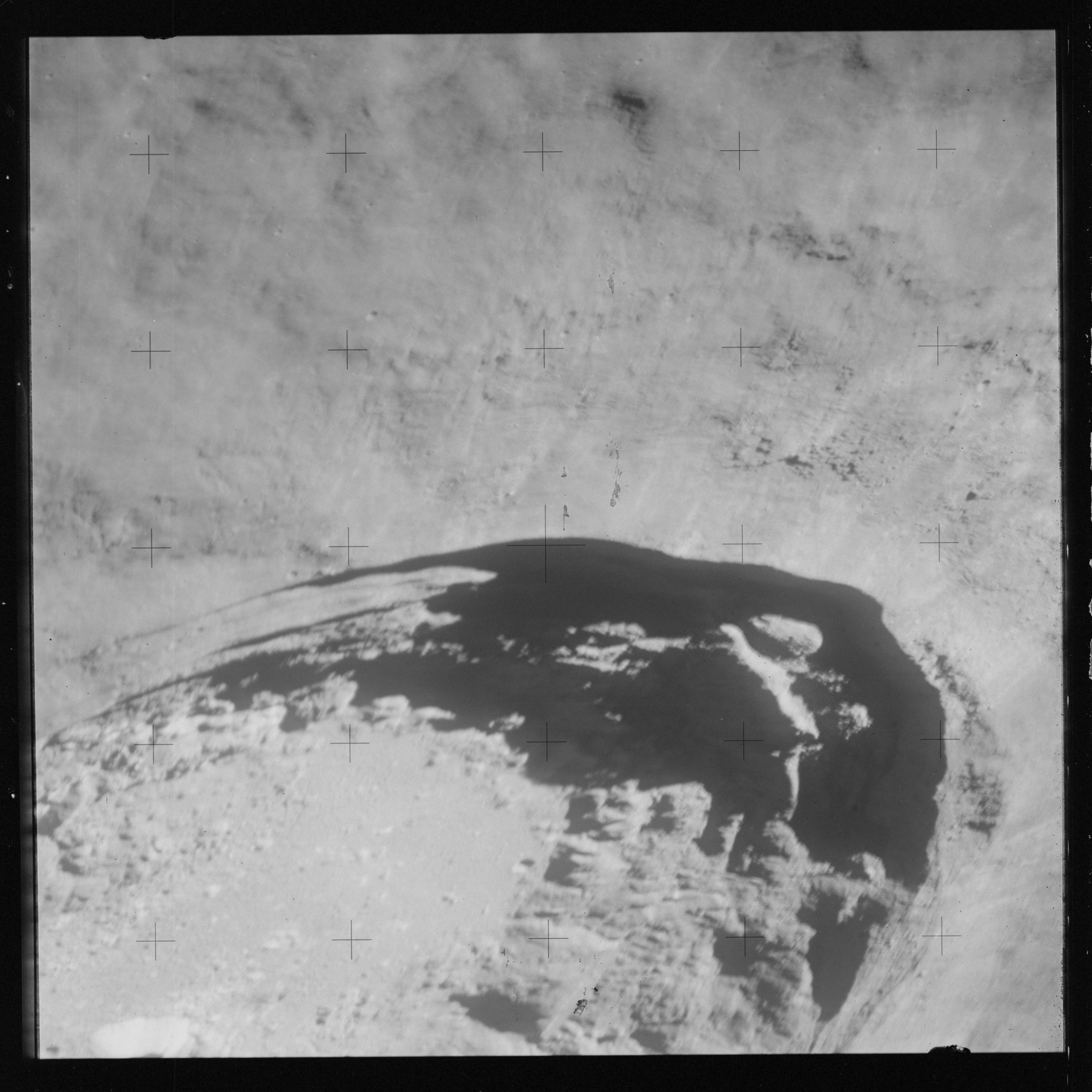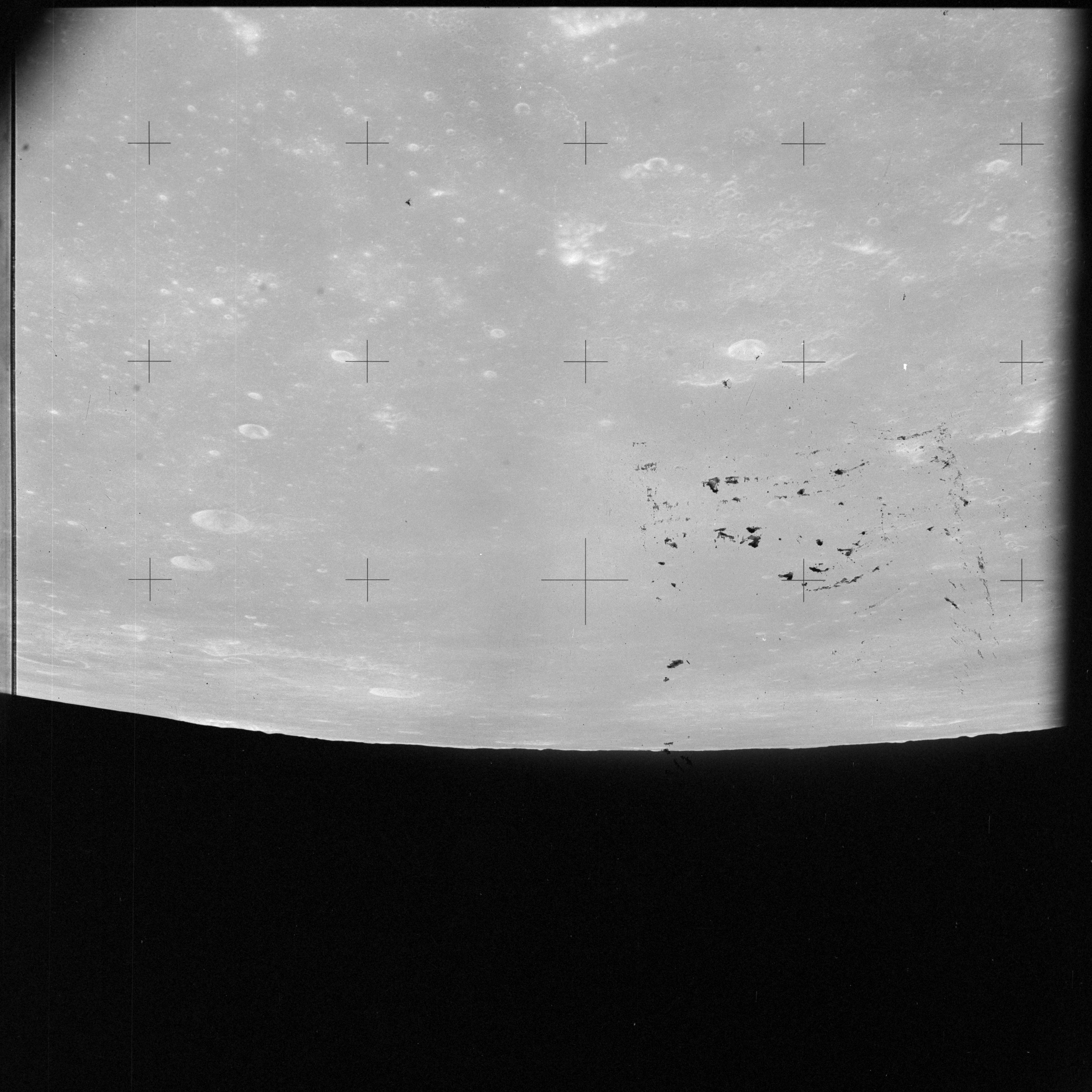 When the terminator does arrive, the Mapping Camera is started, its PAD T-start time being 214:20:03. In this pass it will take 143 frames between the sunset and sunrise terminators, about one frame every 25 seconds. These are AS15-M-2351 to 2493 and they will be looking directly downwards. Beginning with AS15-M-2354, every tenth image from this sequence will be presented here.
