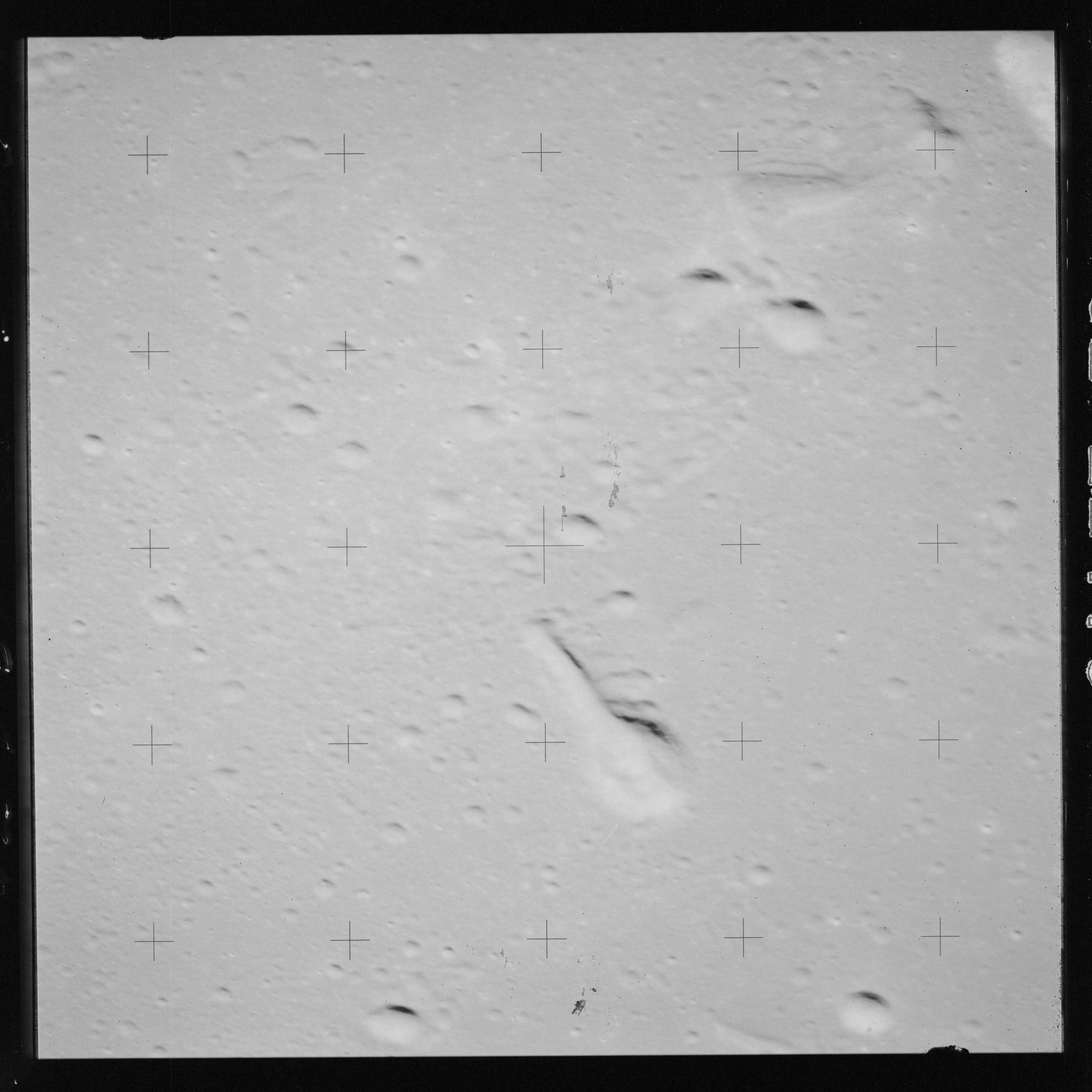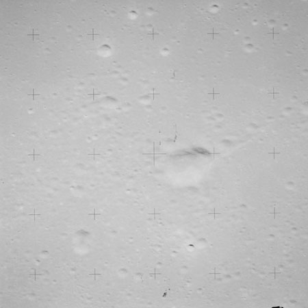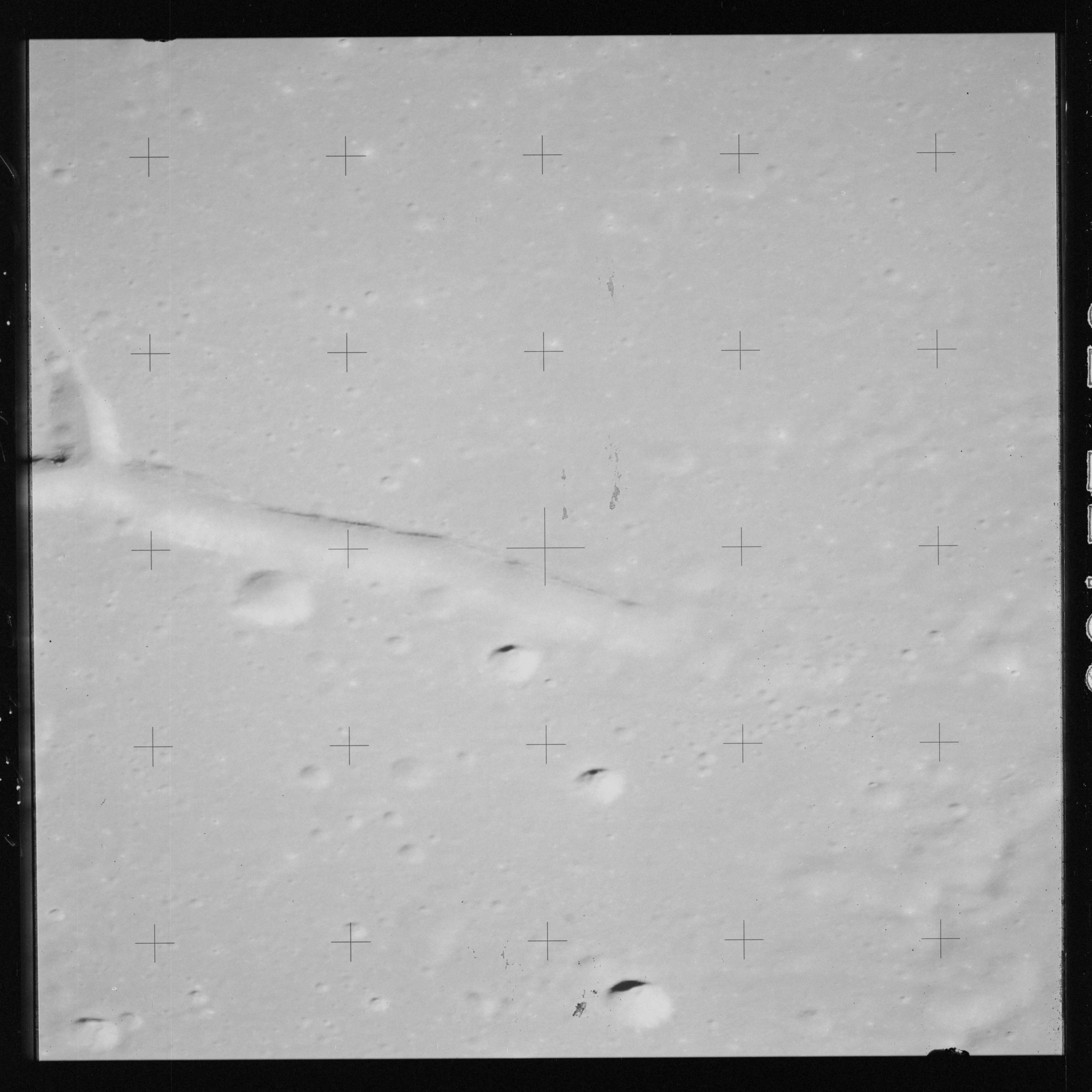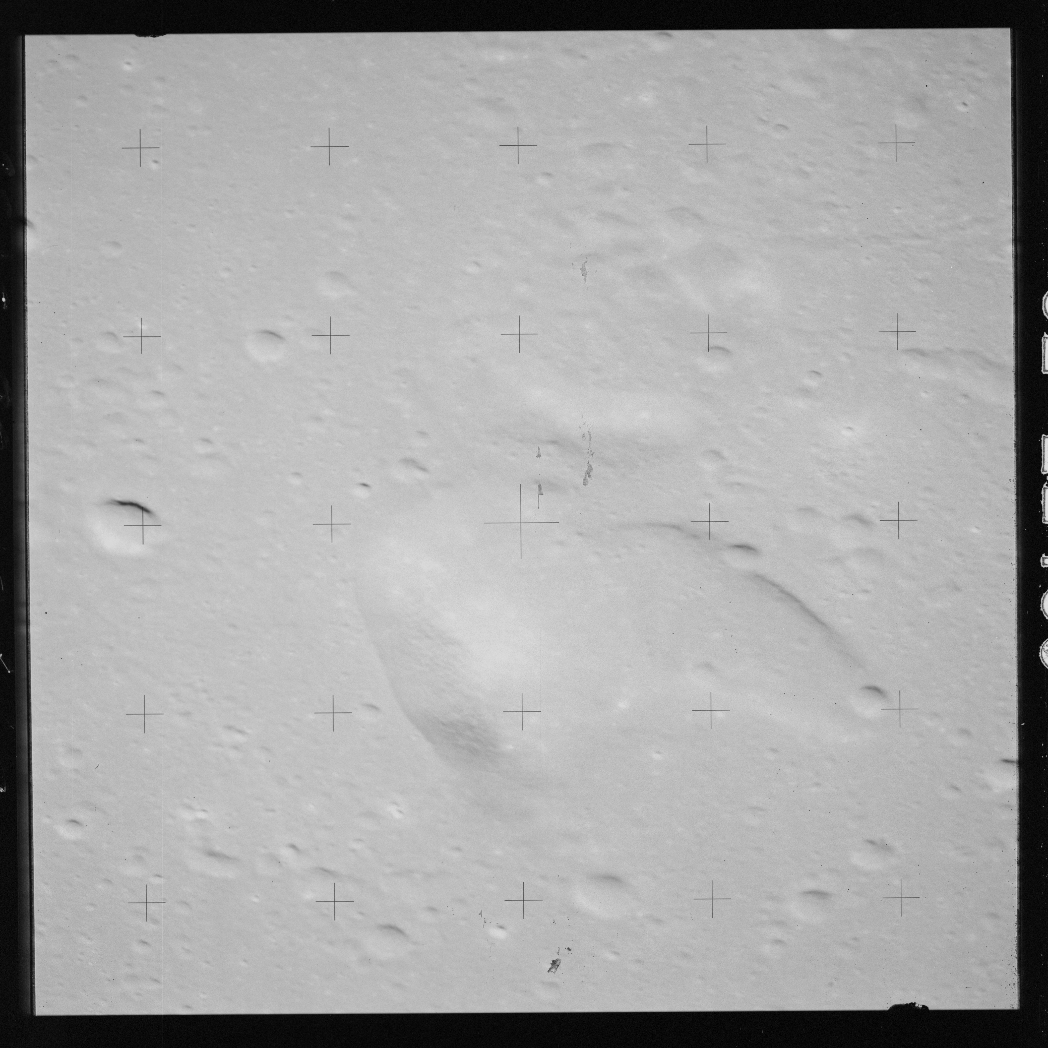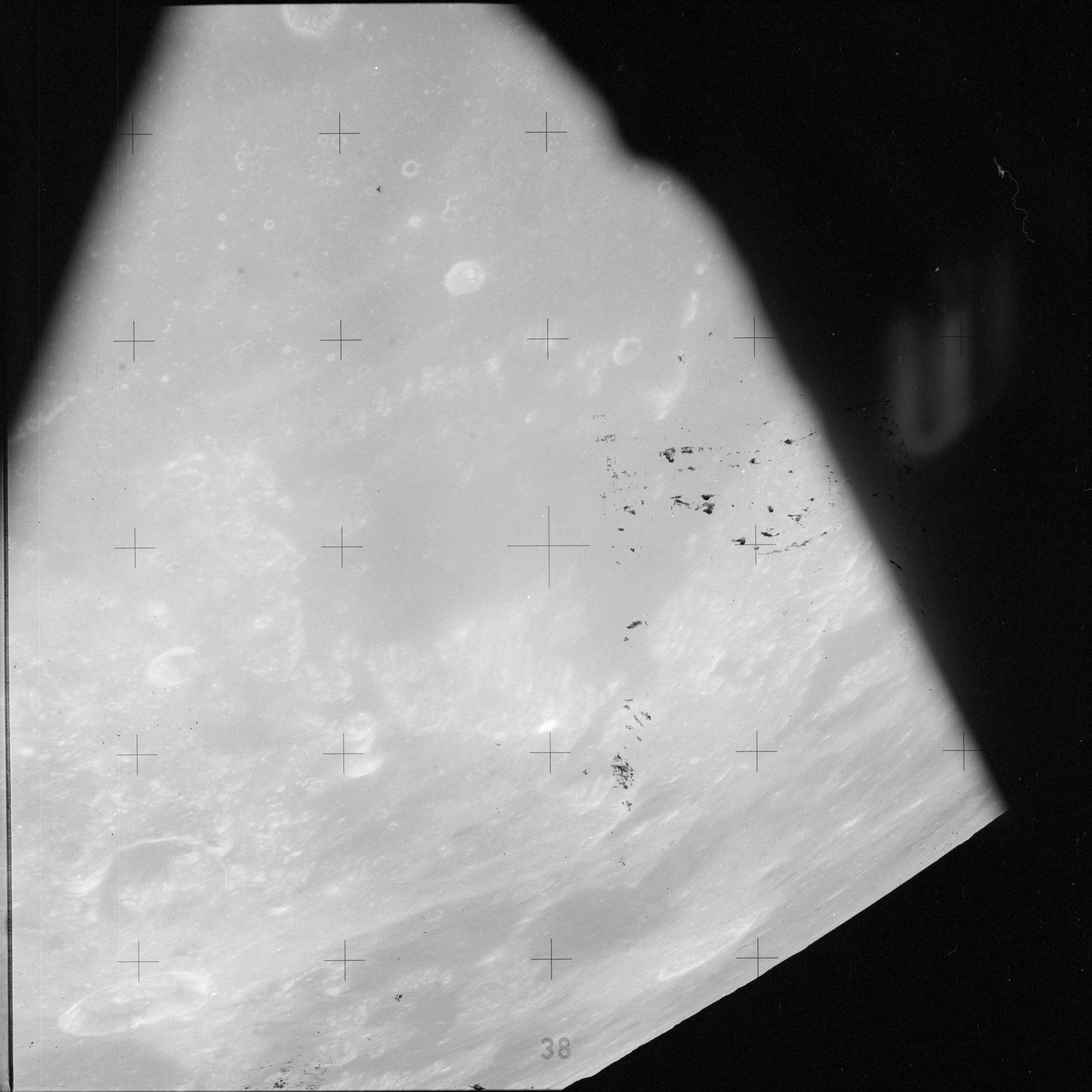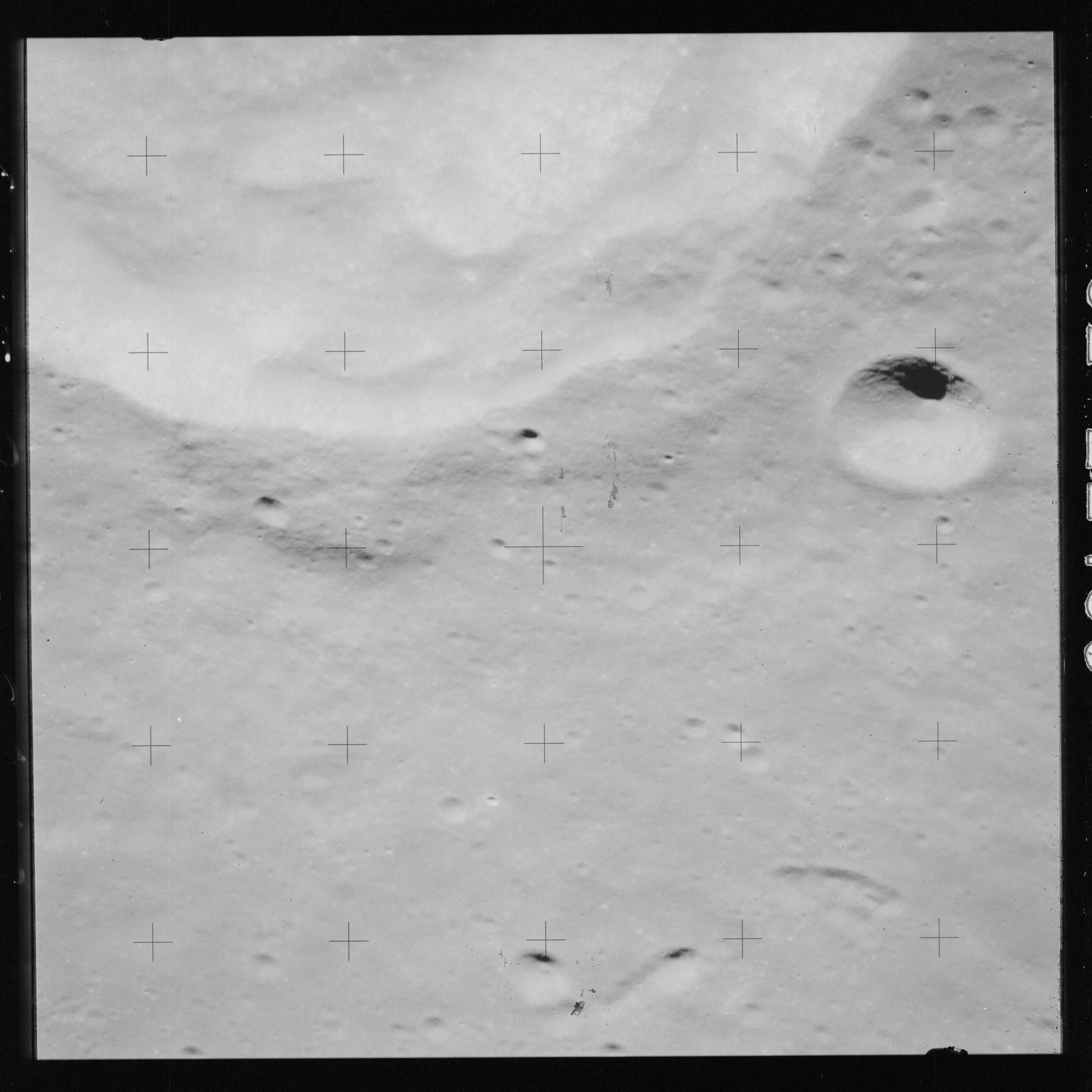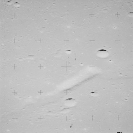 Taken slightly later on black and white magazine PP and using the wide-angle 60-mm lens are AS15-90-12317 and 12318. These also look northeast over the Mare with the Messier crater pair in the distance. The dirt on the camera's Réseau plate continues to mar its images.