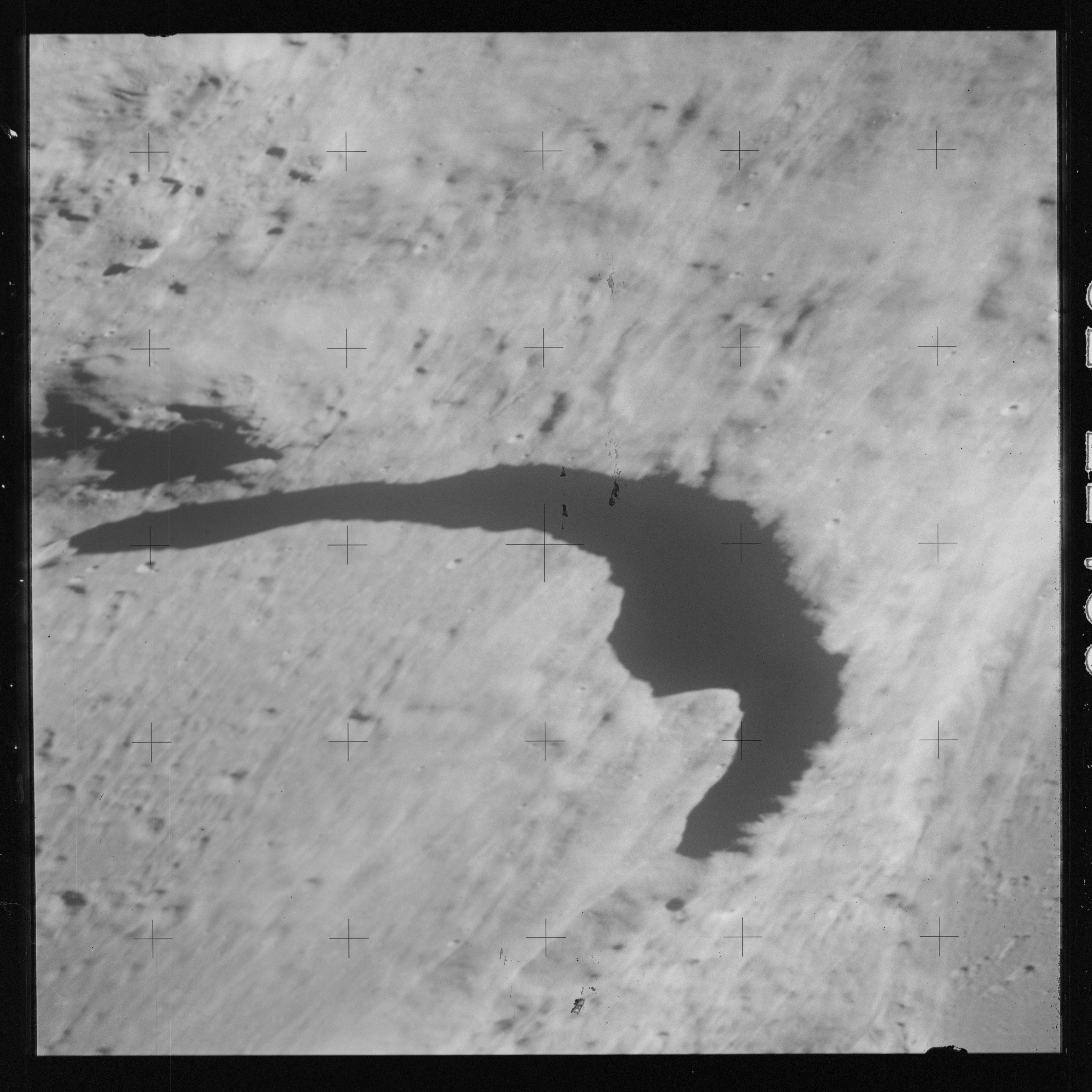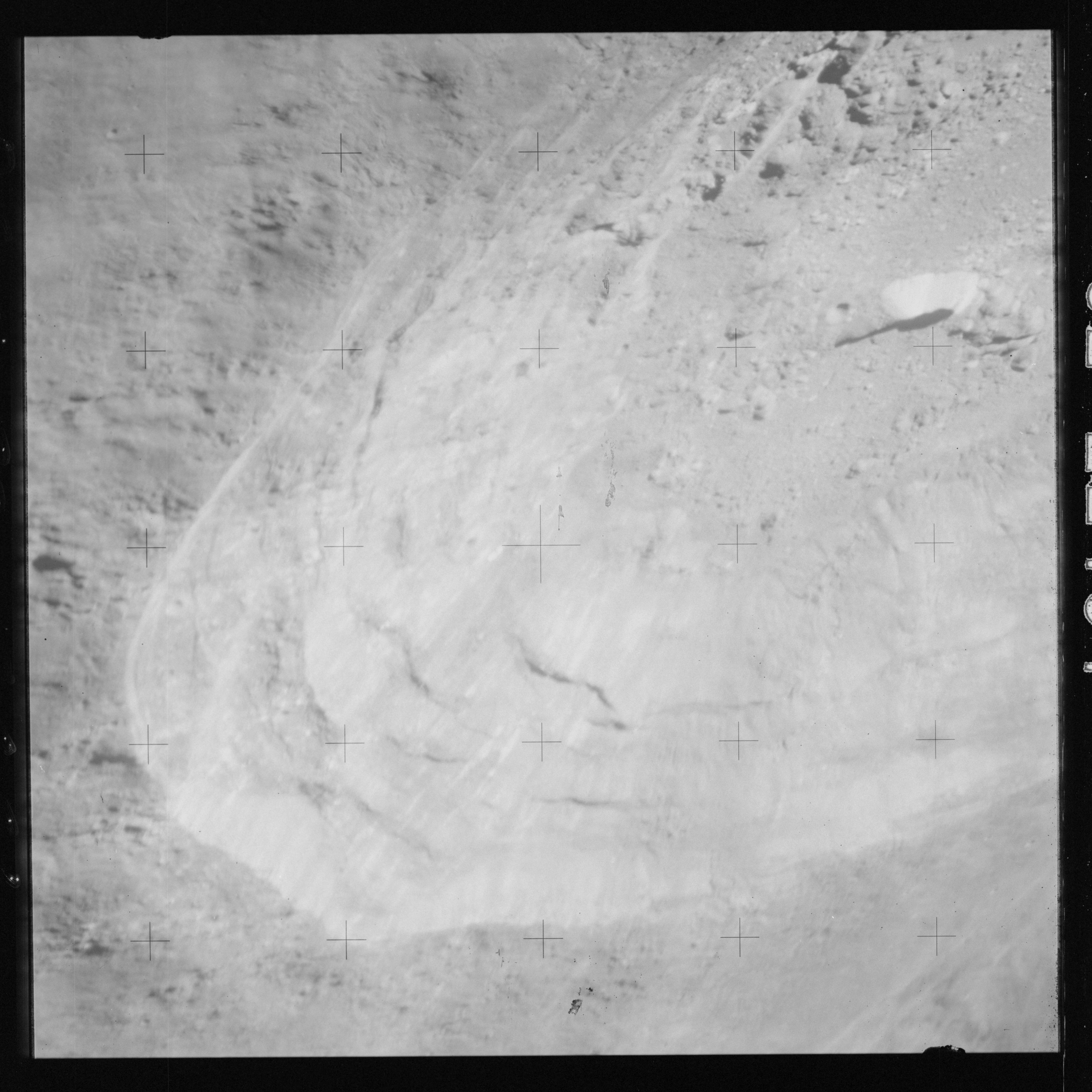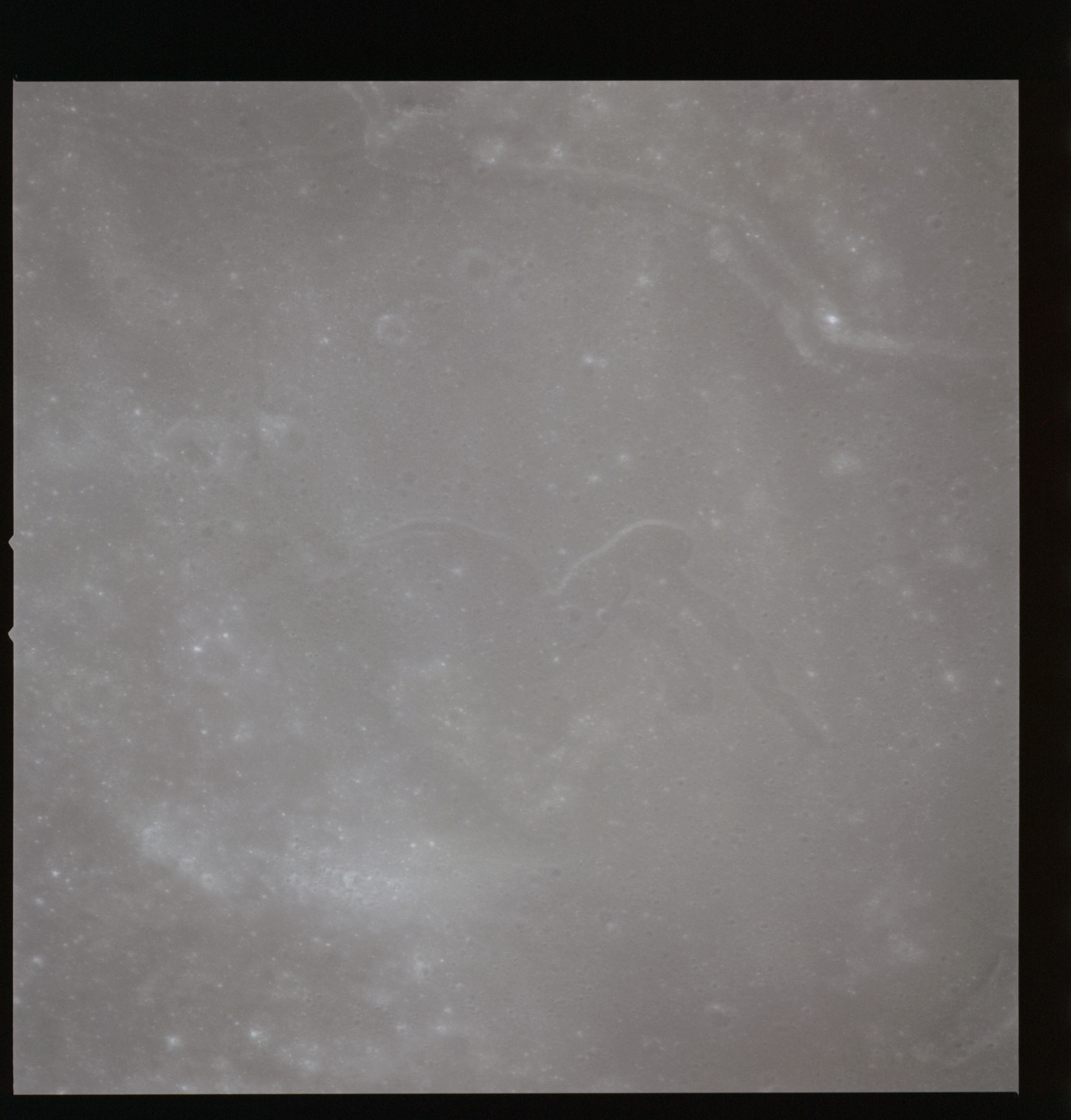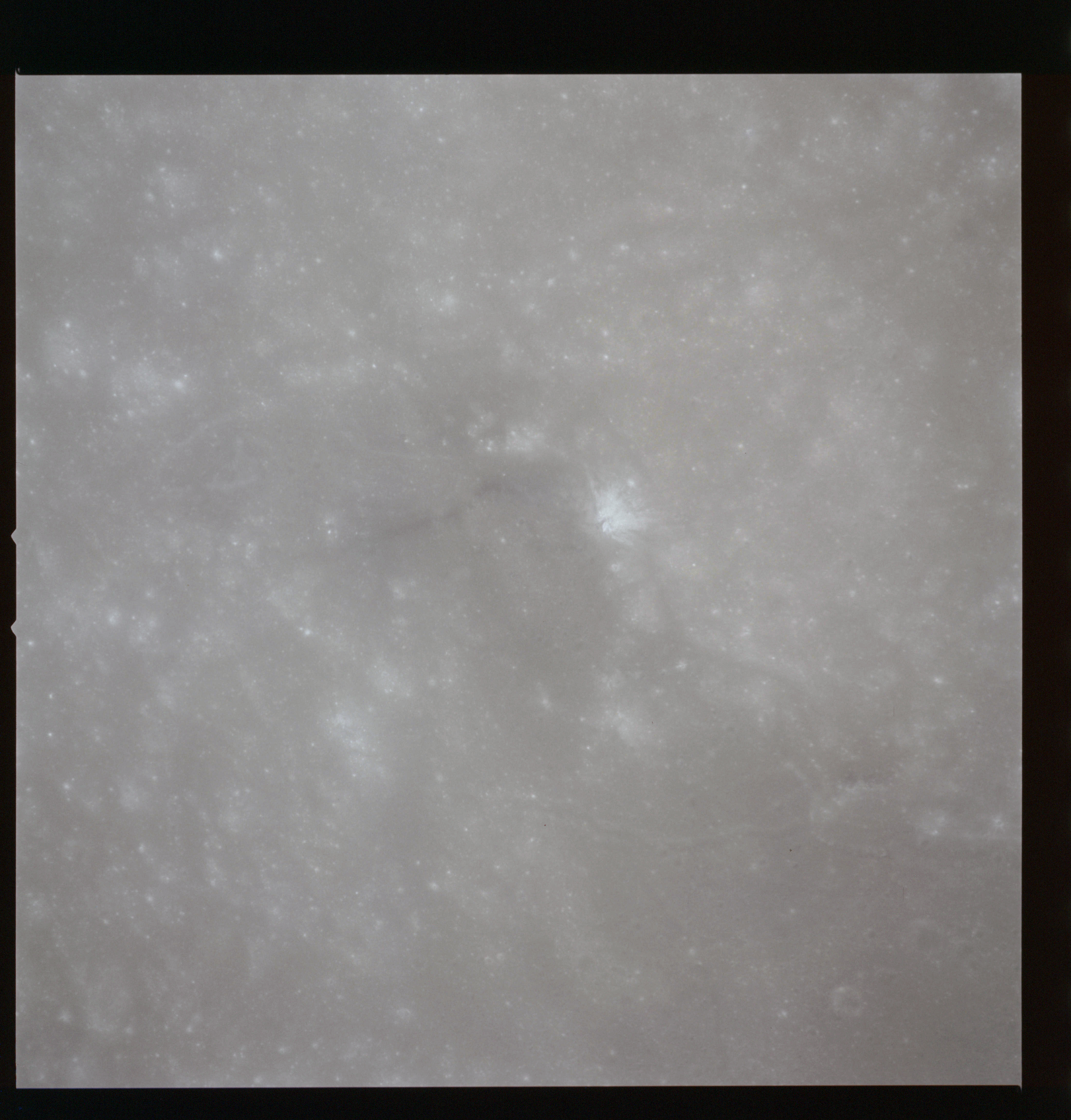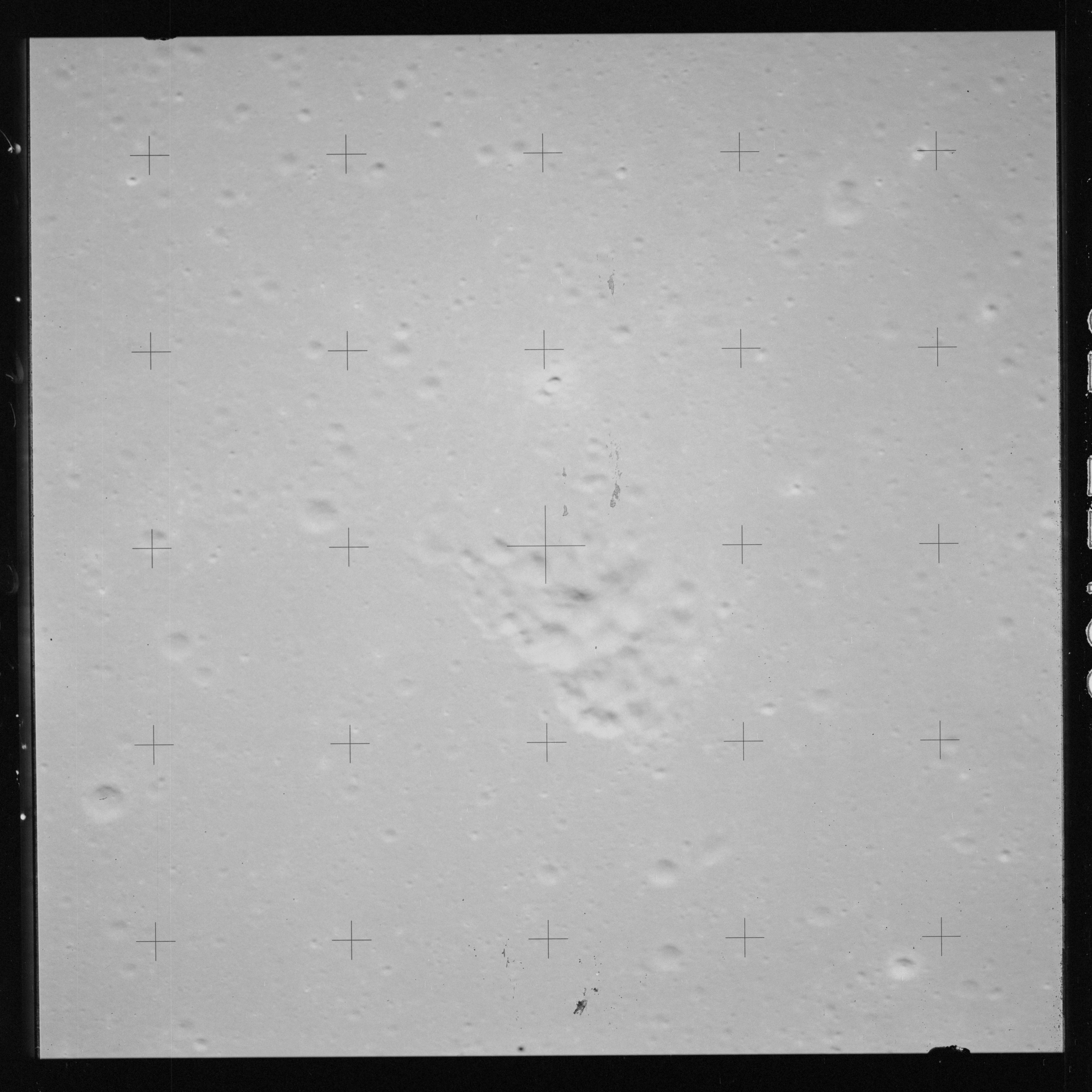 Taken slightly later on black and white magazine PP and using the wide-angle 60-mm lens are AS15-90-12317 and 12318. These also look northeast over the Mare with the Messier crater pair in the distance. The dirt on the camera's Réseau plate continues to mar its images.