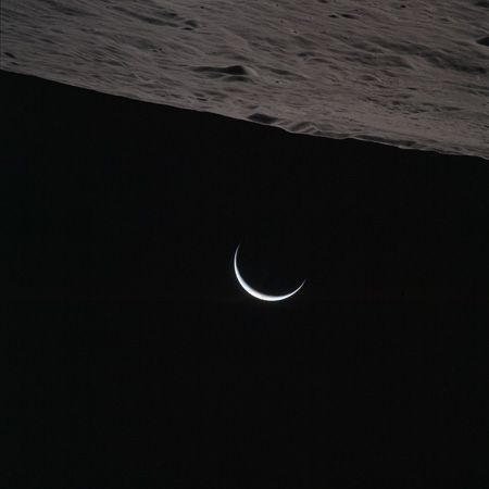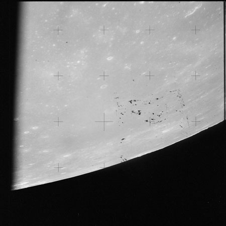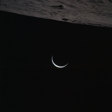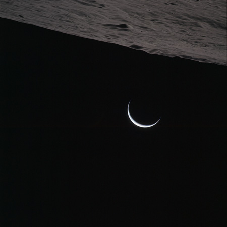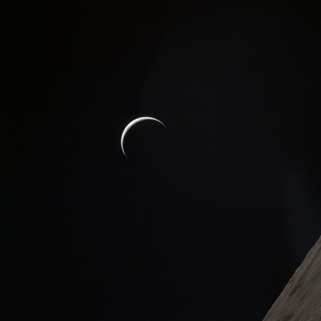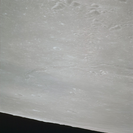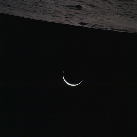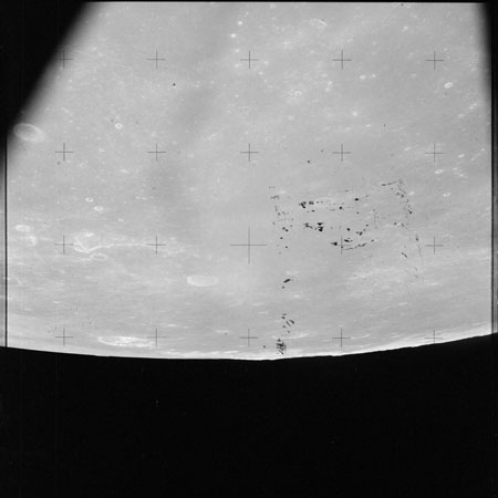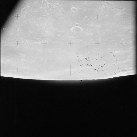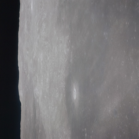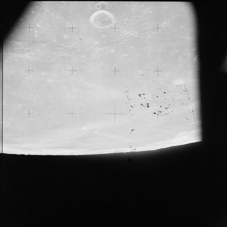 As Endeavour comes around the near side, Al is busy with a Hasselblad fitted with the 250mm lens. He takes a photograph on magazine O of Curie, a 139-km, highly degraded crater, followed by eight Earthrise images.