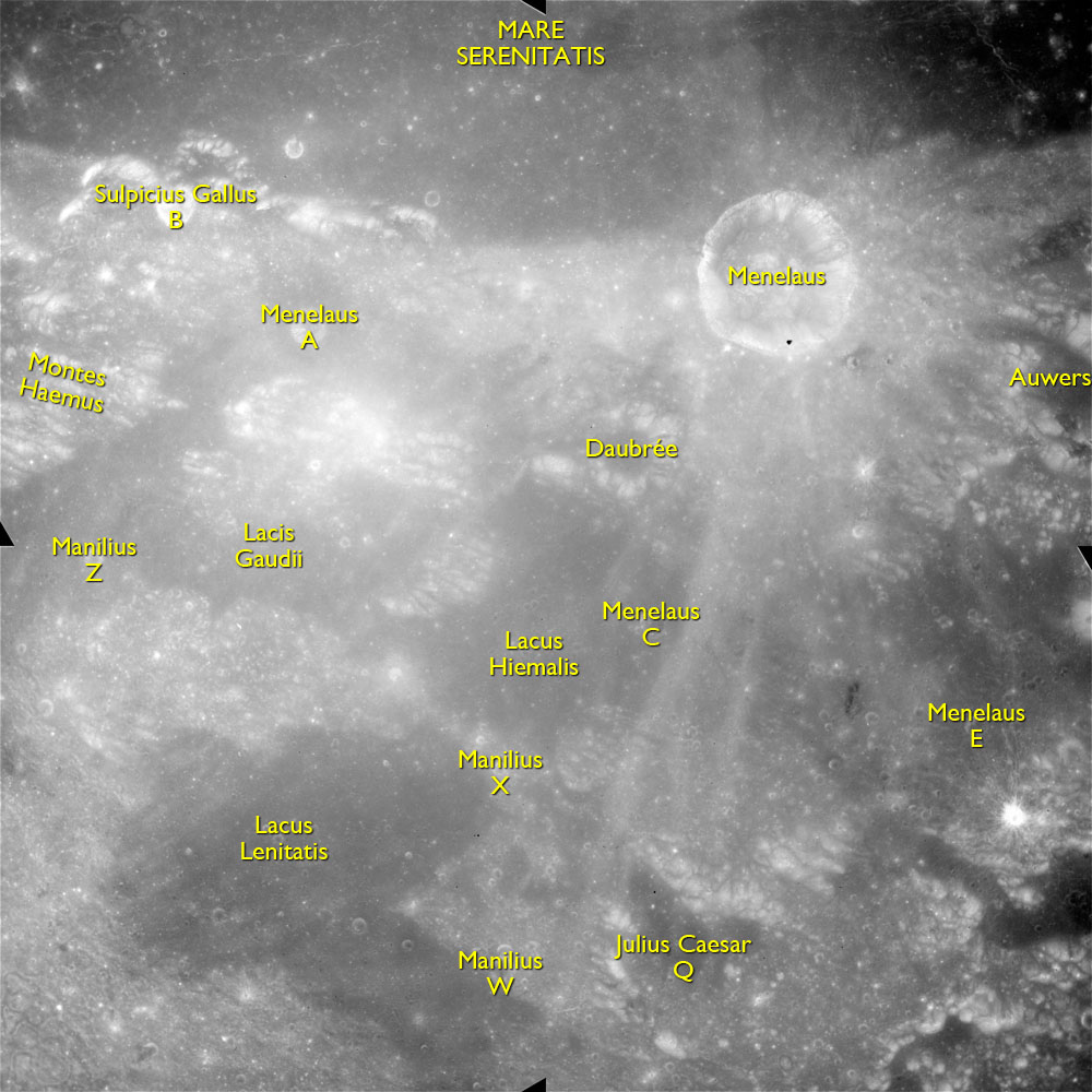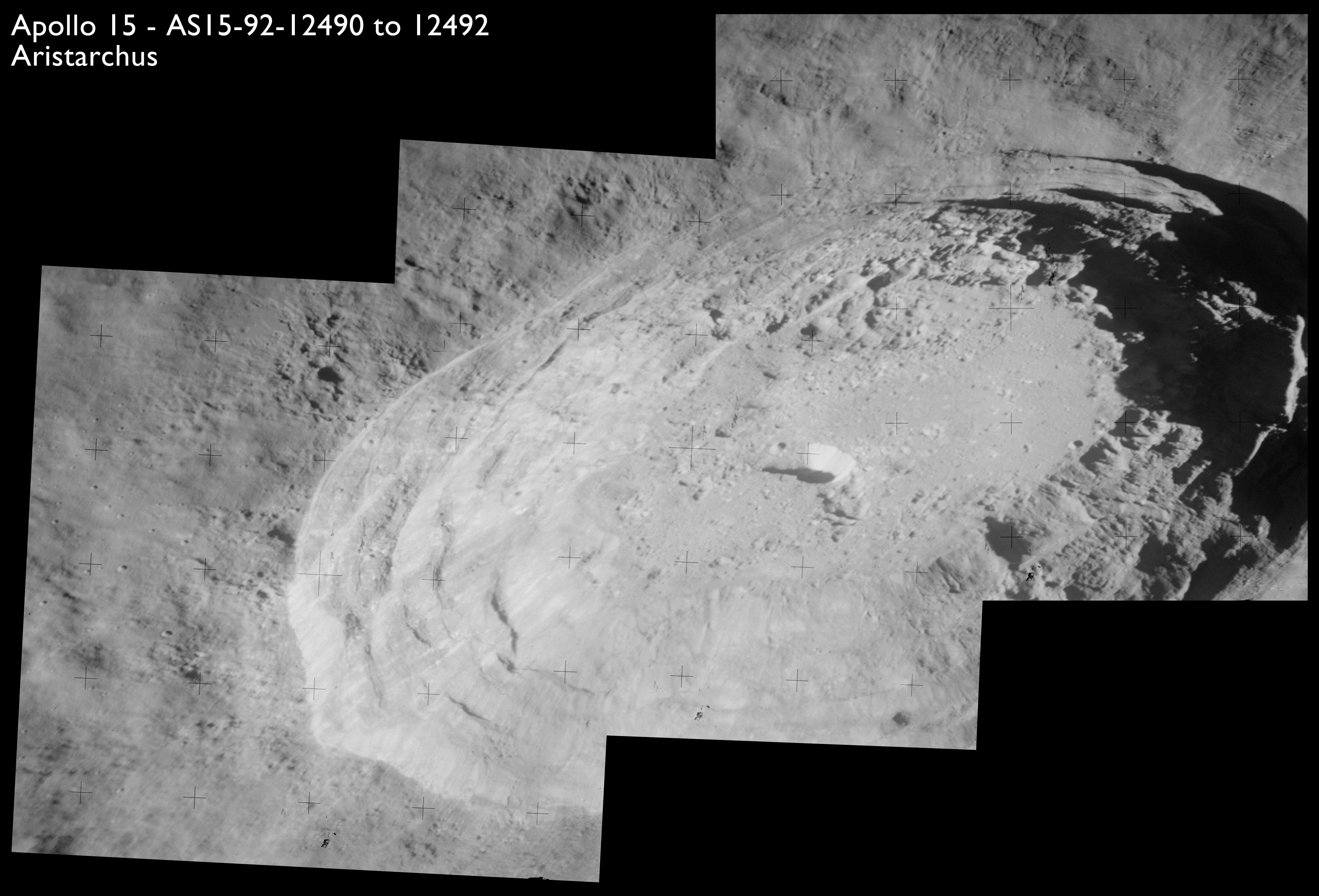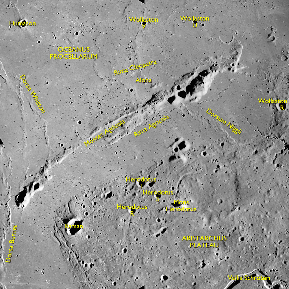 AS15-M-2484 - Metric Camera image of Montes Agricola and the northwestern region of the Aristarchus Plateau. Image taken at about 215:16. (250 megapixel version), (labelled version) - Image by NASA/ASU.