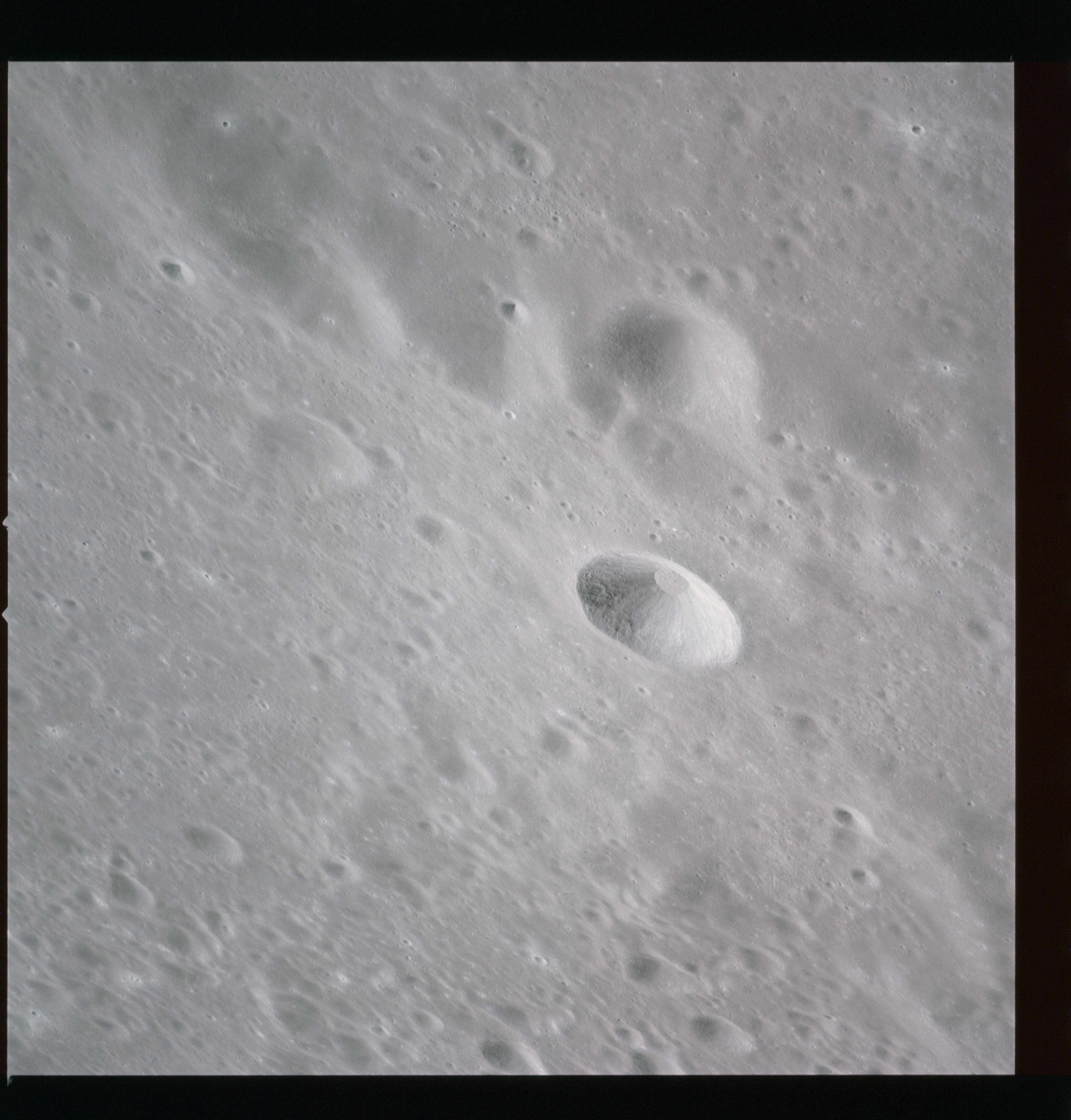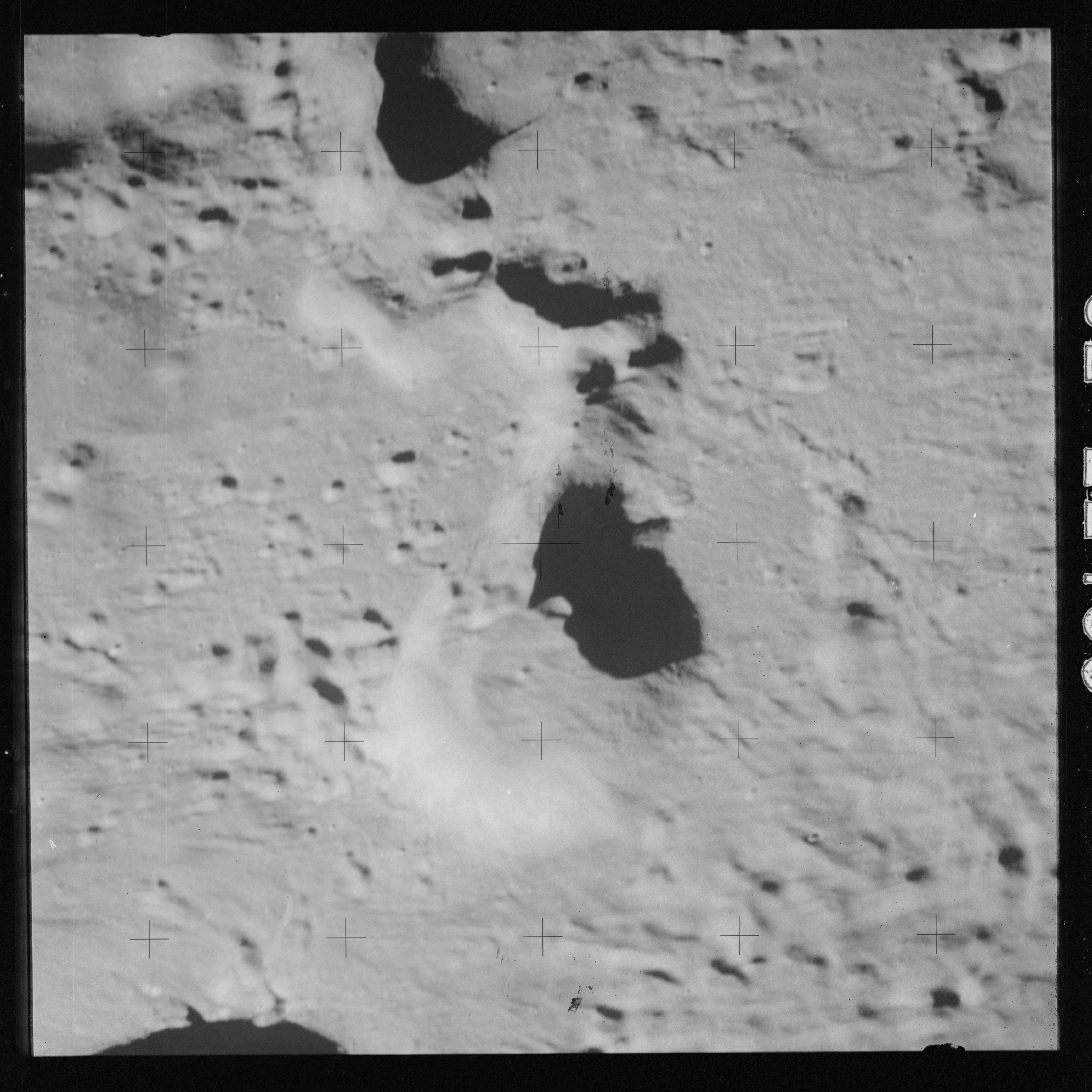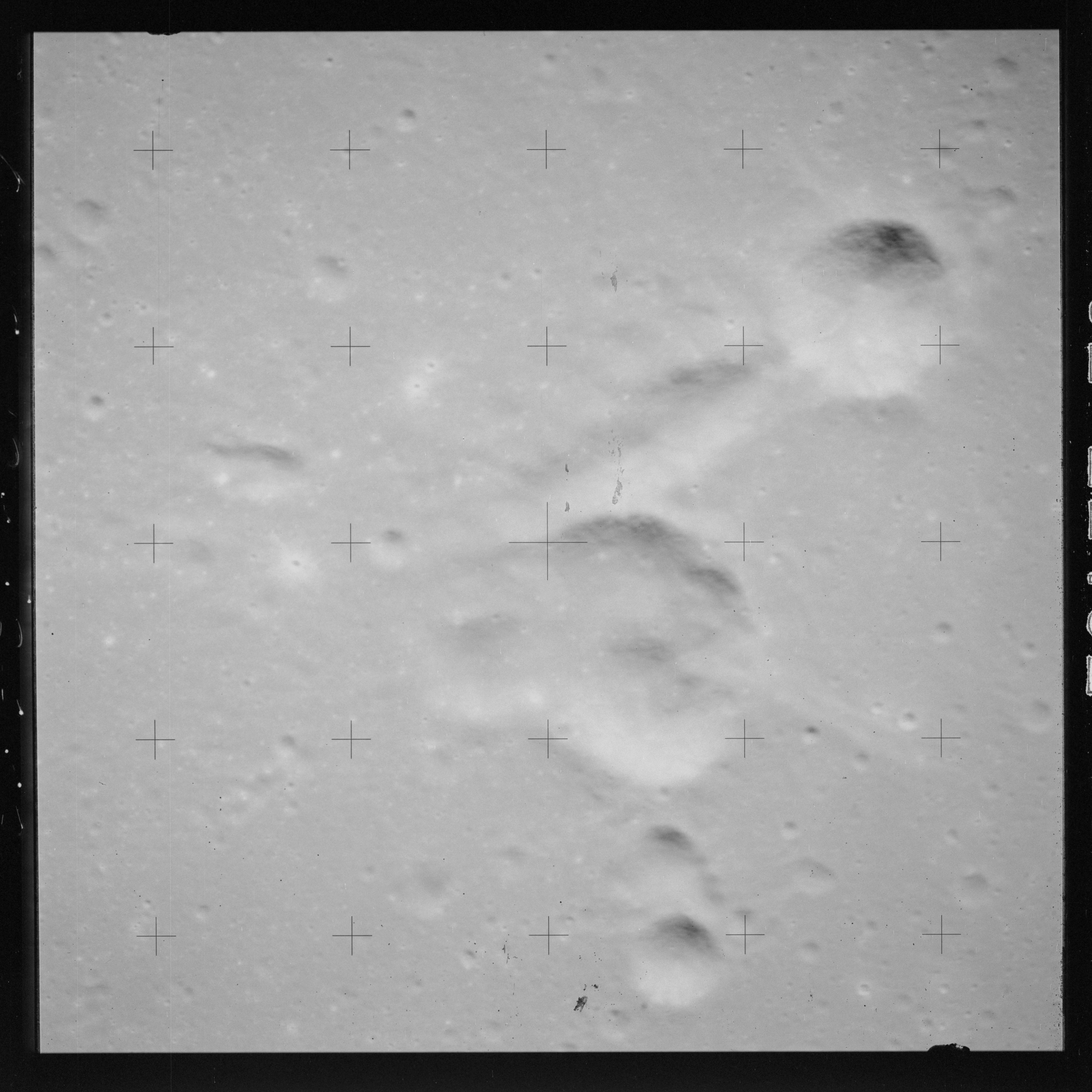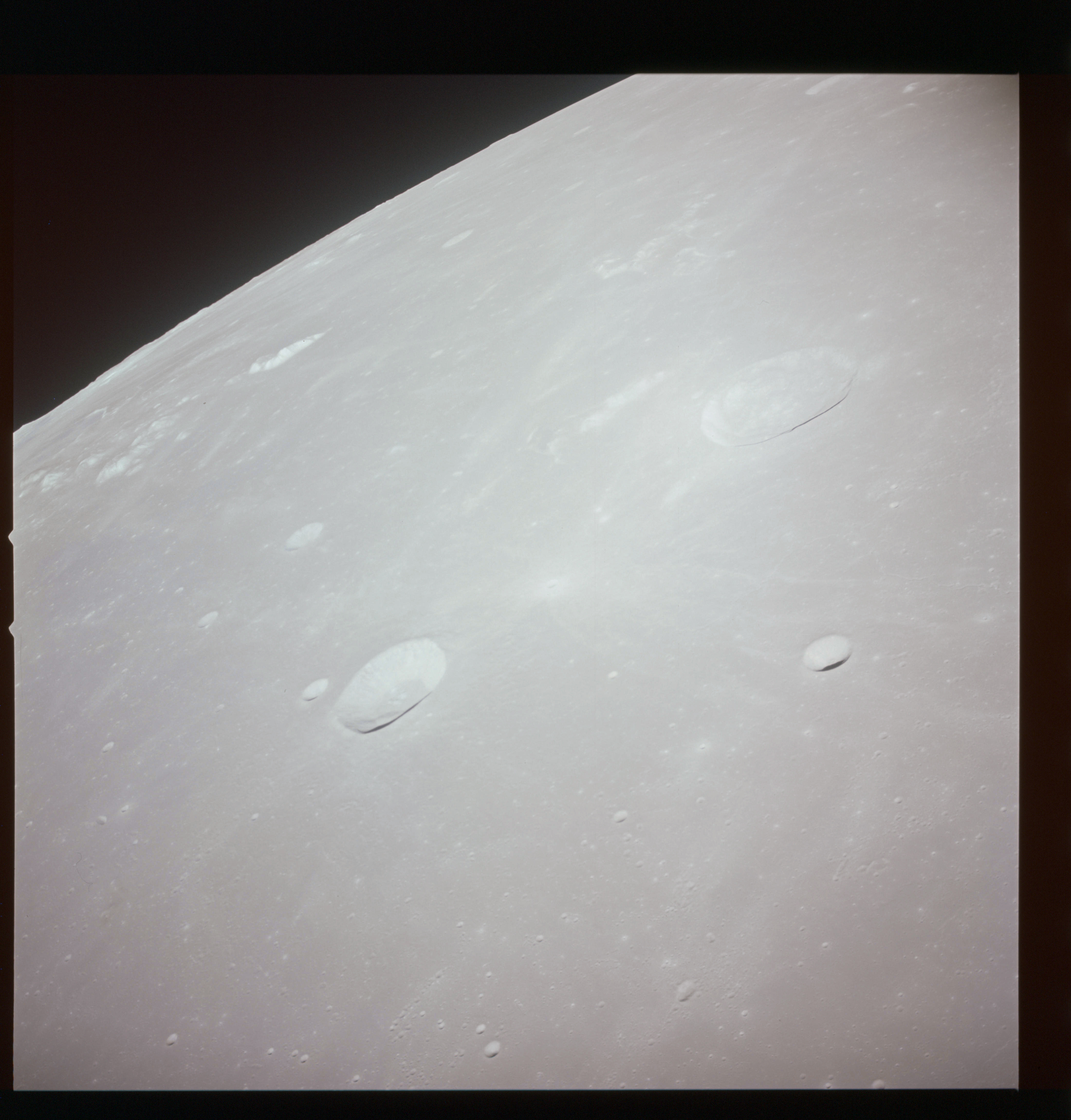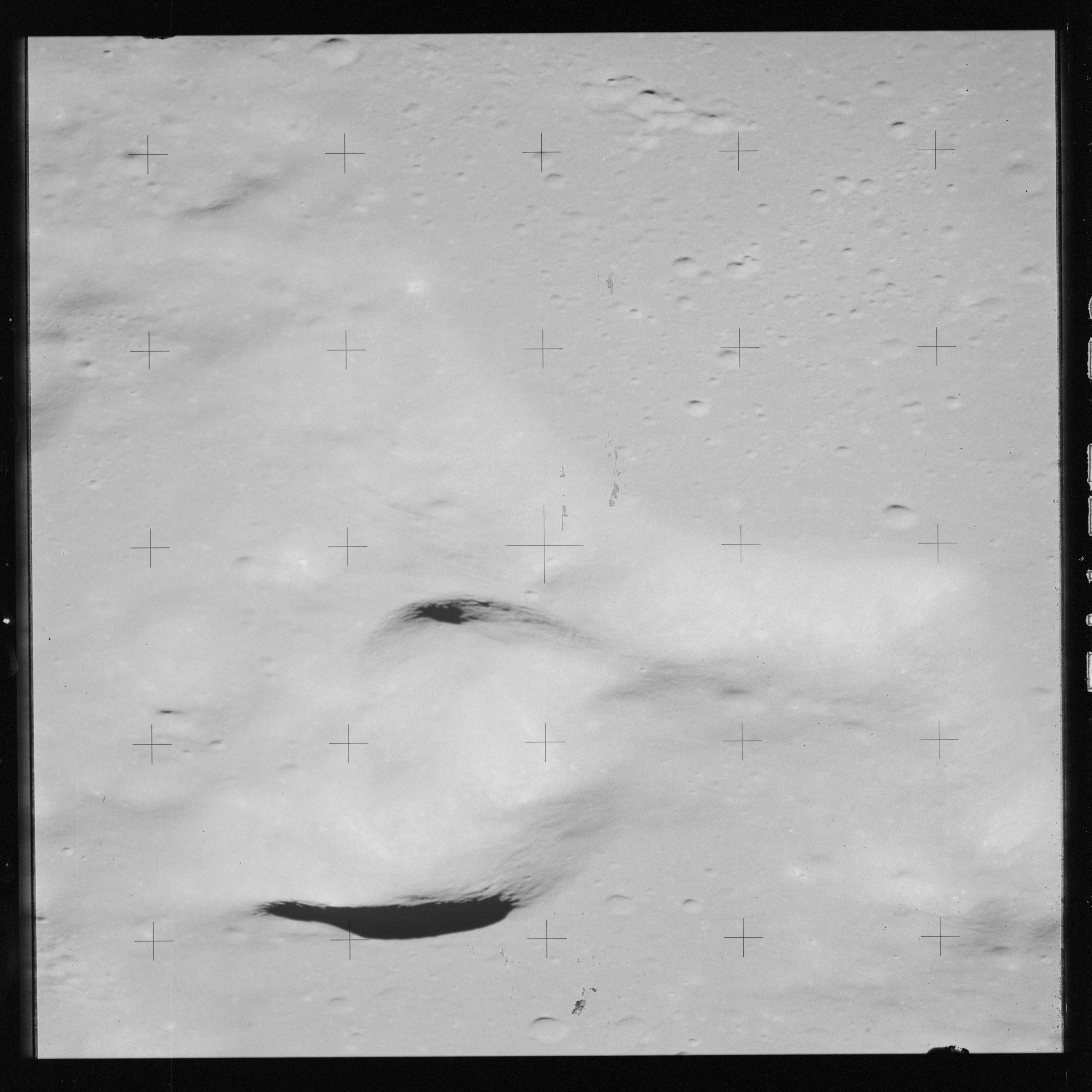 Continuing the photography on magazine O, and looking further north, AS15-97-13278 shows two irregular craters, believed to be unnamed.