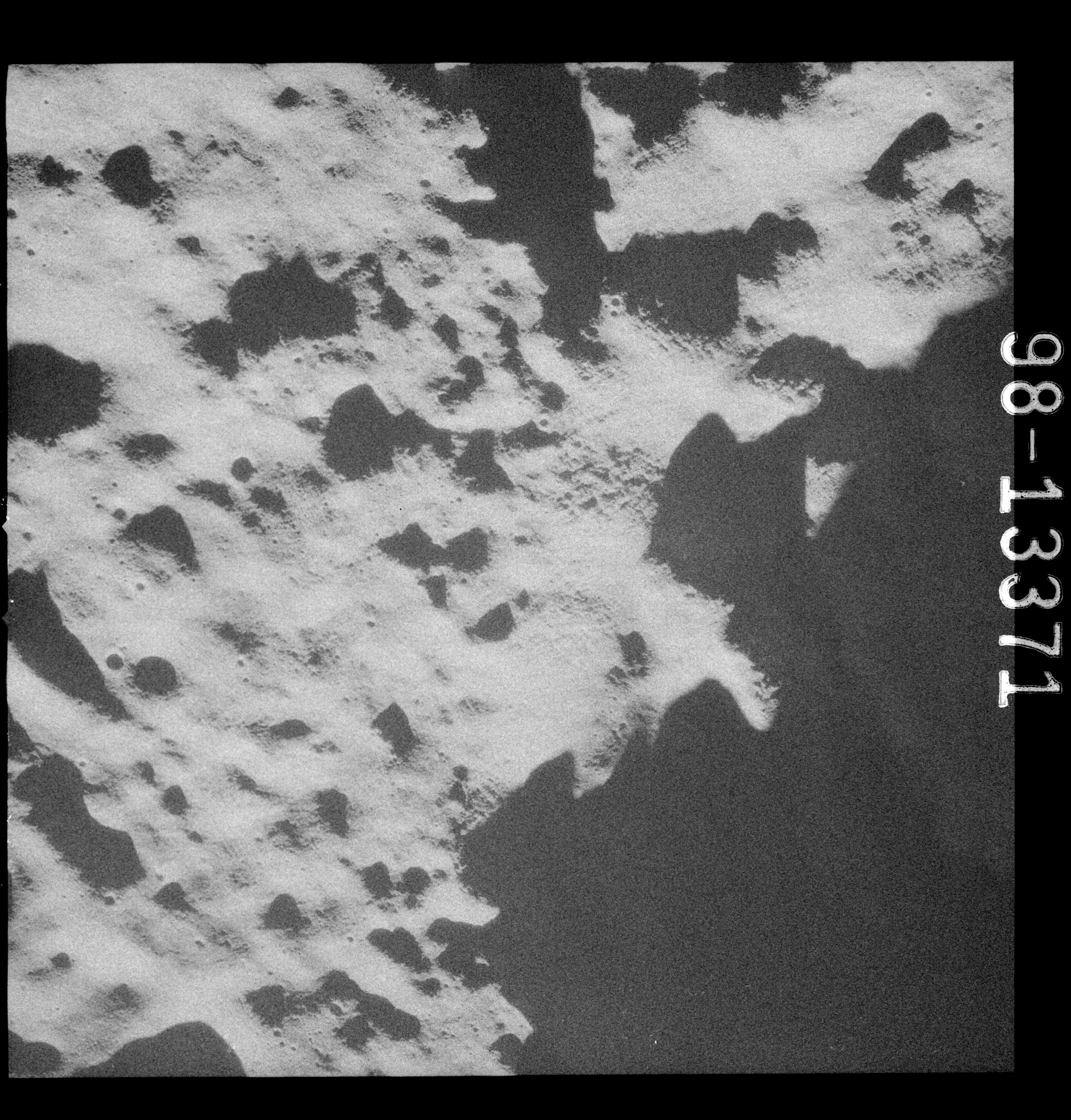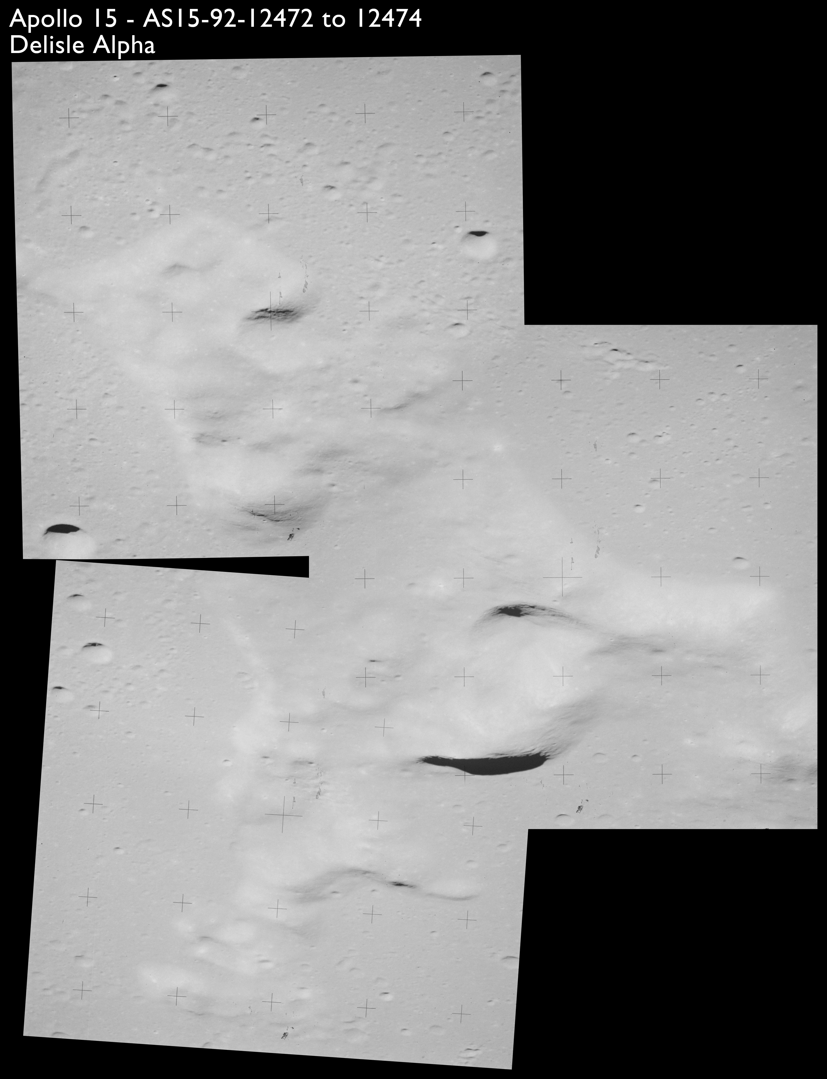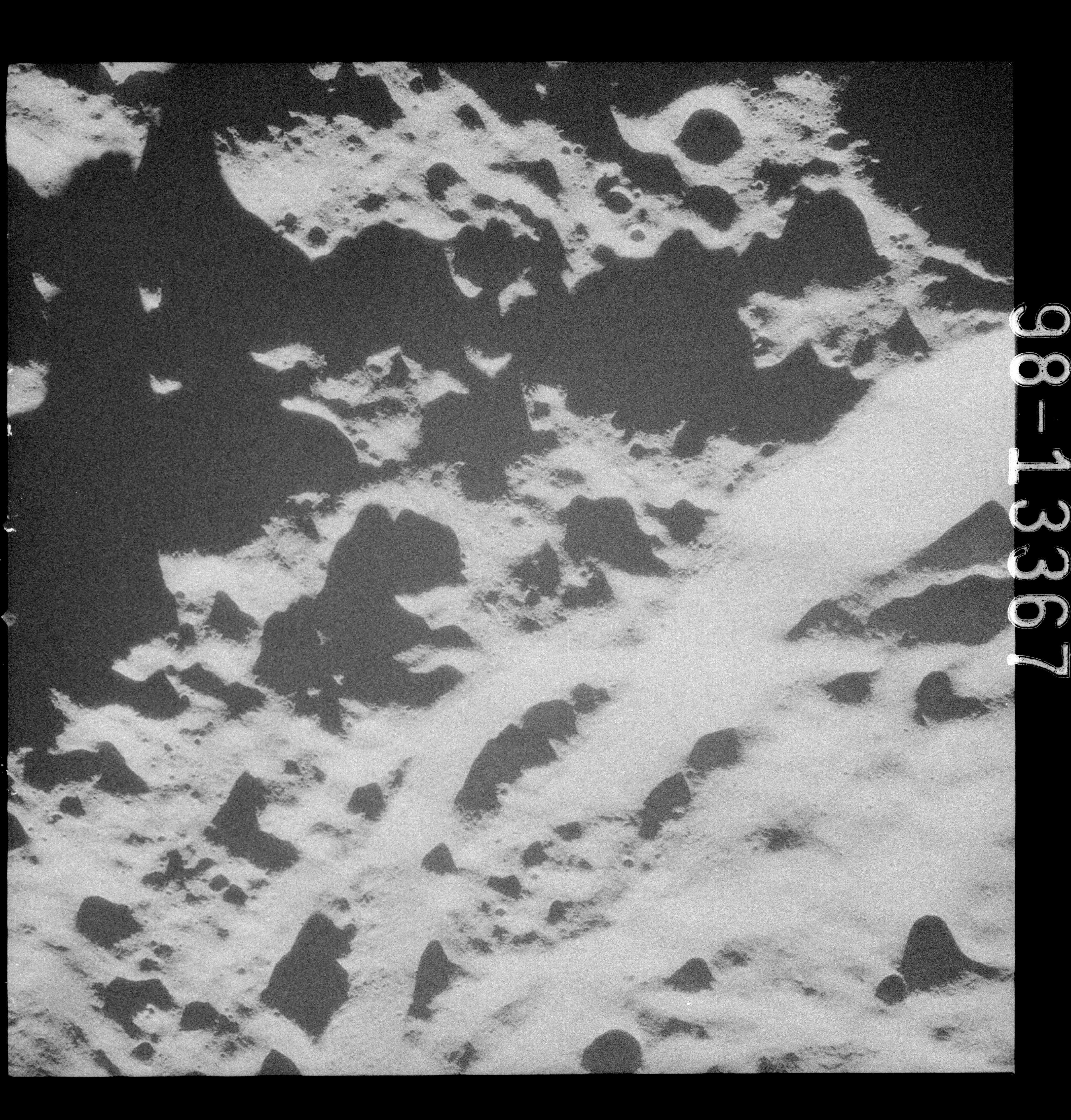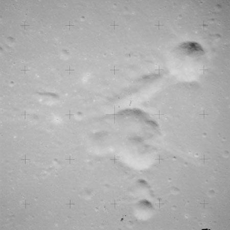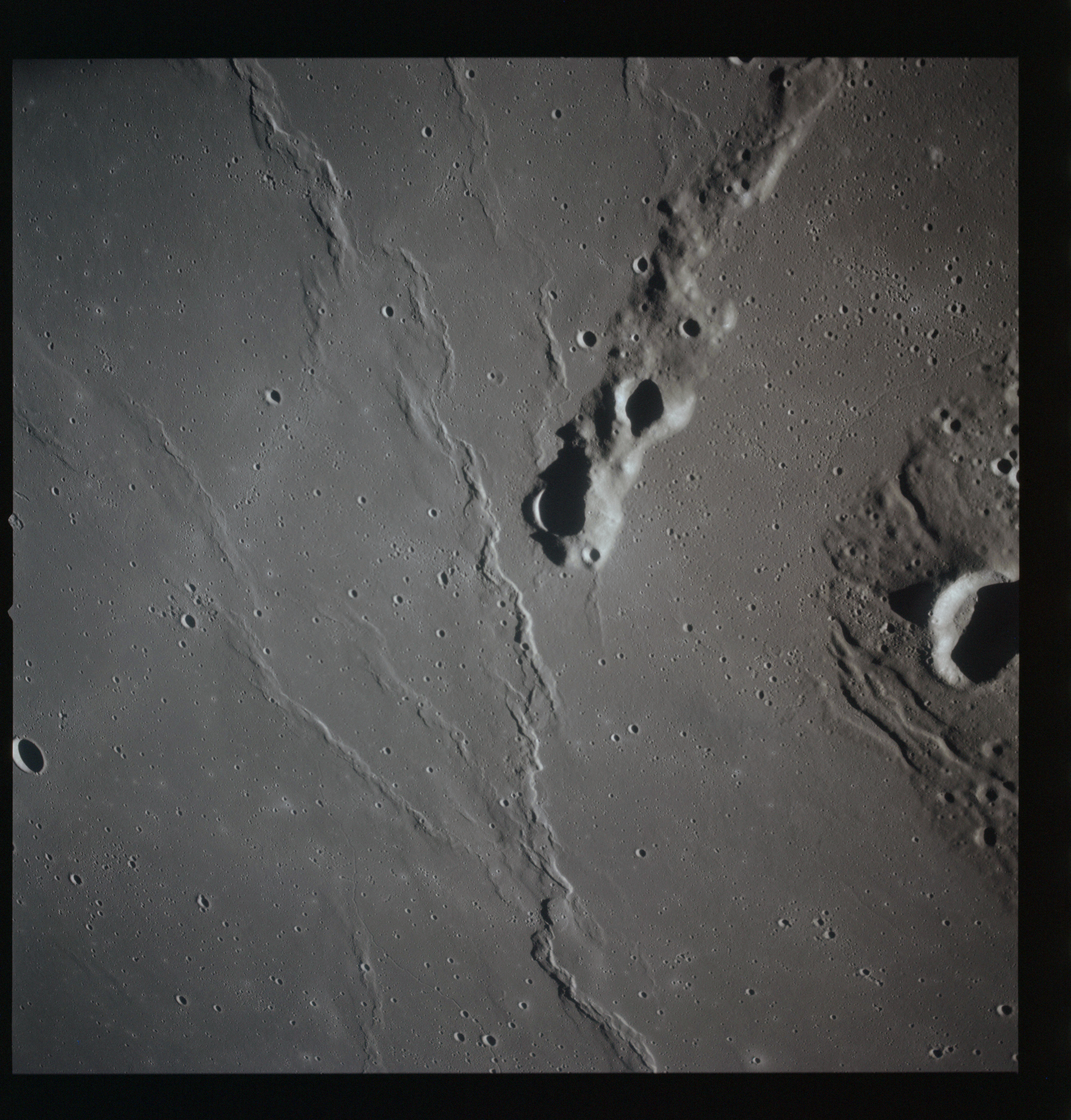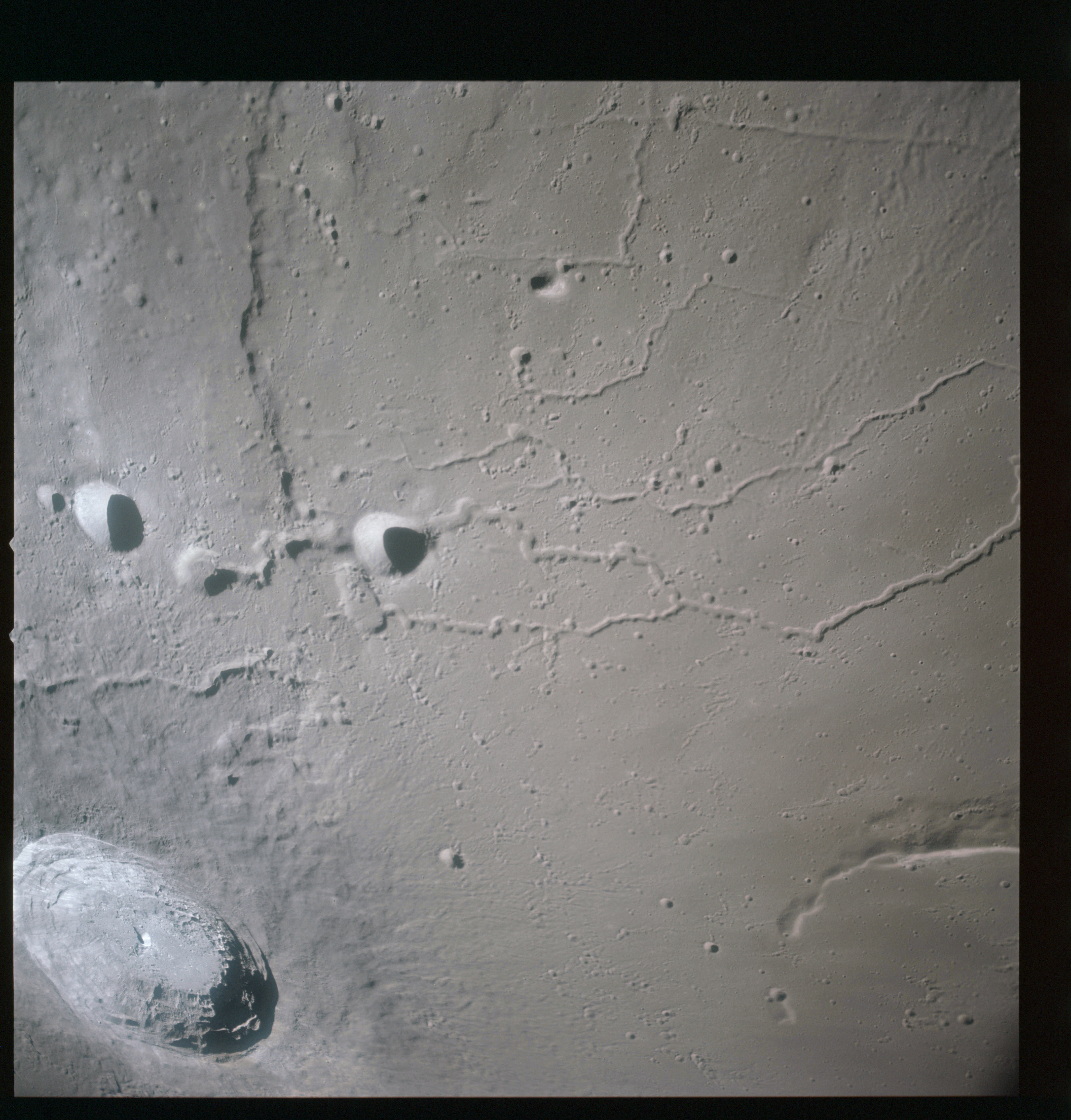 Continuing the photography on magazine O, and looking further north, AS15-97-13278 shows two irregular craters, believed to be unnamed.