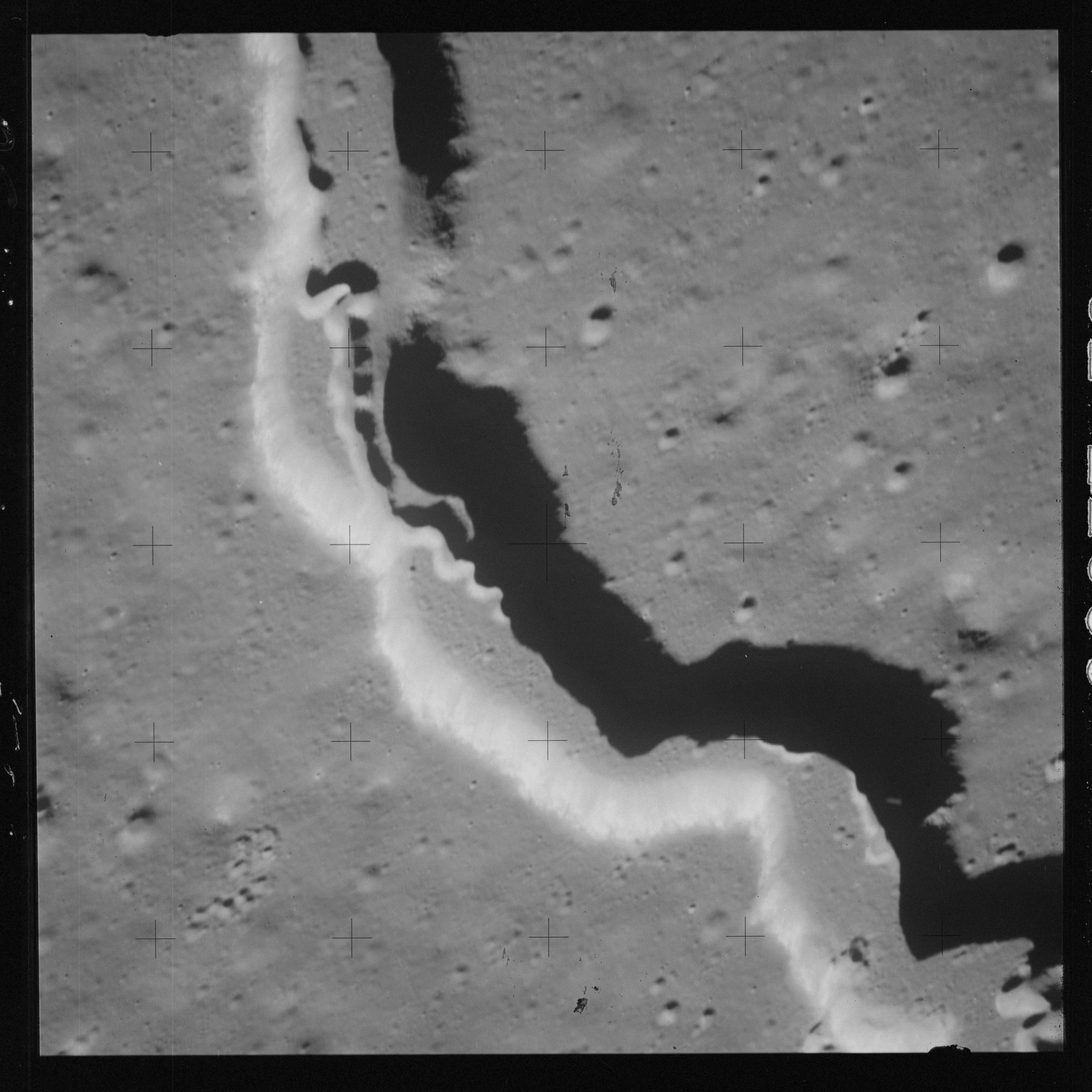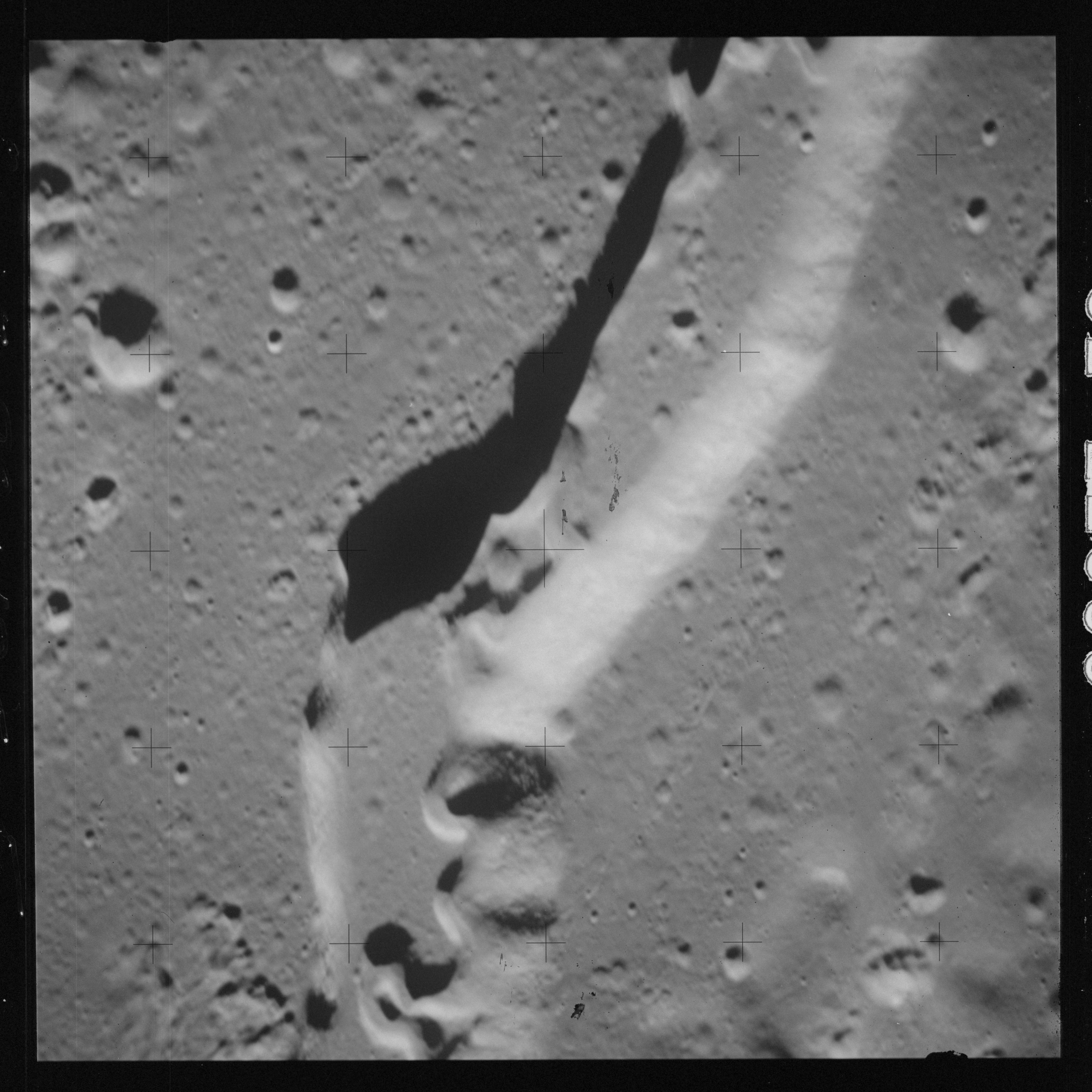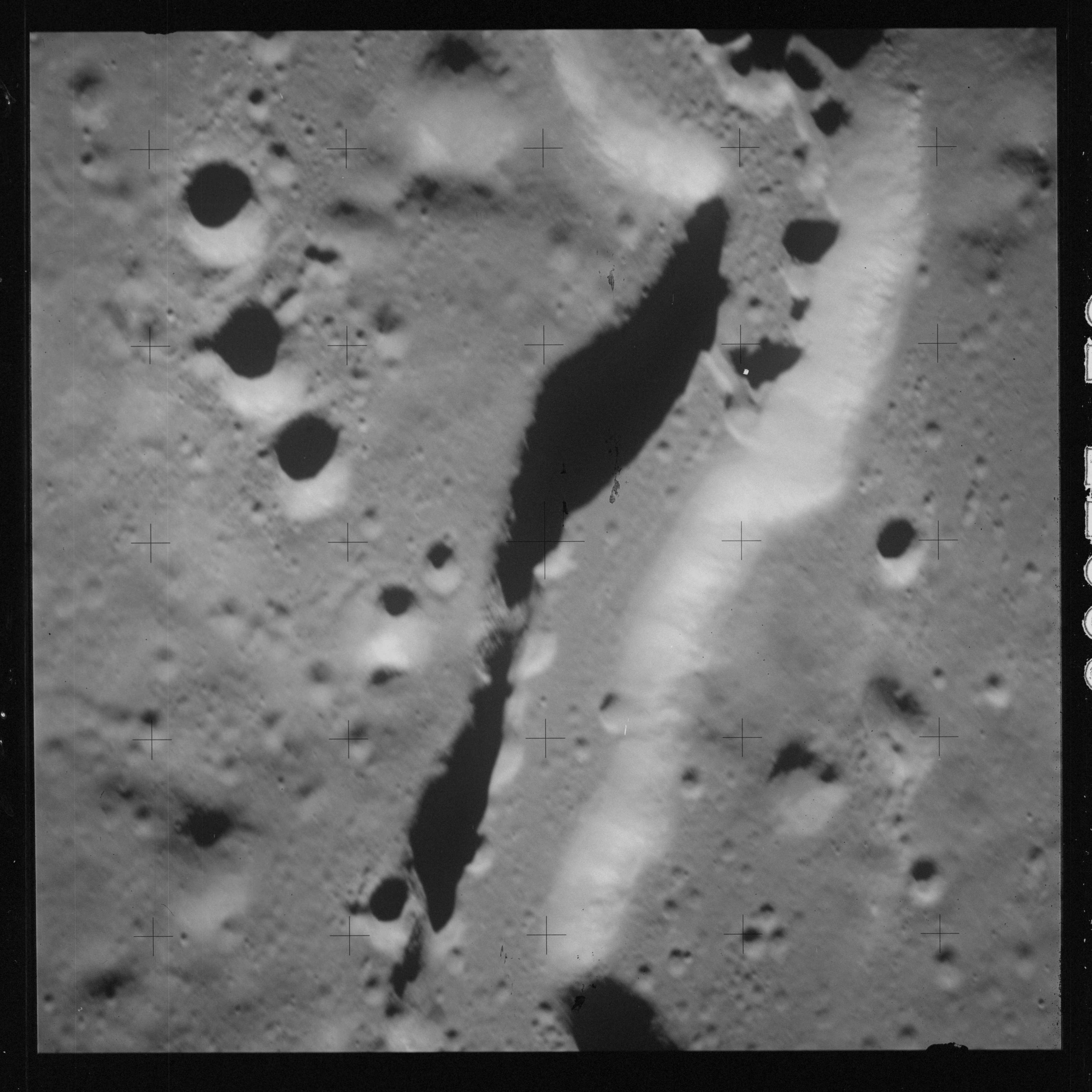 The 500-mm lens is being used with magazine OO to capture the detail of Vallis Schröteri along its length in two series of consecutive black and white images. The first series comprises AS15-92-12495 to 12502.