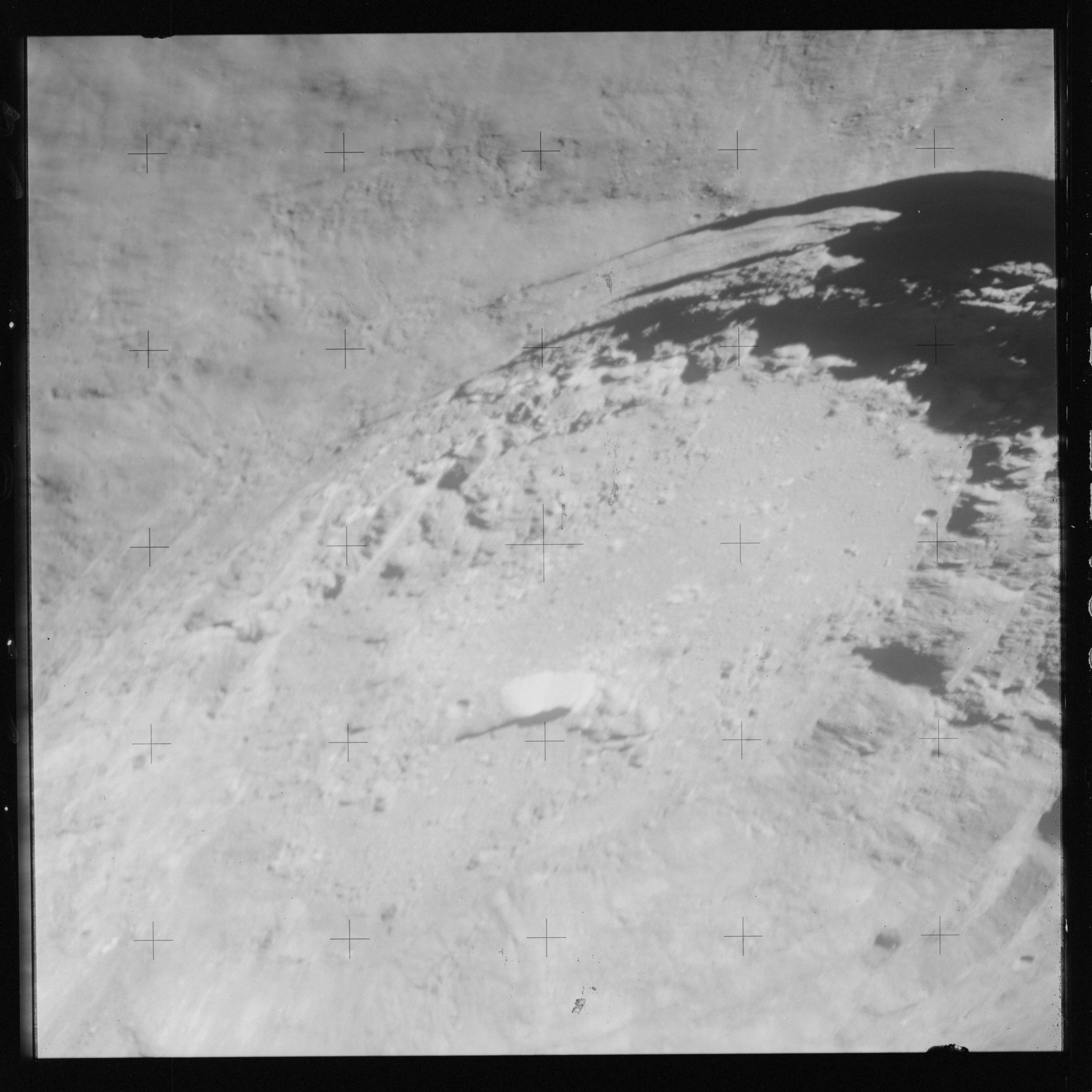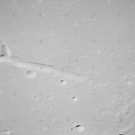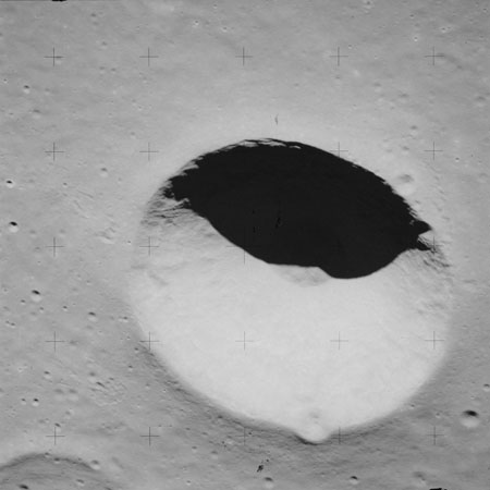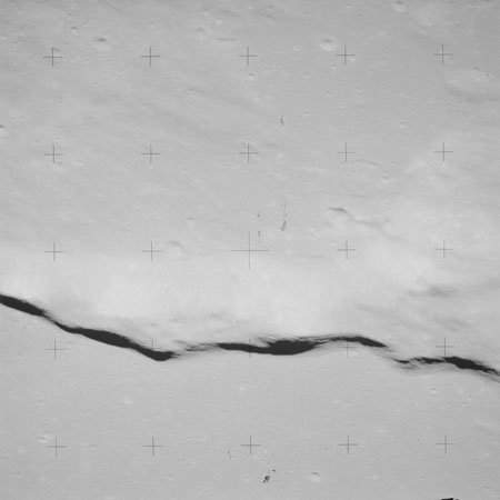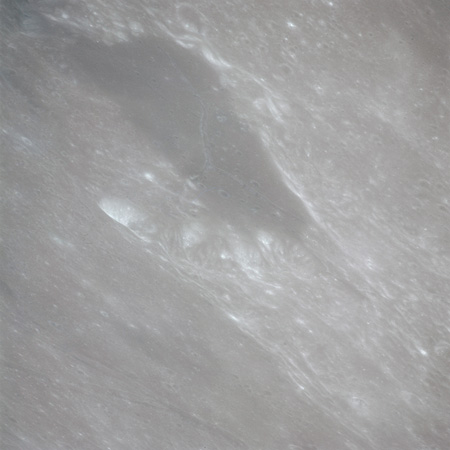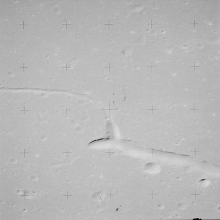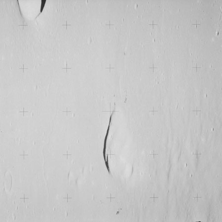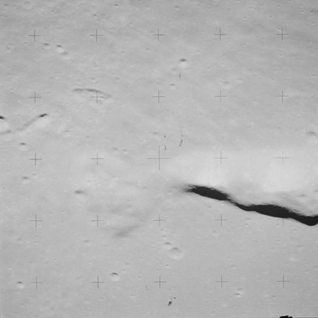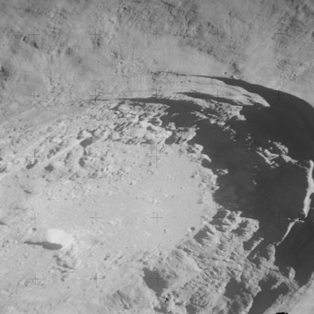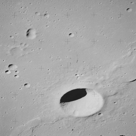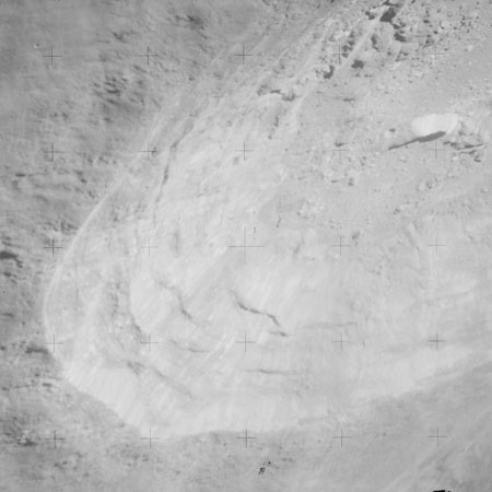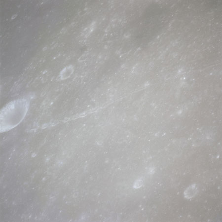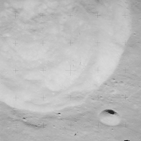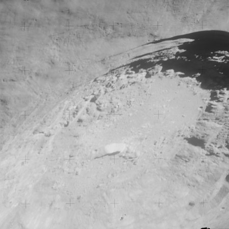 At around the same time, nine images are taken of Scaliger and the landscape near the rim of this 84-km crater in the extremely low-angle lighting near the terminator. These photographs use magazine R which is loaded with film type 2485, very high speed black and white film with a speed rating of 6000 (ASA or ISO). The images are AS15-98-13365 to 13373.