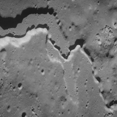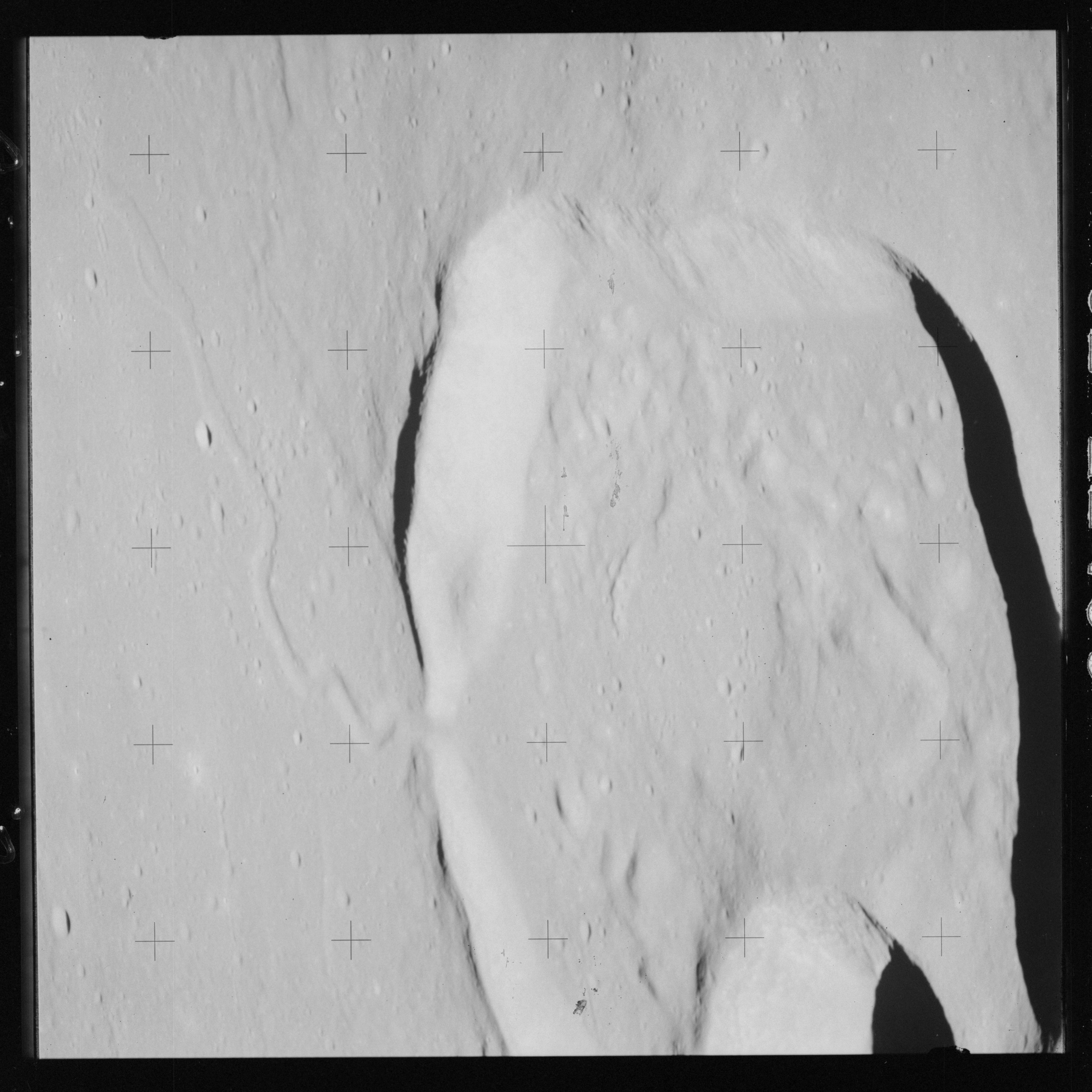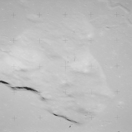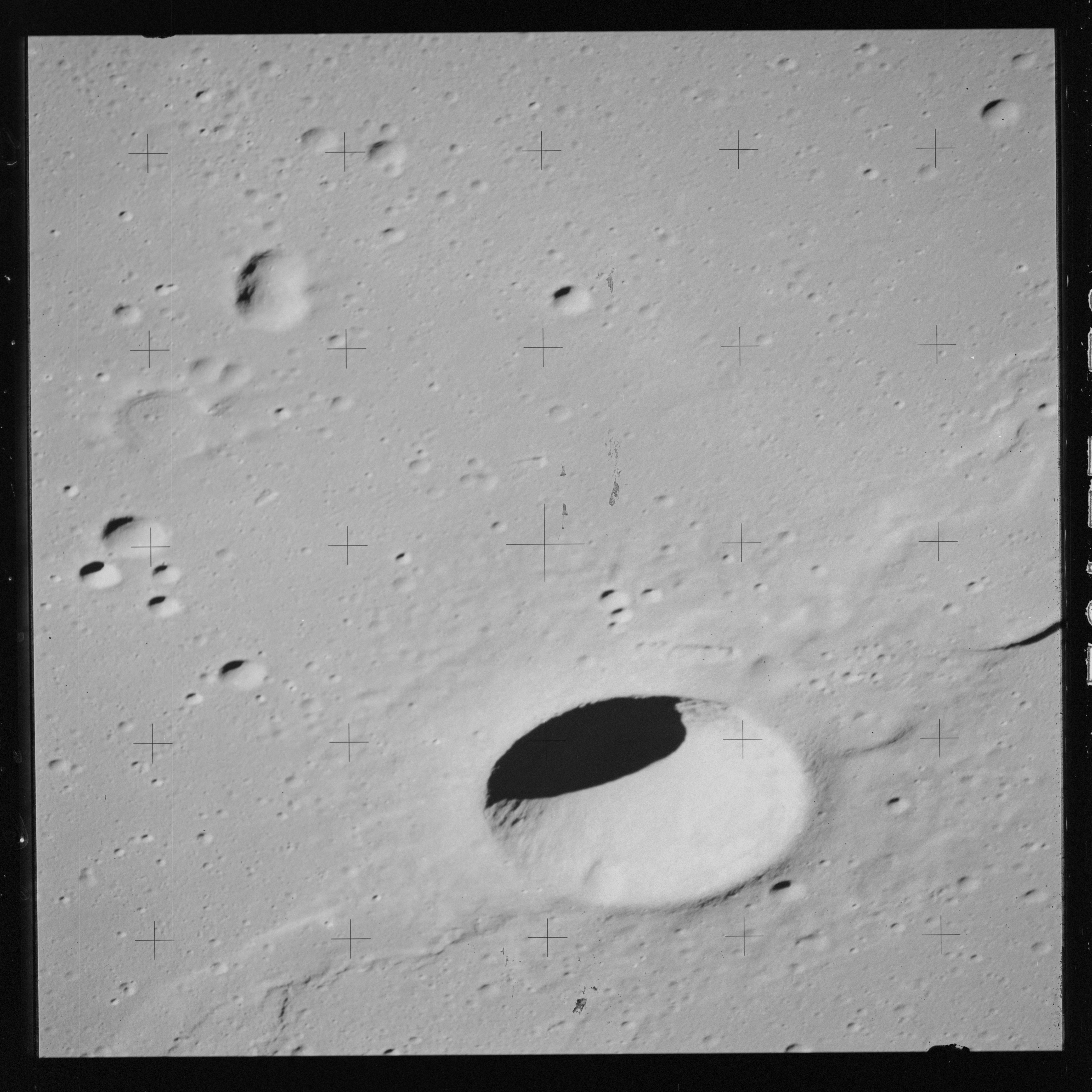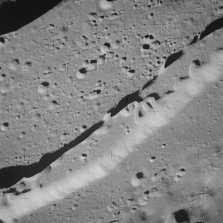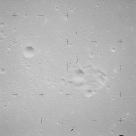 At around the same time, nine images are taken of Scaliger and the landscape near the rim of this 84-km crater in the extremely low-angle lighting near the terminator. These photographs use magazine R which is loaded with film type 2485, very high speed black and white film with a speed rating of 6000 (ASA or ISO). The images are AS15-98-13365 to 13373.