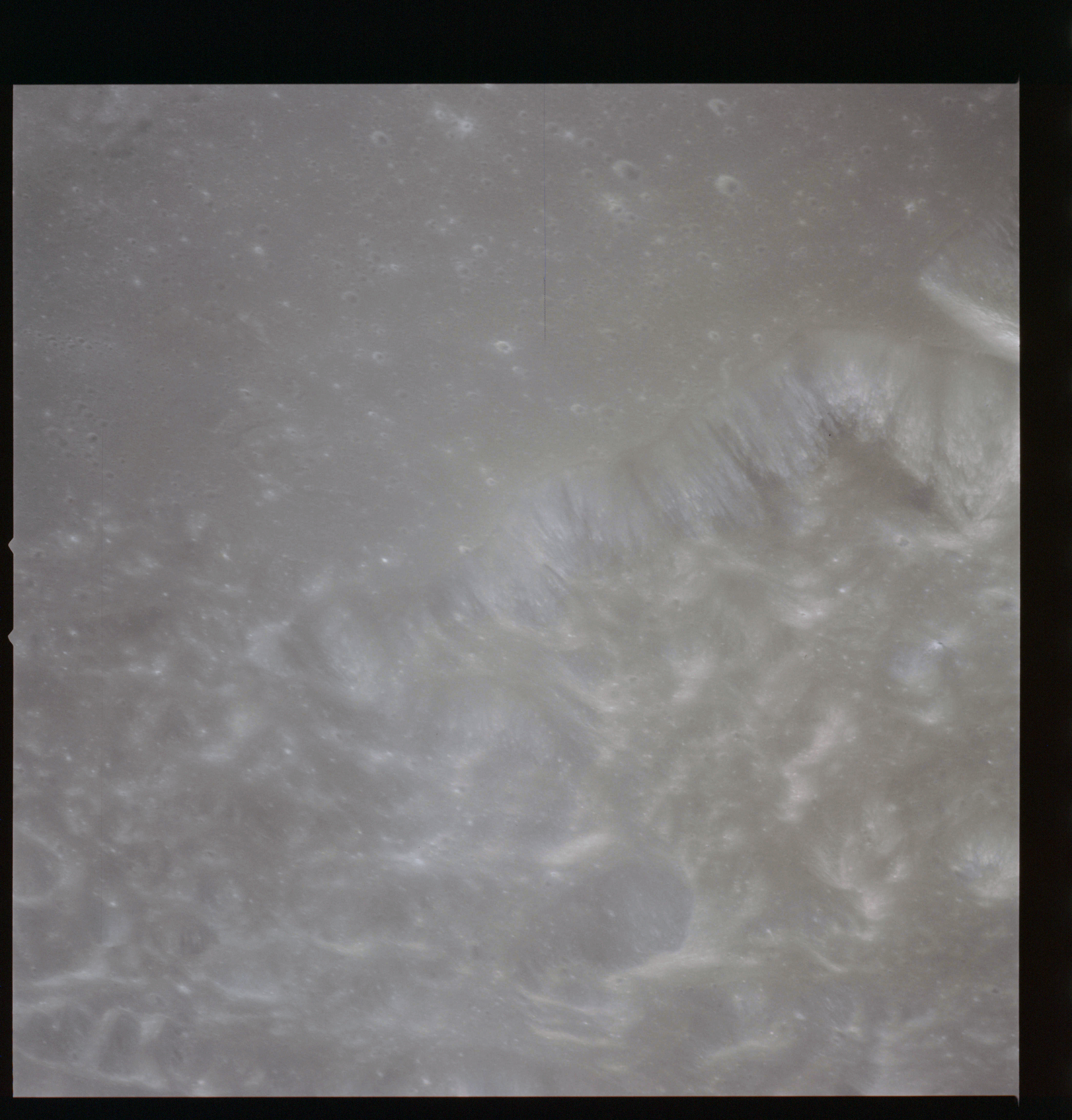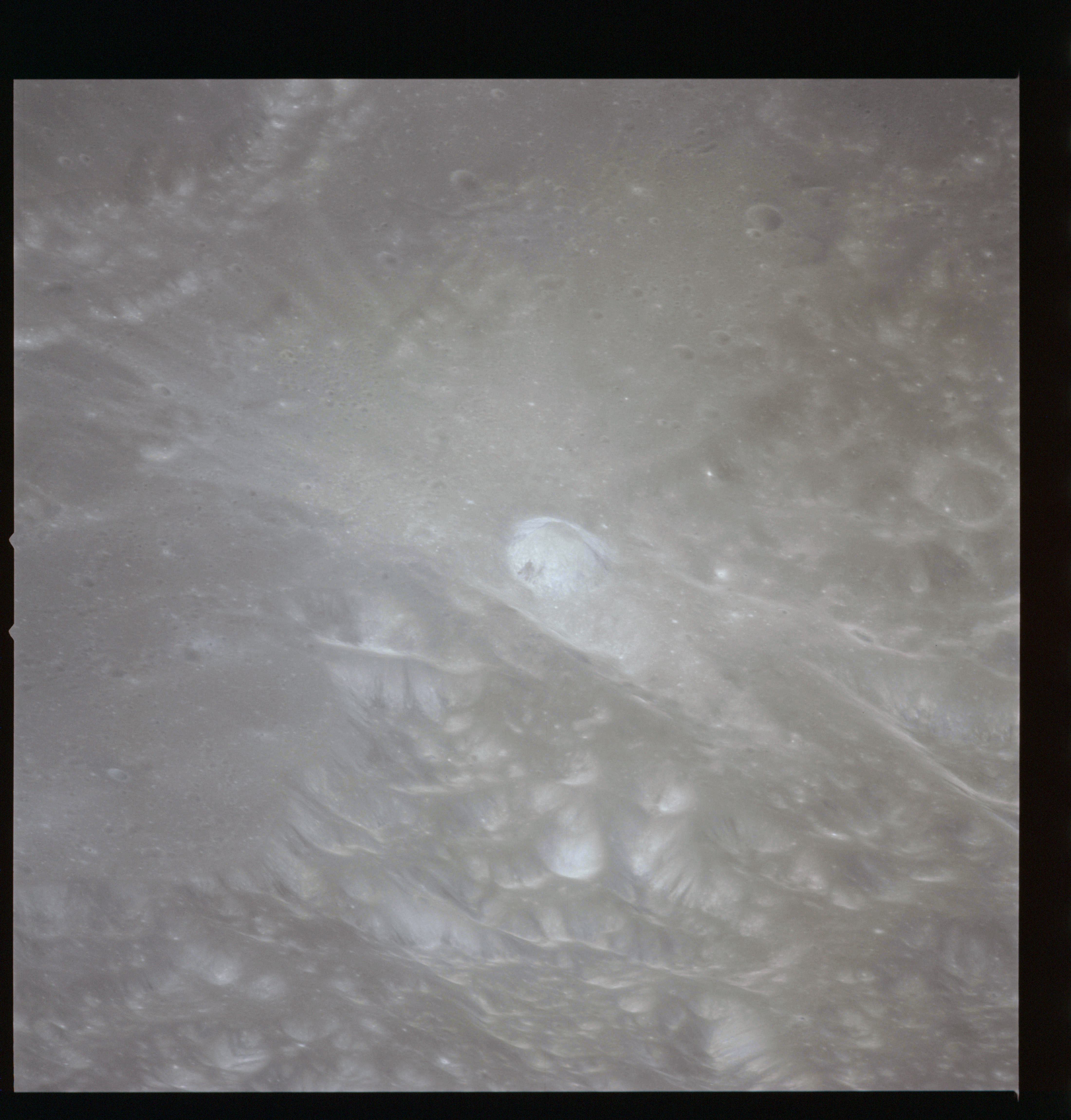 Returning to magazine P and colour photography using the 80-mm lens, this camera is continuing to take general shots of the Aristarchus Plateau. AS15-93-12617 shows the hummocky, uneven surface of the plateau and Vallis Schröteri to the left.