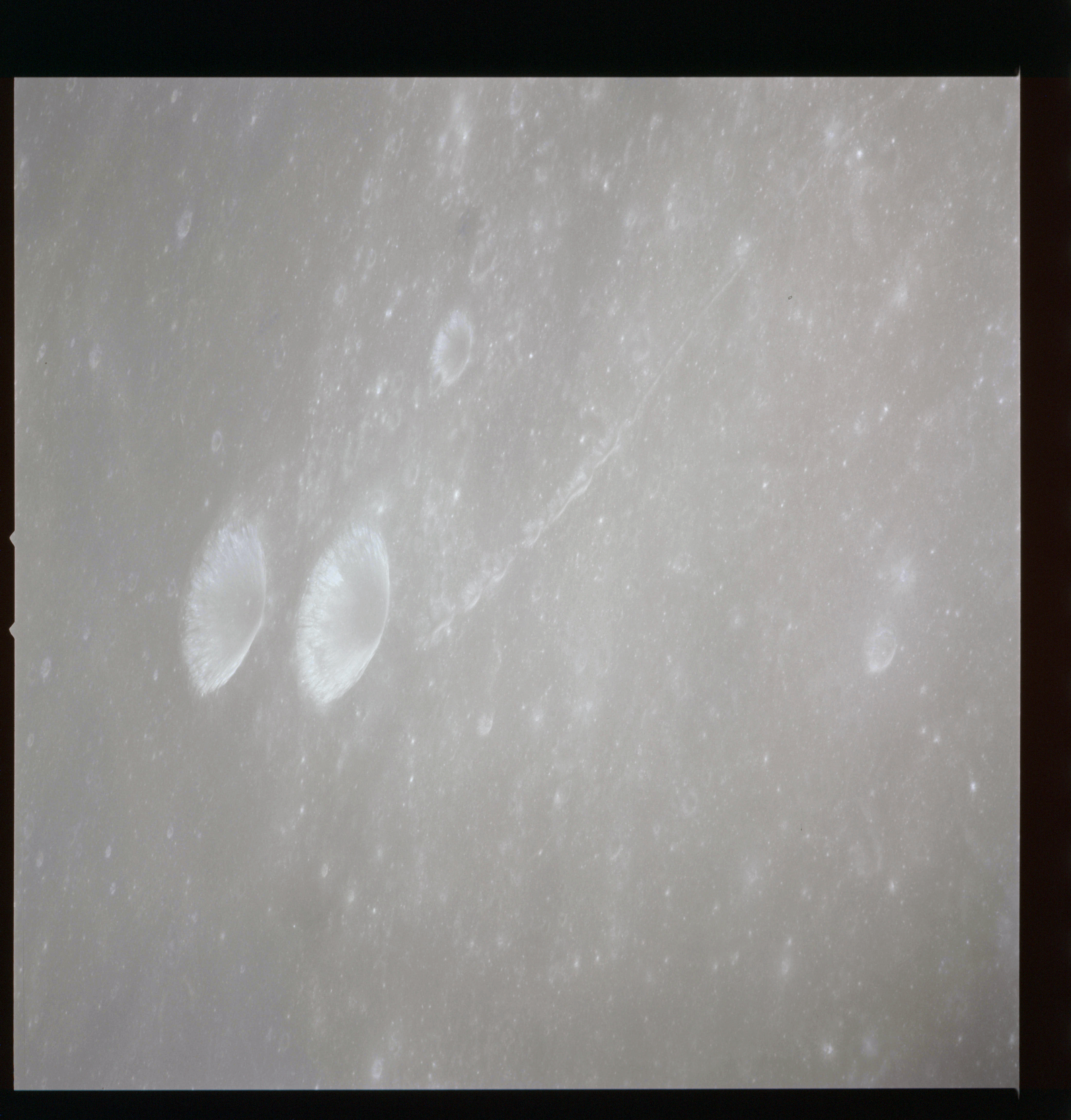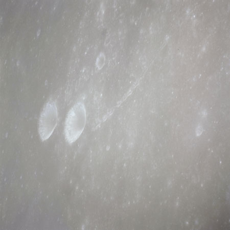 AS15-90-12319 and 12320 continue the wide-angle view northwest towards the Messier Twins; Messier and Messier A. The twin rays emanating westwards from this pair are well shown as is a fainter ray that crosses Messier perpendicular to its axis.
