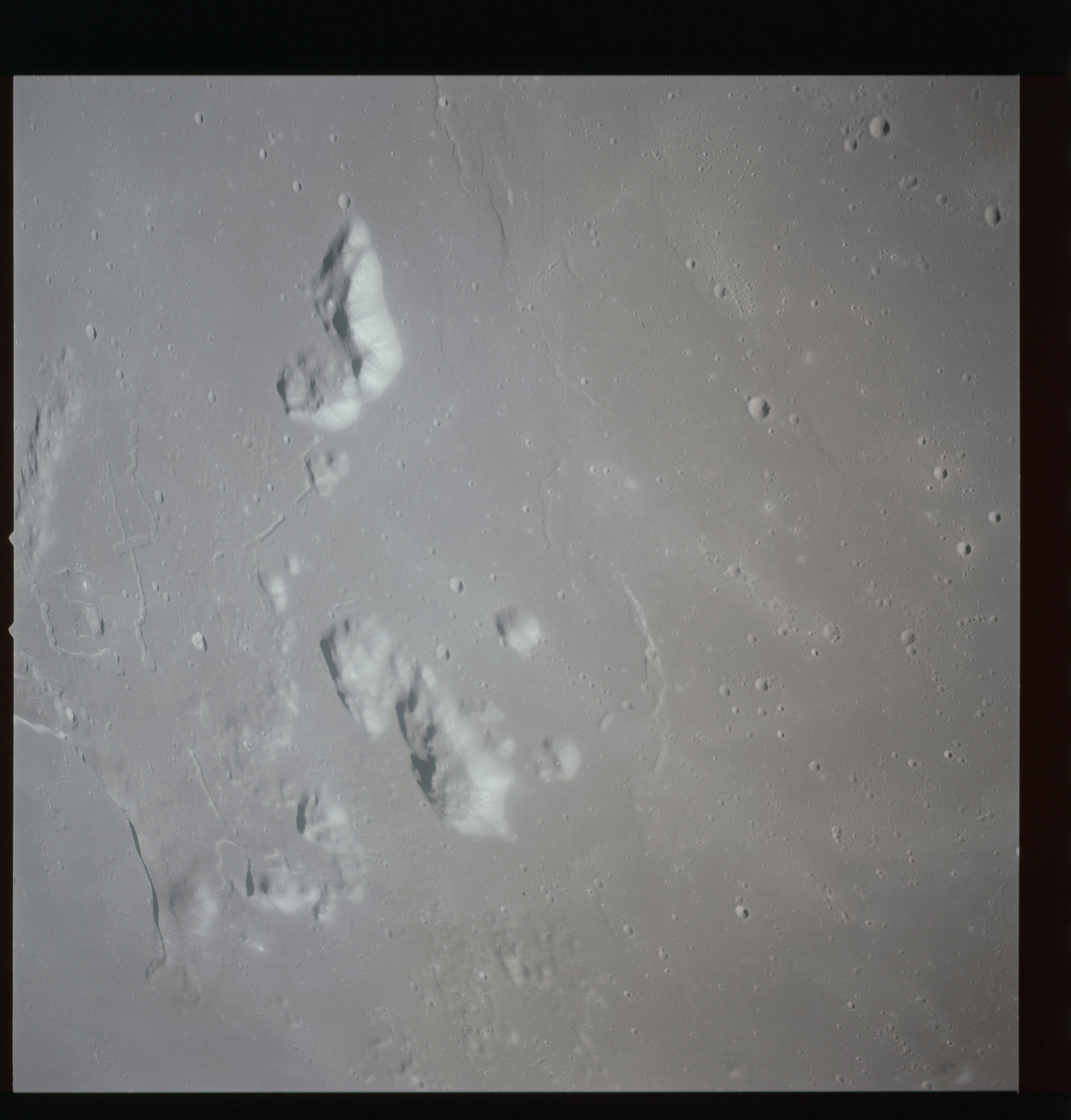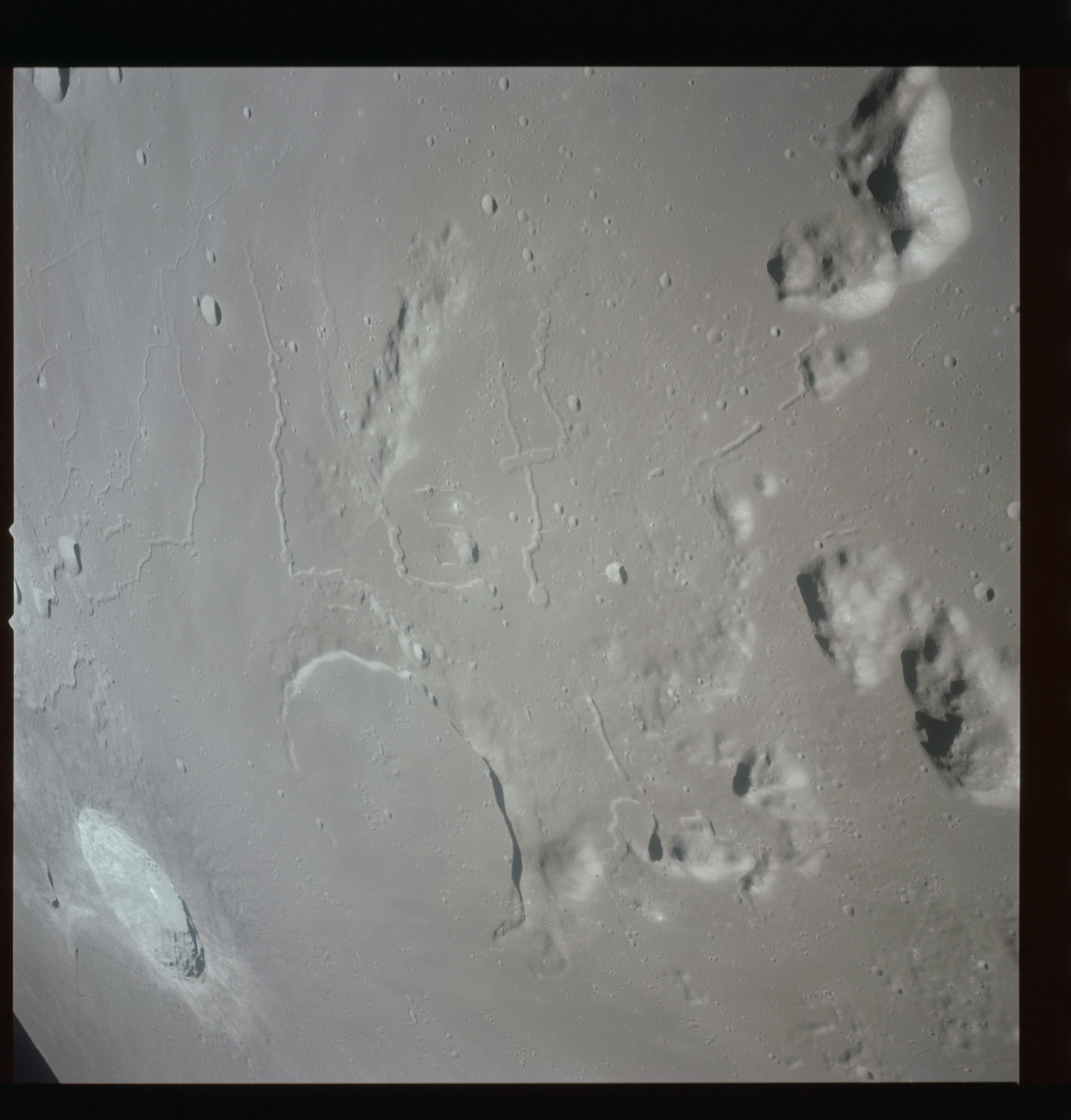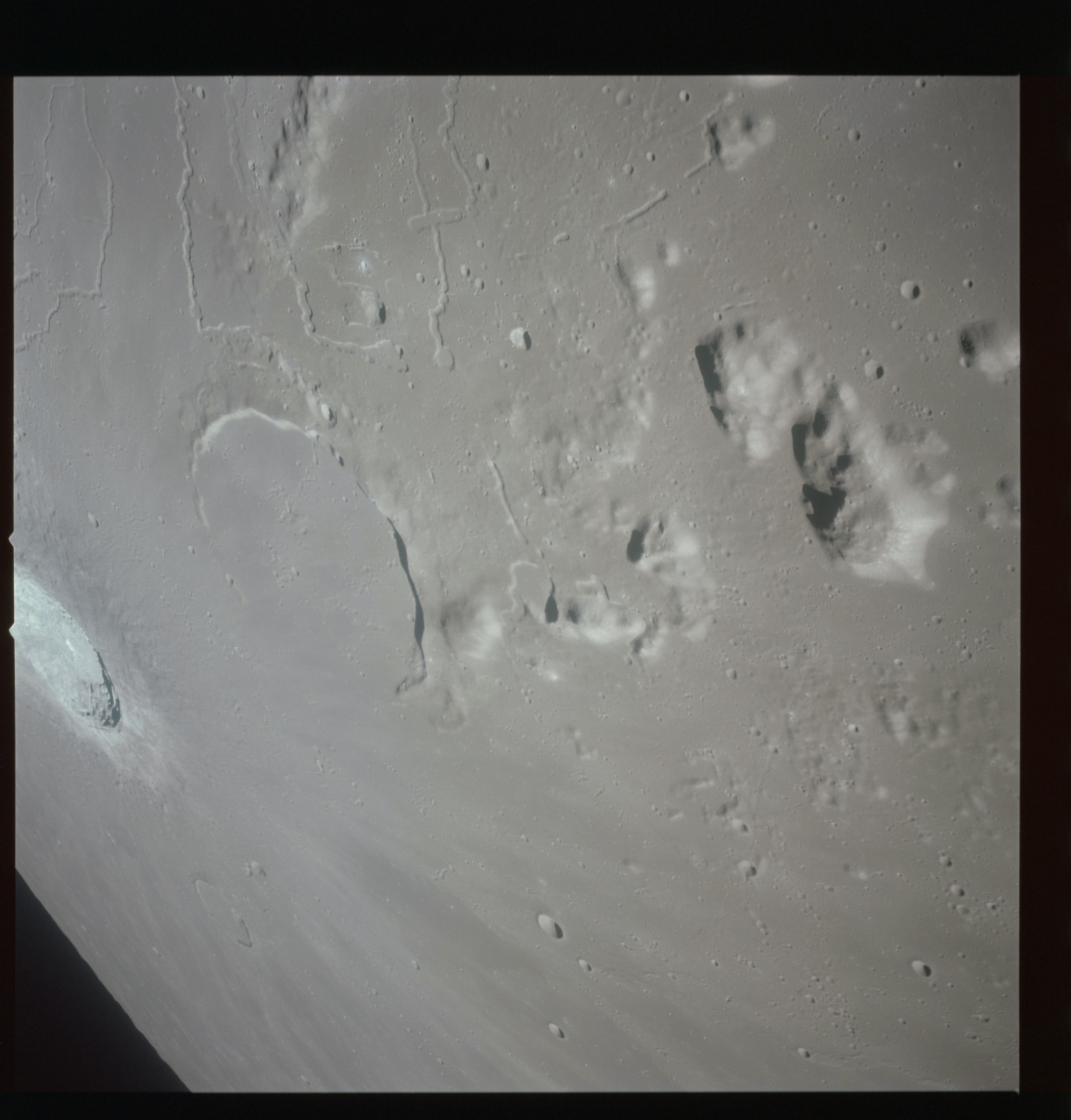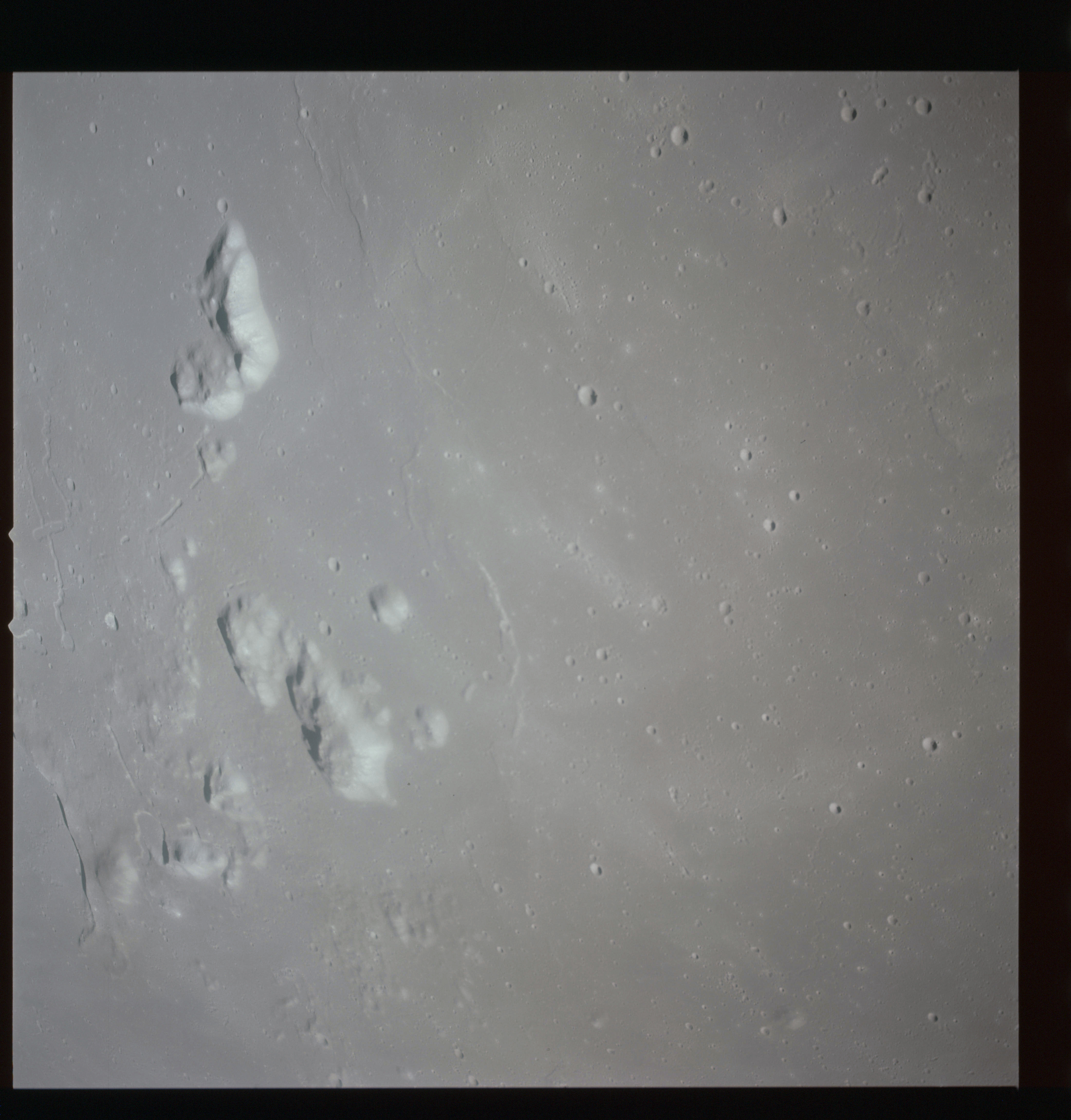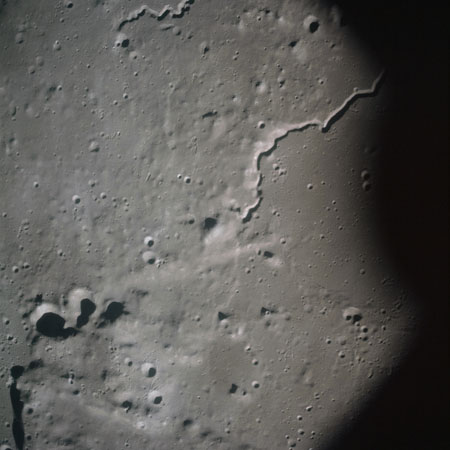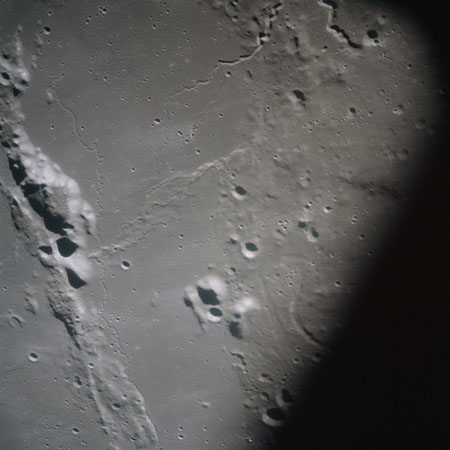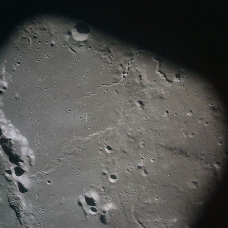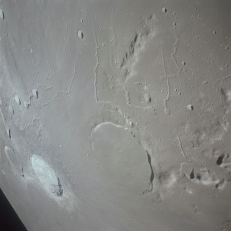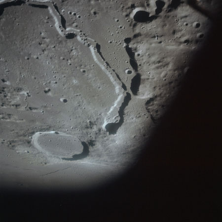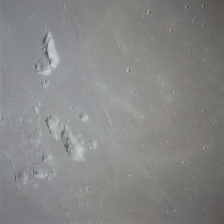 The final batch of handheld photography before reaching the terminator is on magazine P with the 80-mm lens. AS15-93-12632 shows the southern tip of the Montes Agricola range with Dorsa Burnet running alongside.