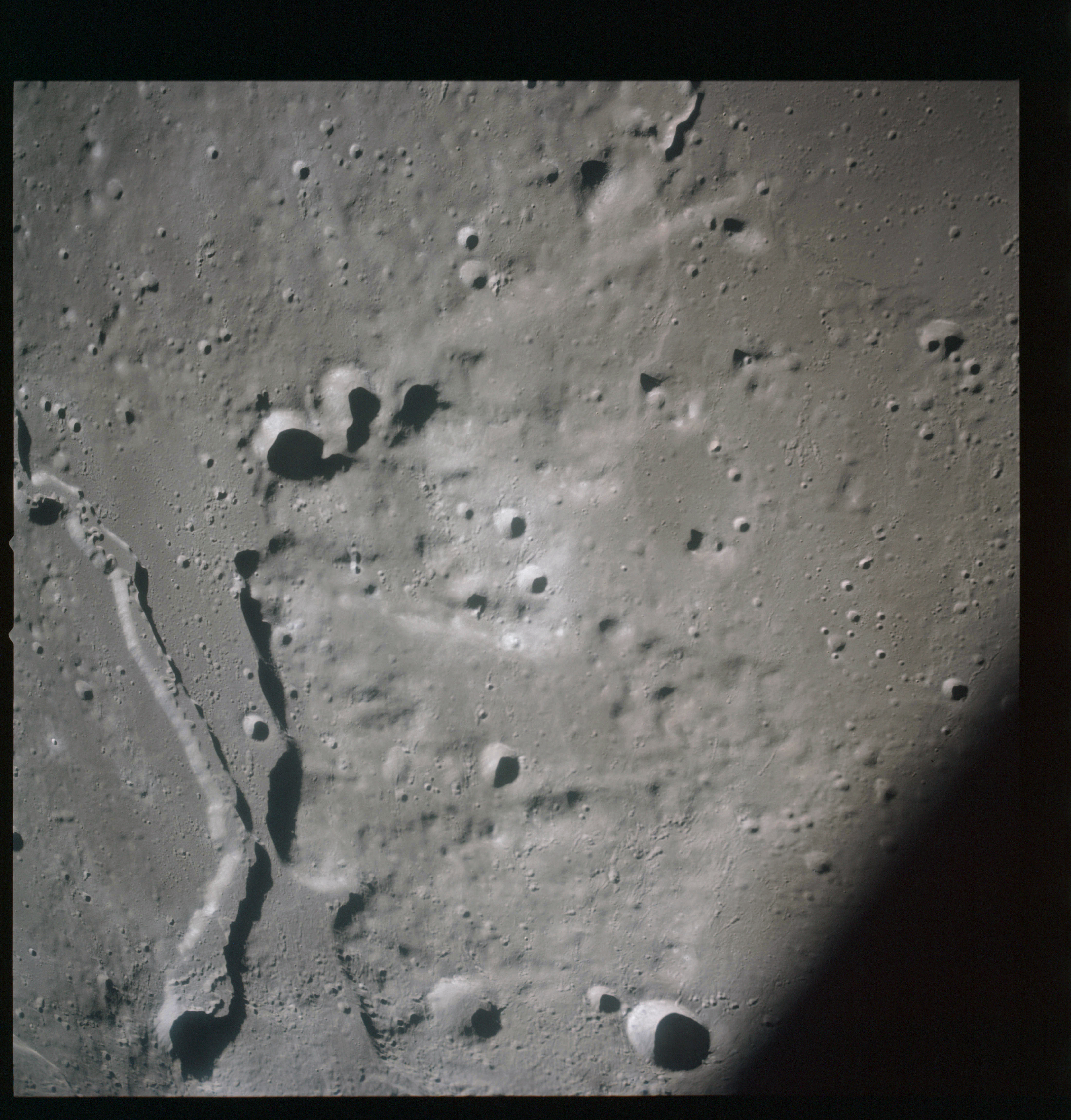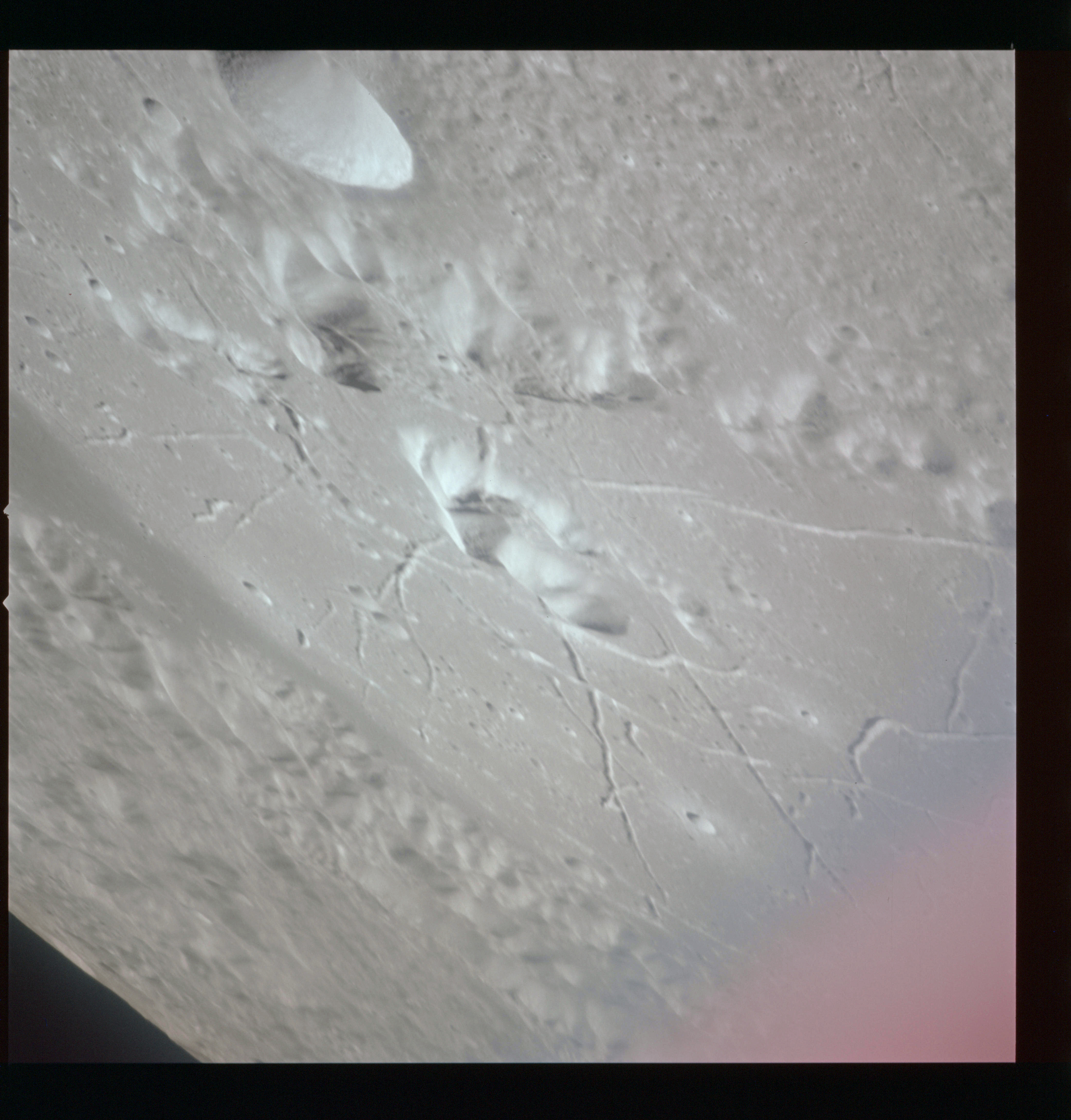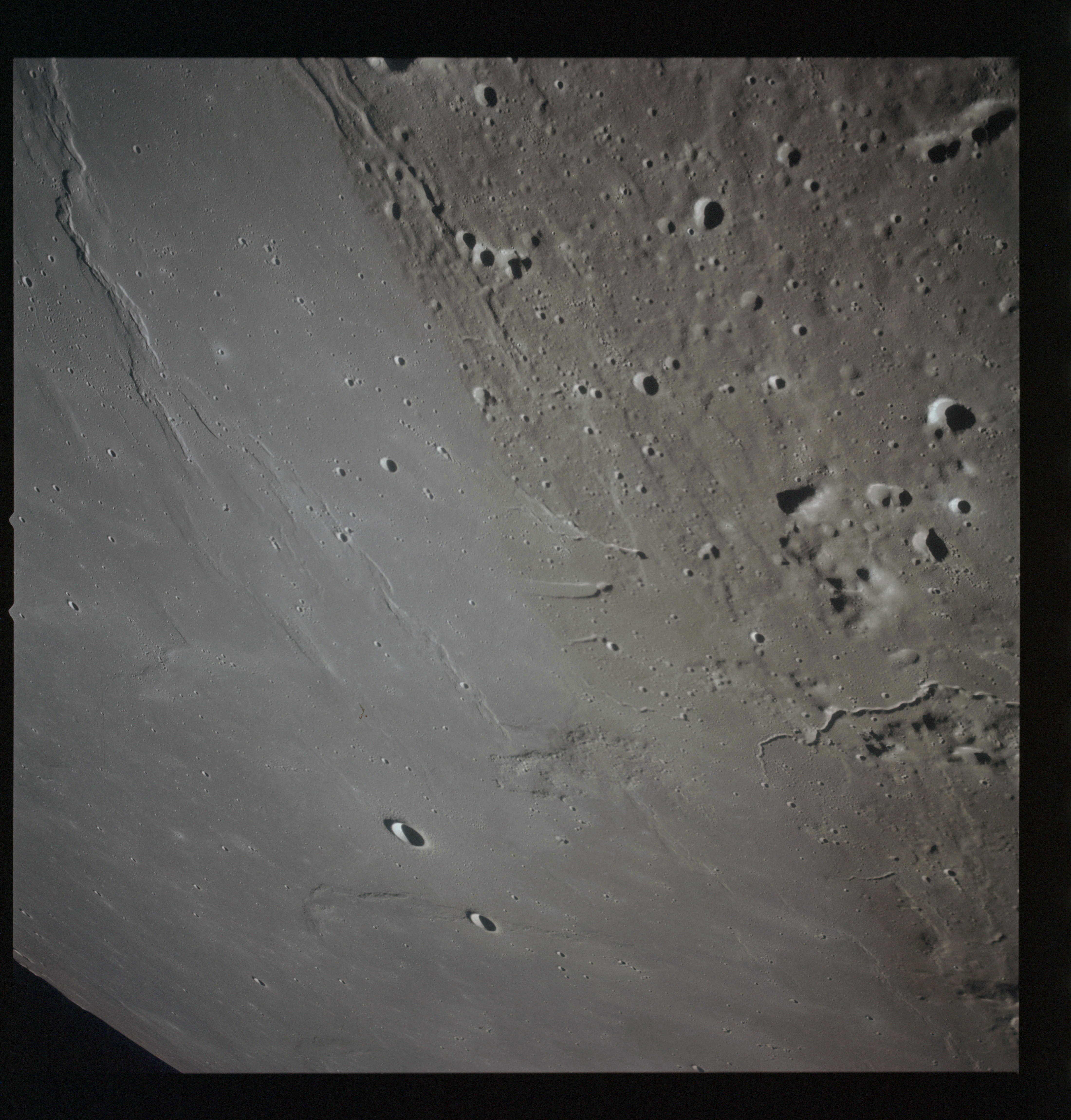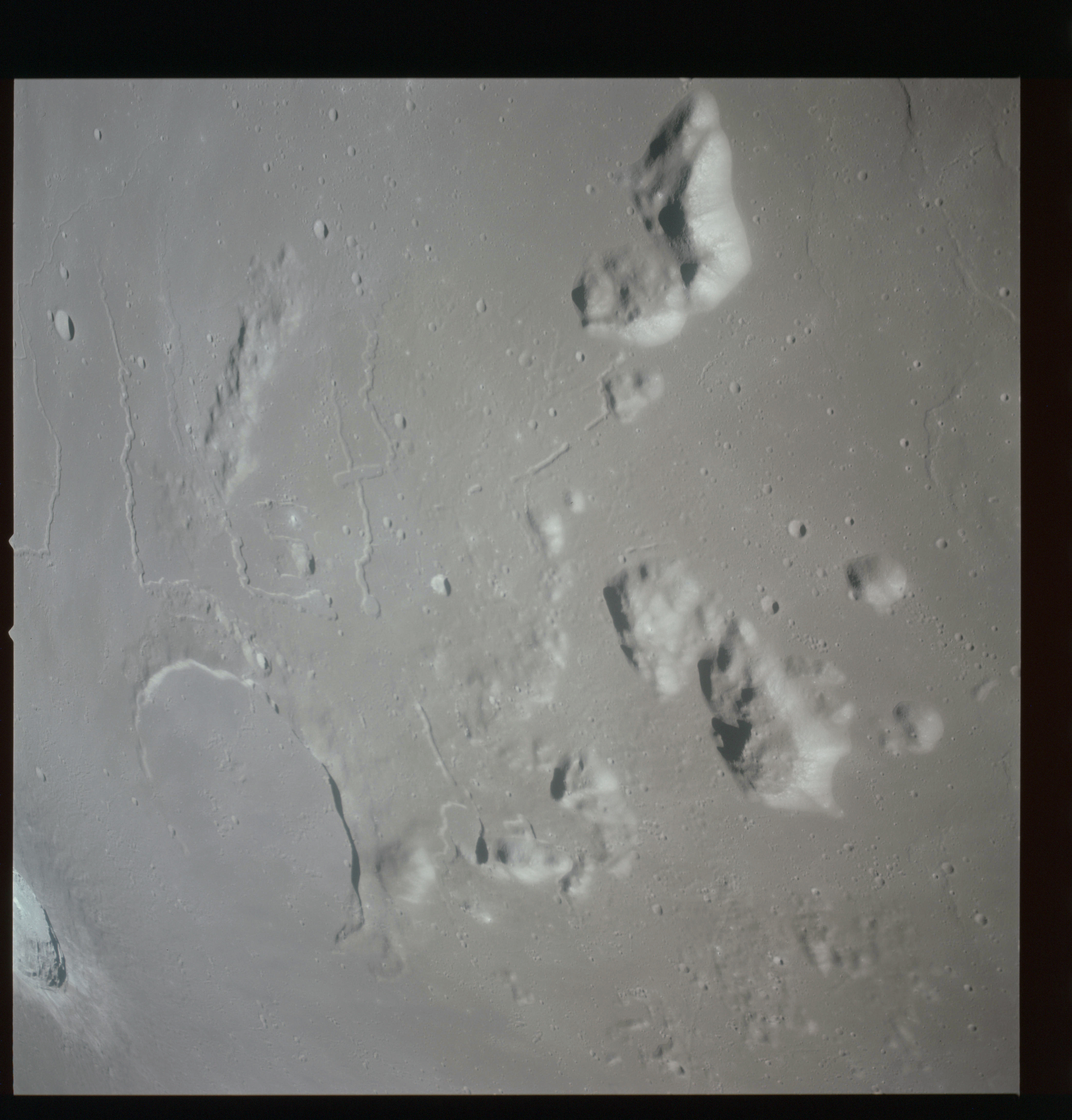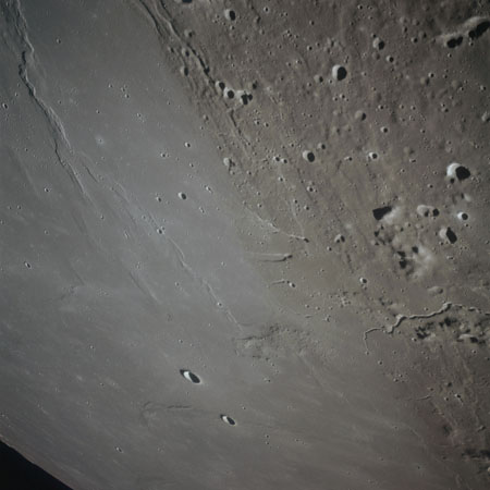 The final batch of handheld photography before reaching the terminator is on magazine P with the 80-mm lens. AS15-93-12632 shows the southern tip of the Montes Agricola range with Dorsa Burnet running alongside.