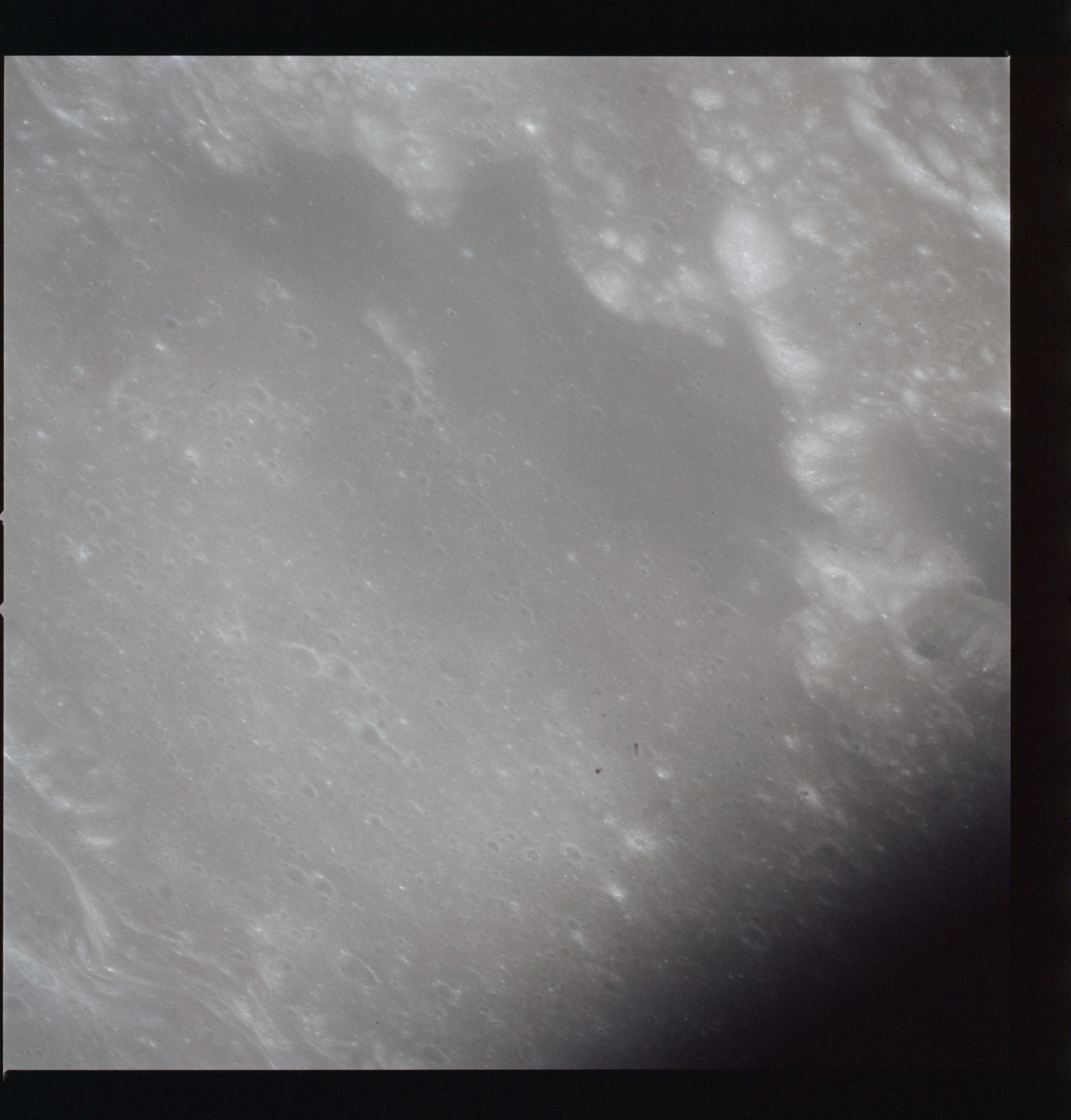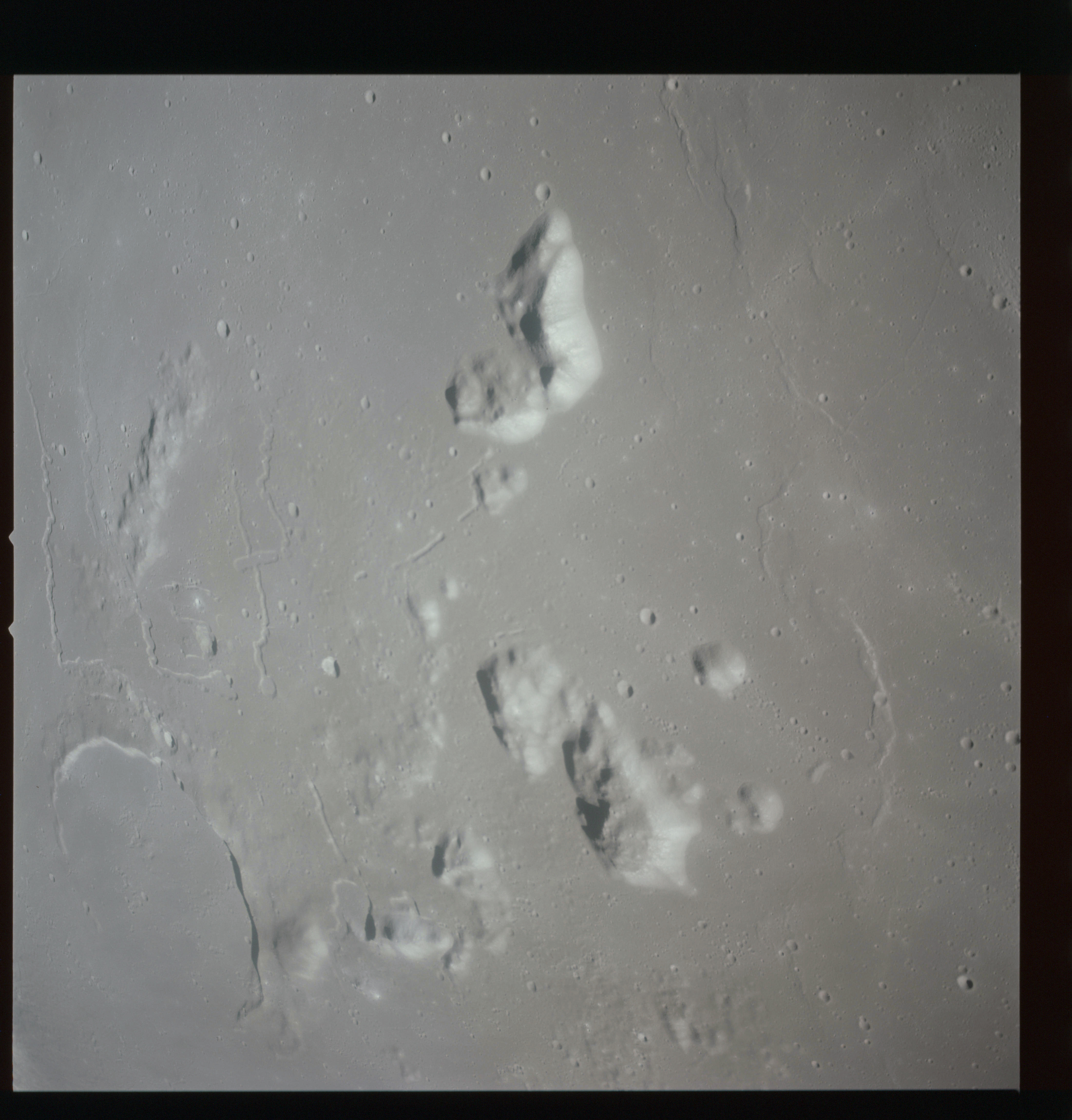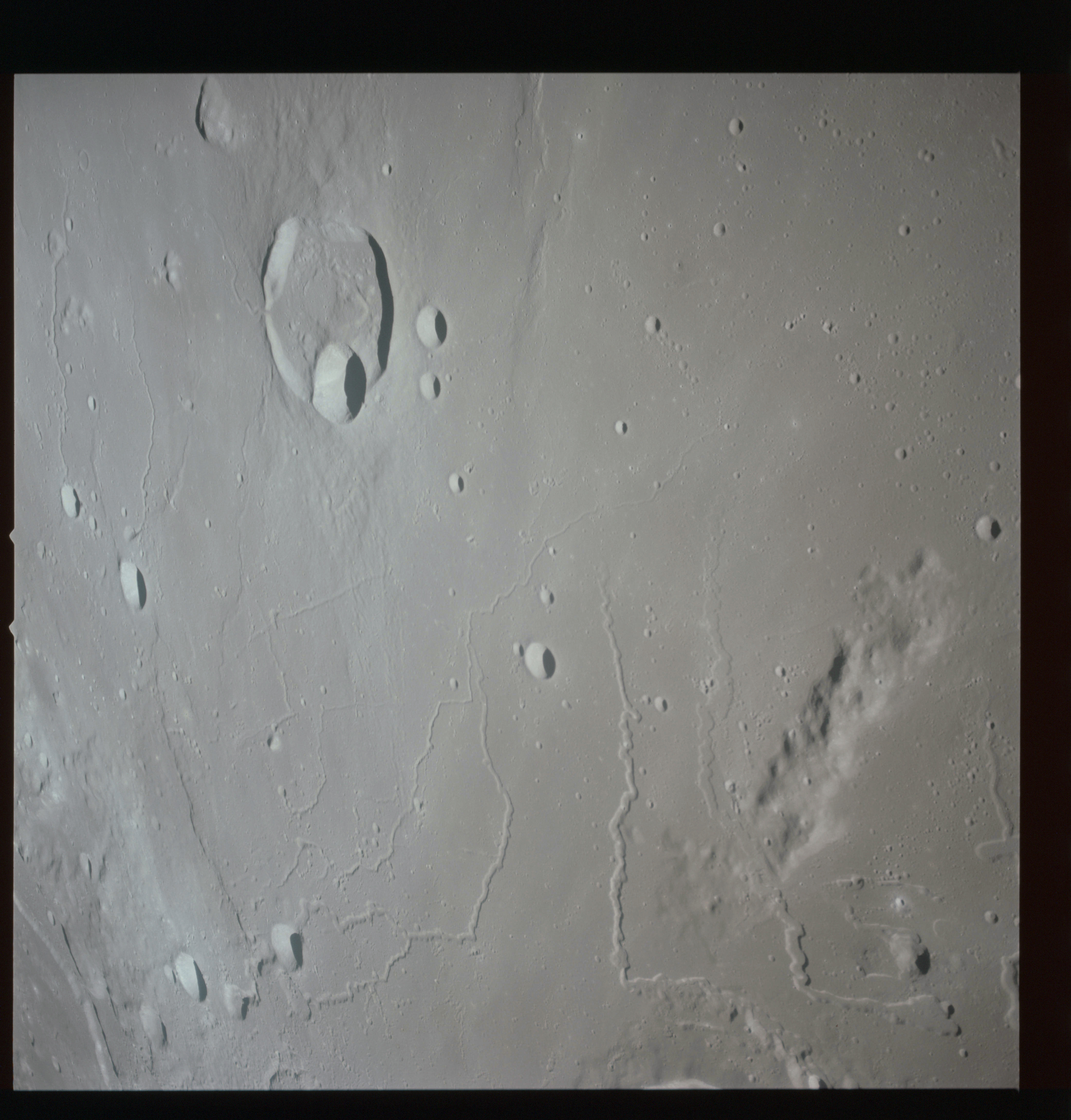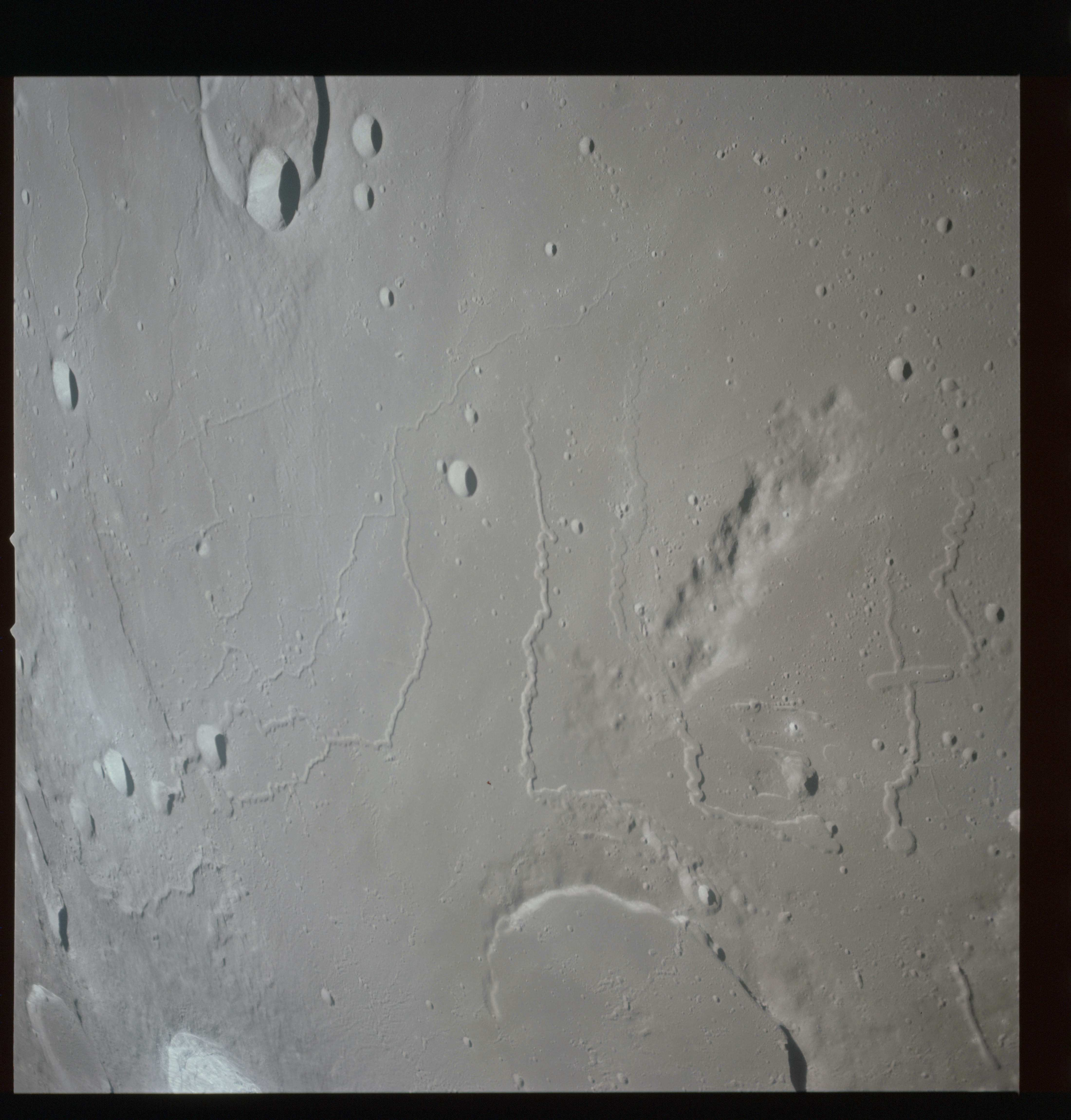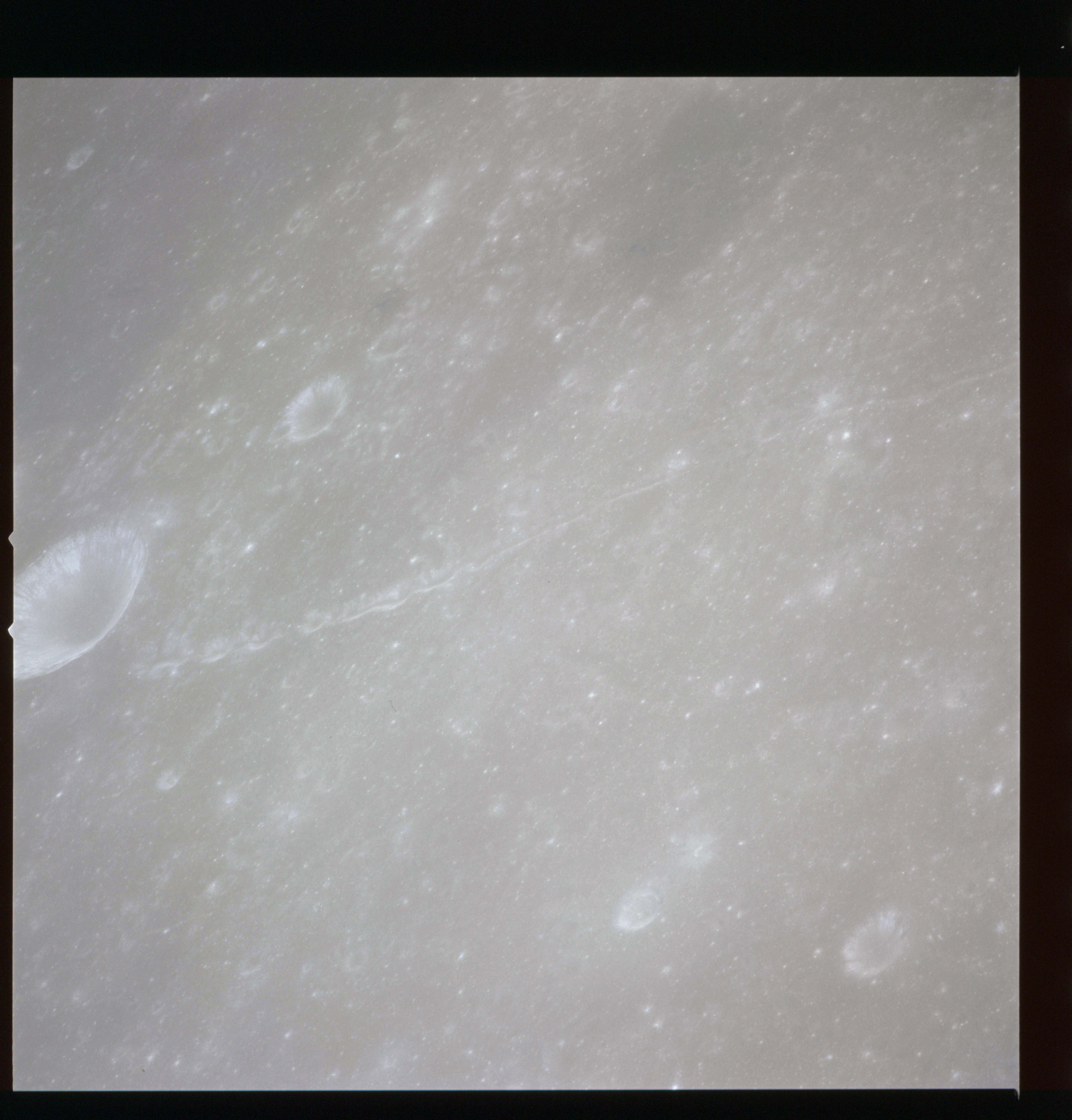 The final batch of handheld photography before reaching the terminator is on magazine P with the 80-mm lens. AS15-93-12632 shows the southern tip of the Montes Agricola range with Dorsa Burnet running alongside.