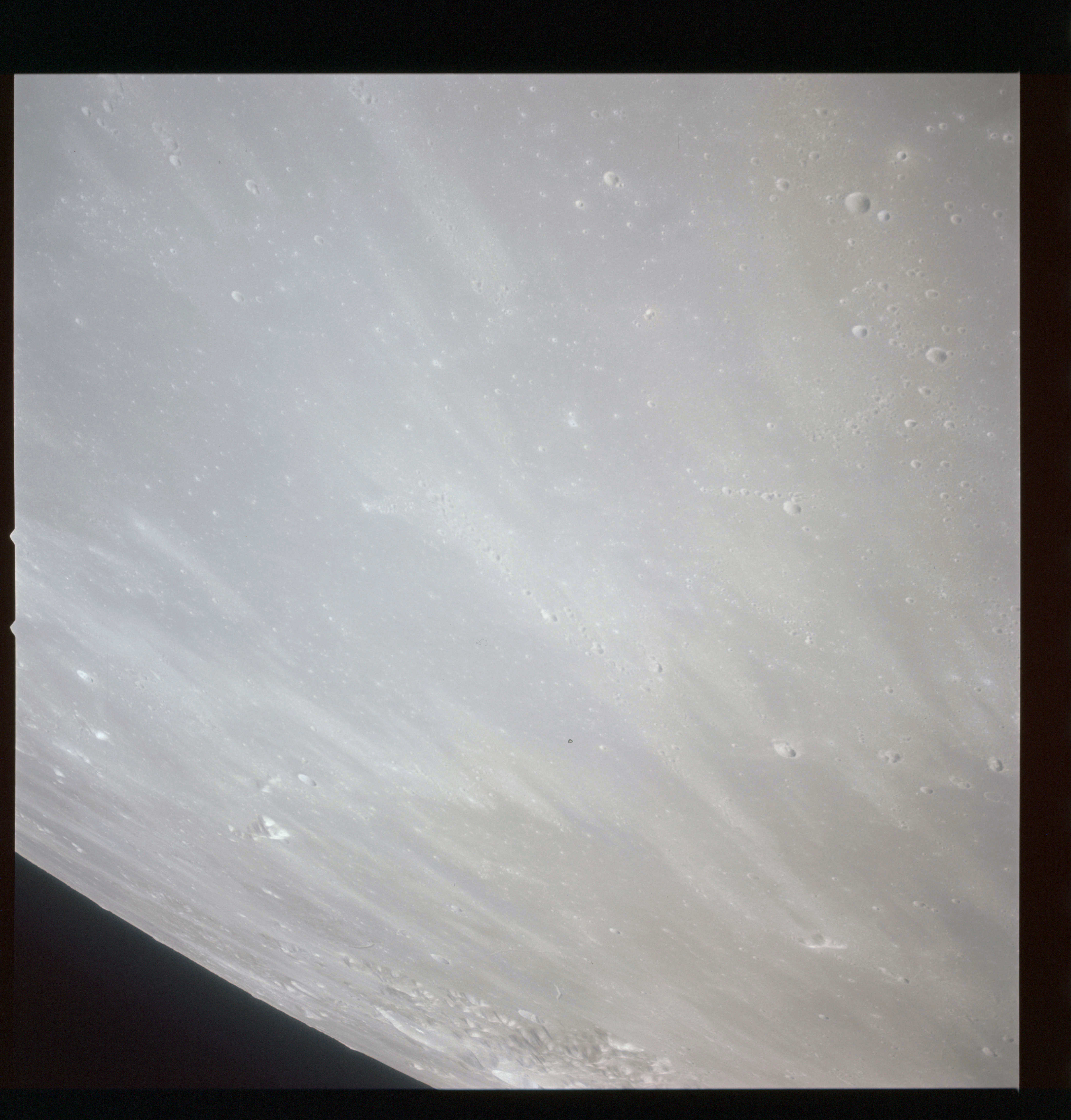 Having been taken on colour film, AS15-93-12630 displays one of the few places on the Moon where colour differences in the soil are apparent. By raising the saturation of the image, the brown tone is even easier to see but it is quite clear in the unenhanced original. The blast marks from Aristarchus' ejecta are also apparent across the mare surface.