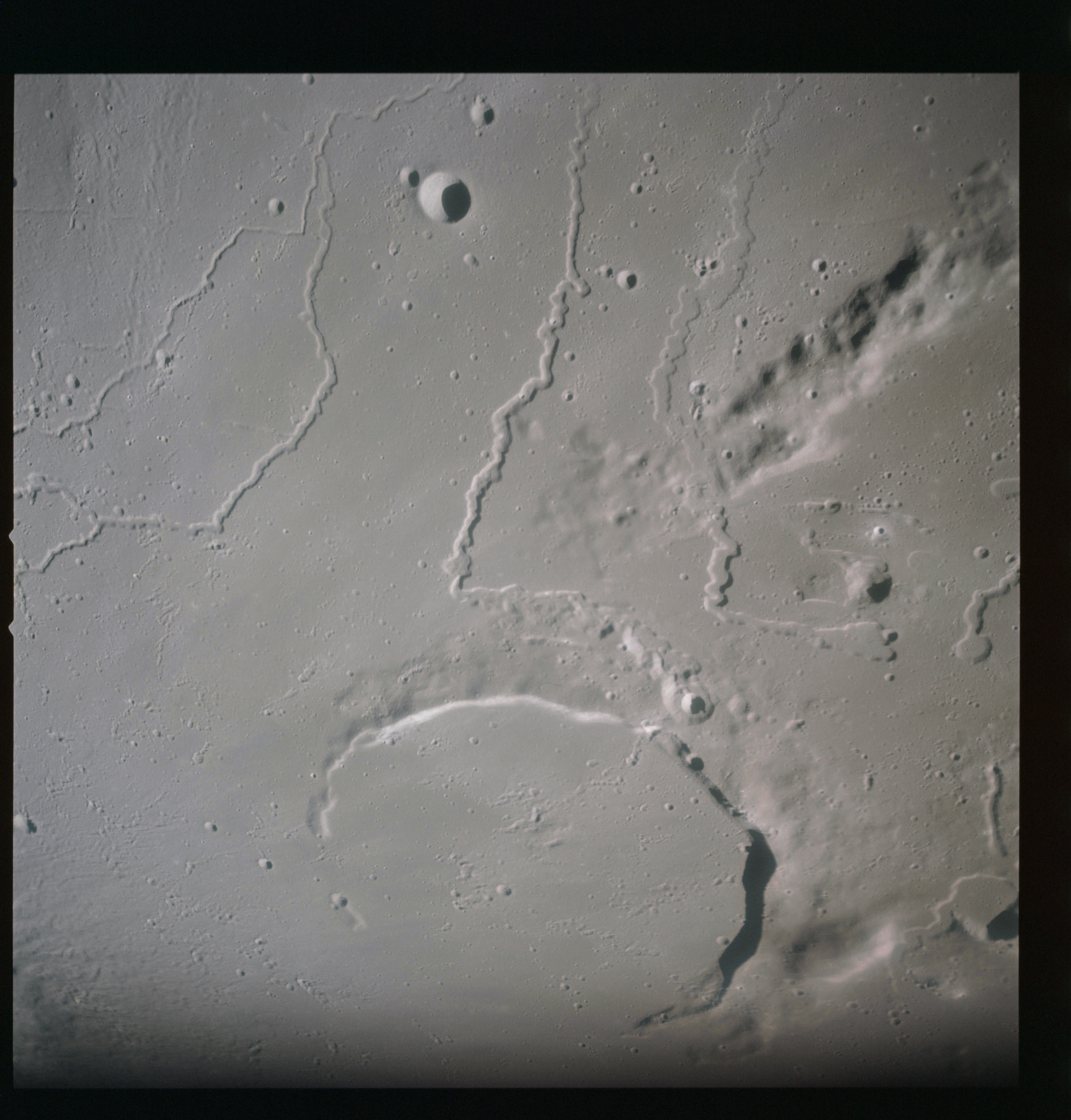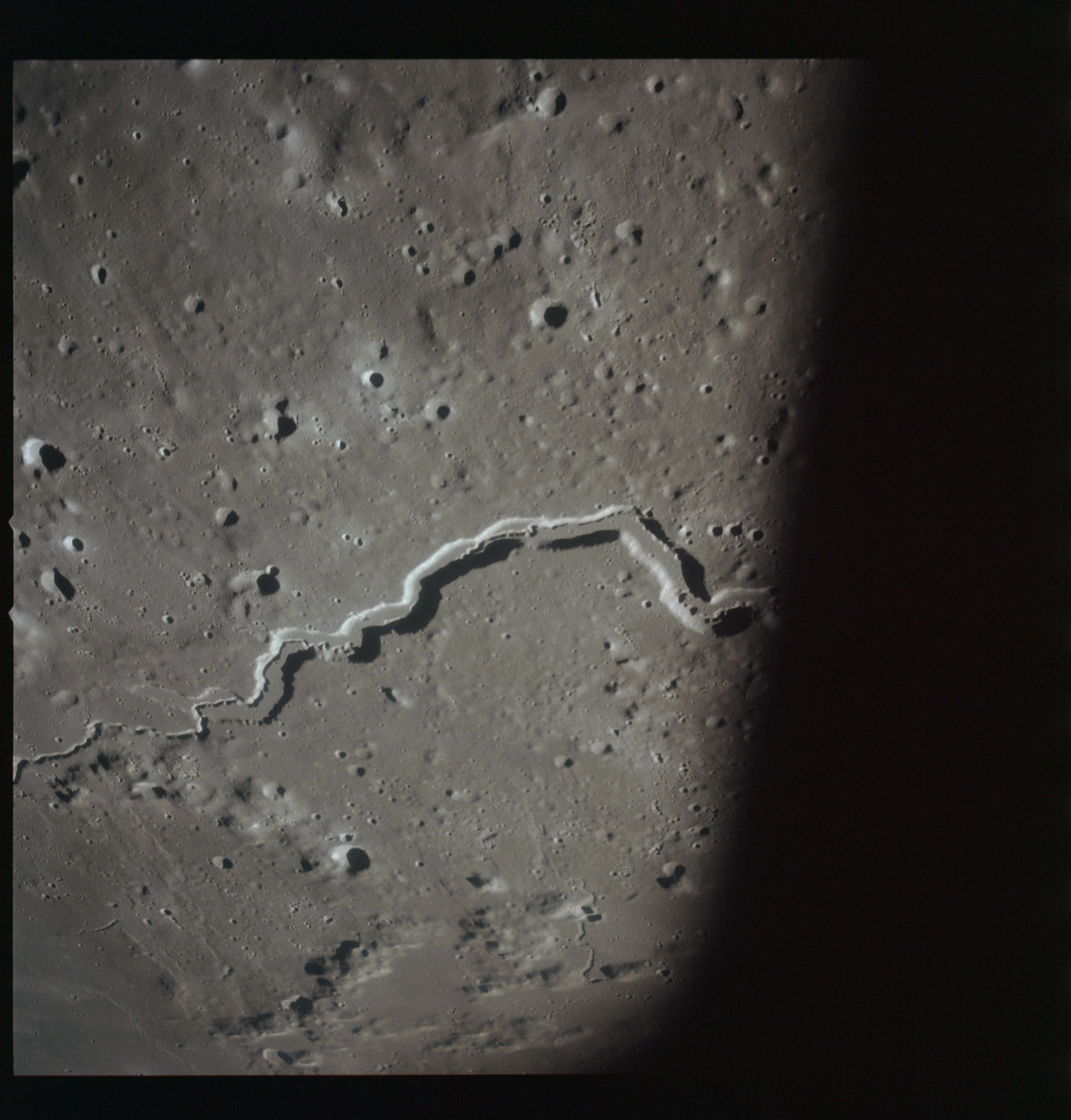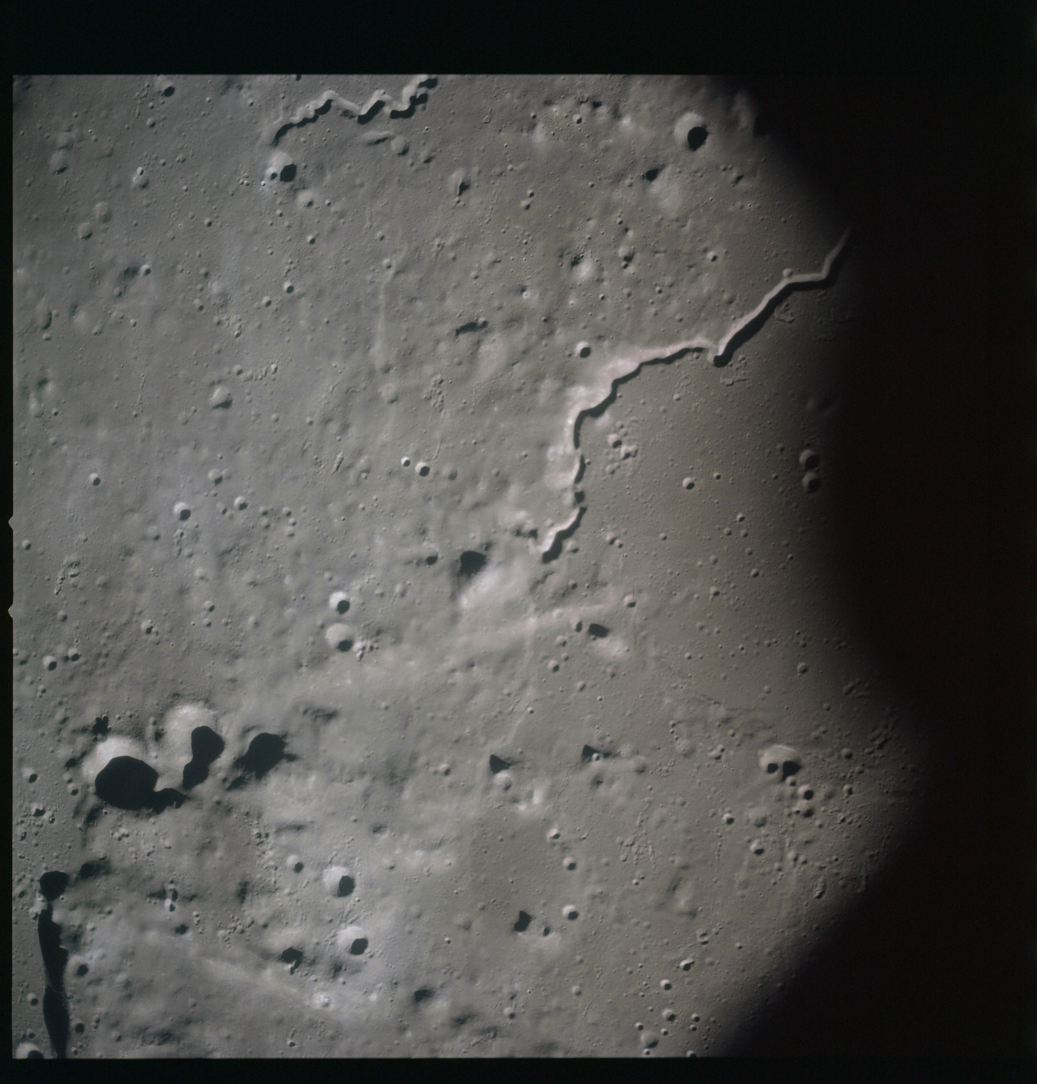 By AS15-92-12502, Vallis Schröteri has diverted to the west leaving the smaller rille break through its southern wall to carry on into Oceanus Procellarum.