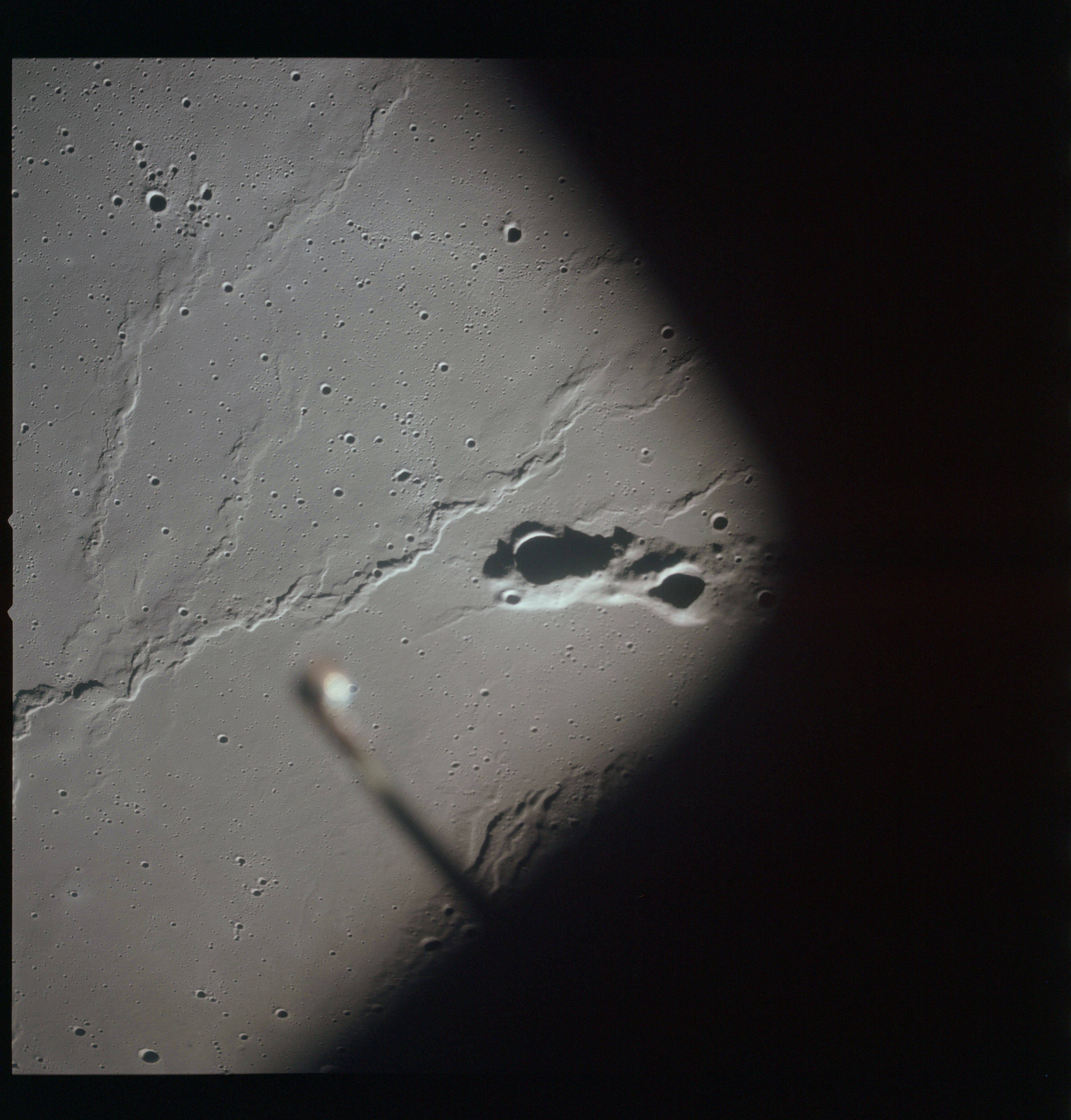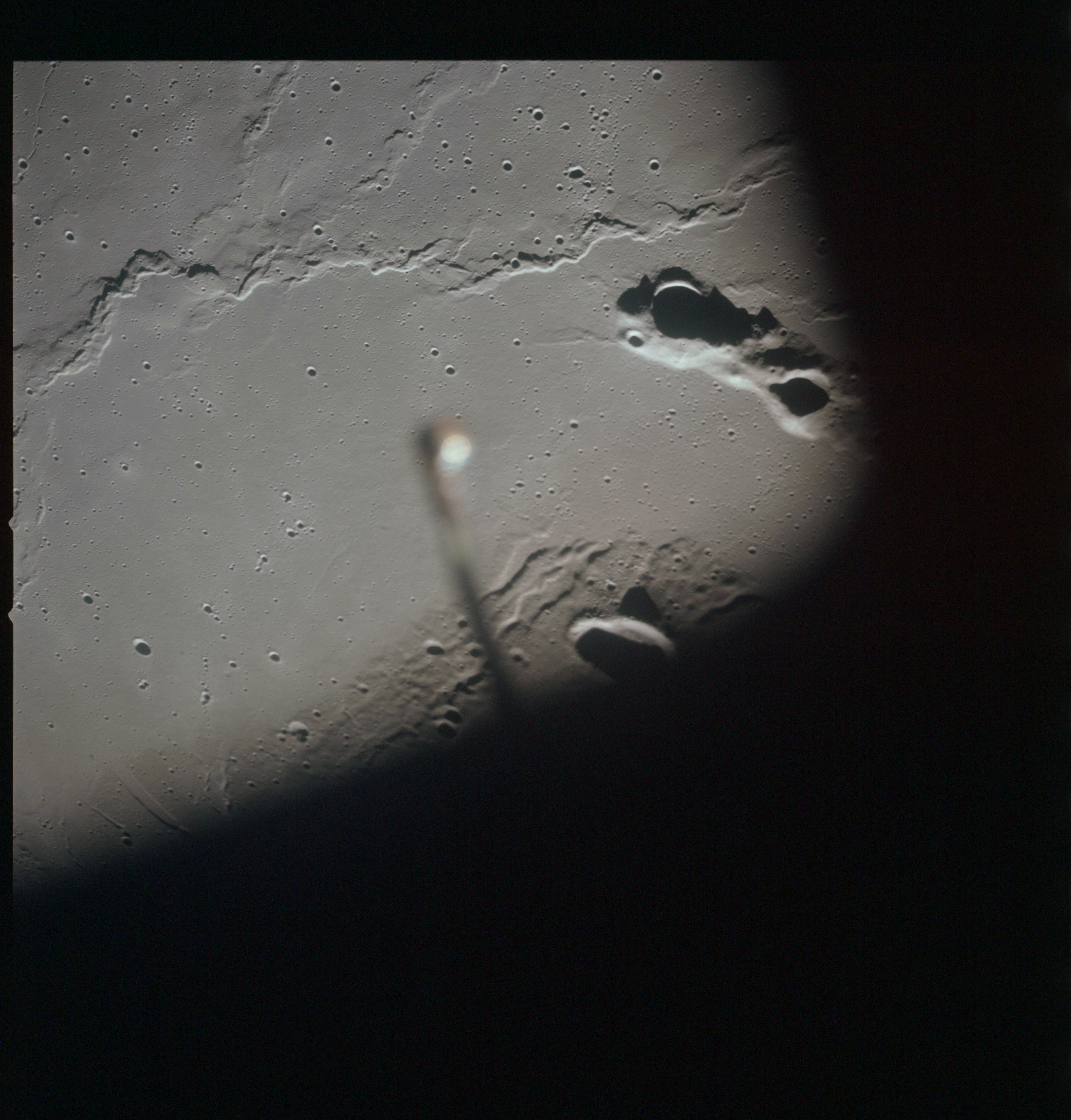 AS15-93-12636 - The southwest end of Montes Agricola and Dorsum Burnet. The CSM EVA light is out of focus in the foreground - Image by NASA/Johnson Space Center.
