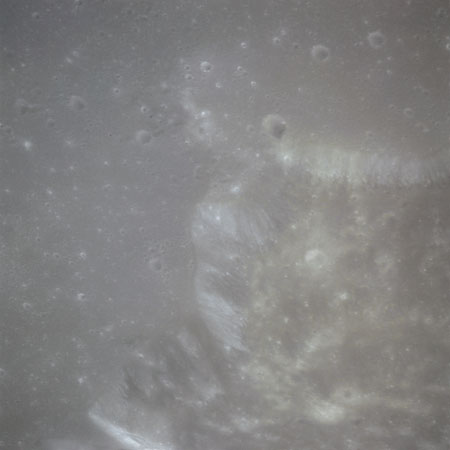 Endeavour is about to complete rev 69, having just passed out of sight of Earth. As the PAO announcer soon intimates, the crew will finish their breakfast during this far-side pass, then continue with the science objectives for the day. First among these is to prepare a Hasselblad with a 250-mm lens and very high speed black and white film in magazine R for photography of the terminator just before AOS. The Mass Spectrometer is turned off and, after five minutes, retracted into the side of the Service Module, along with the Gamma-ray Spectrometer. With these two instruments out of the way, the Mapping Camera is extended and readied for operation once the spacecraft crosses the terminator. As a last hope, the Laser Altimeter will be switched on in support of the camera but it is believed to be useless now having been seen to progressively fail during its operation in lunar orbit.