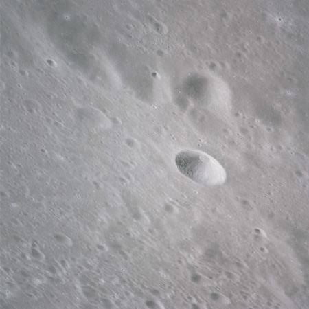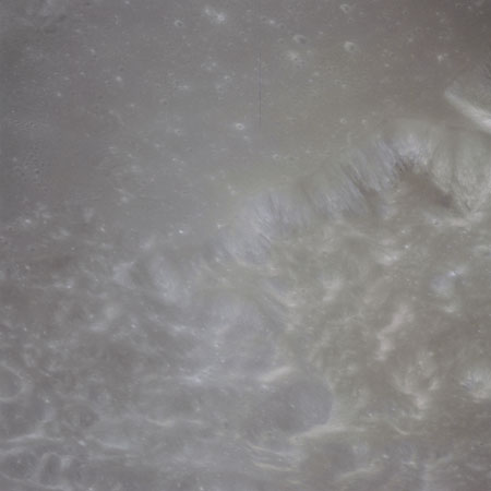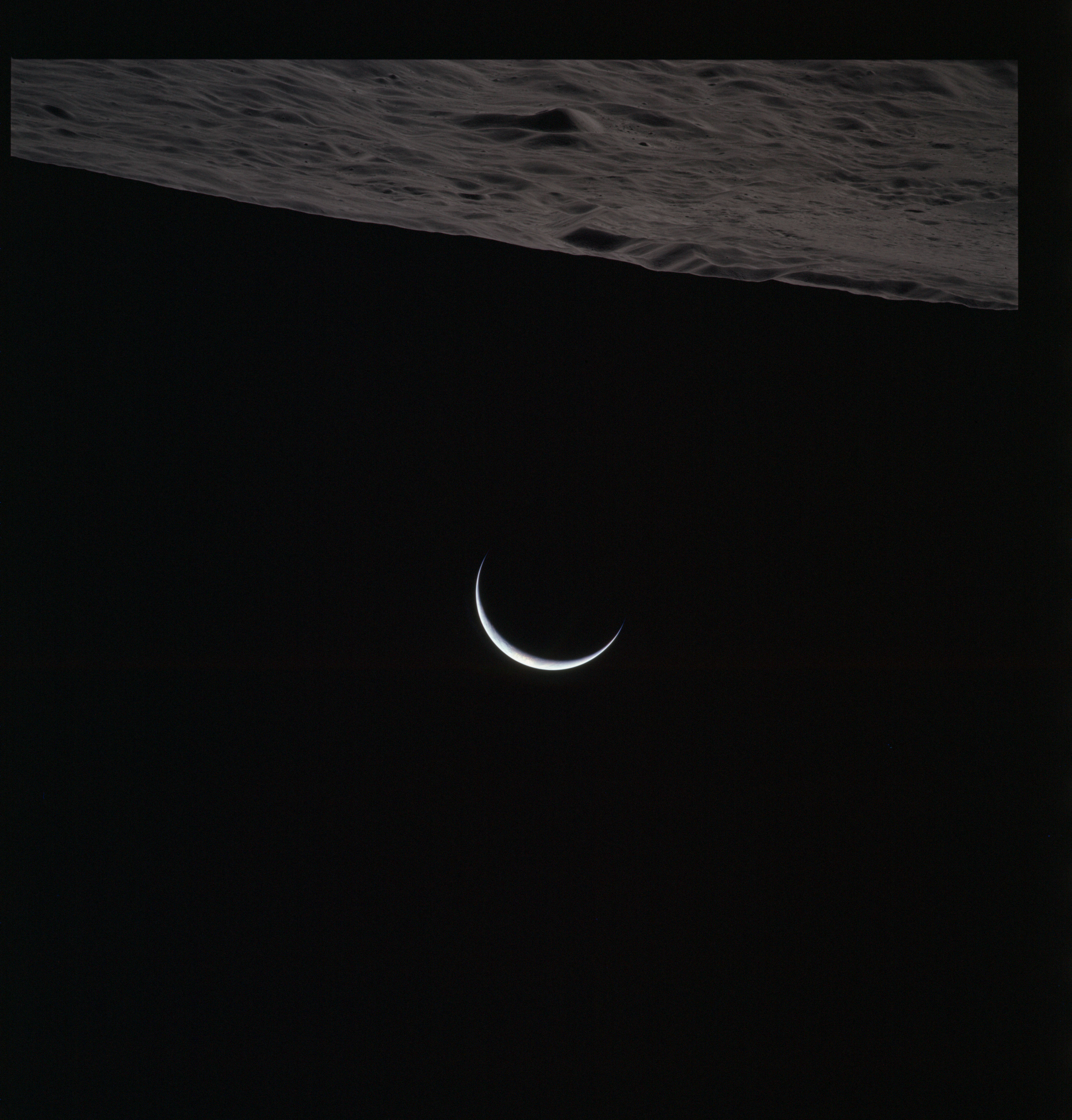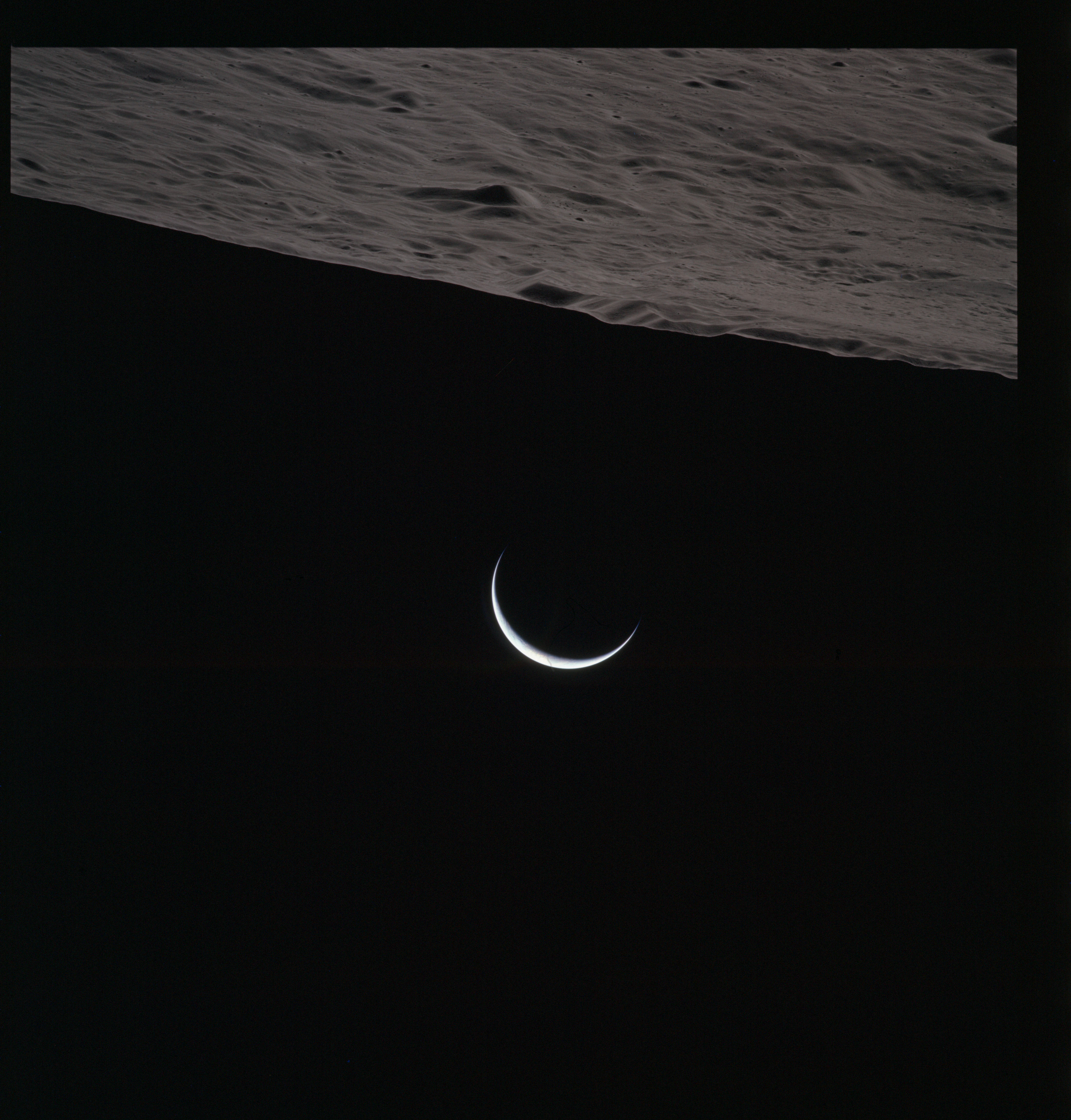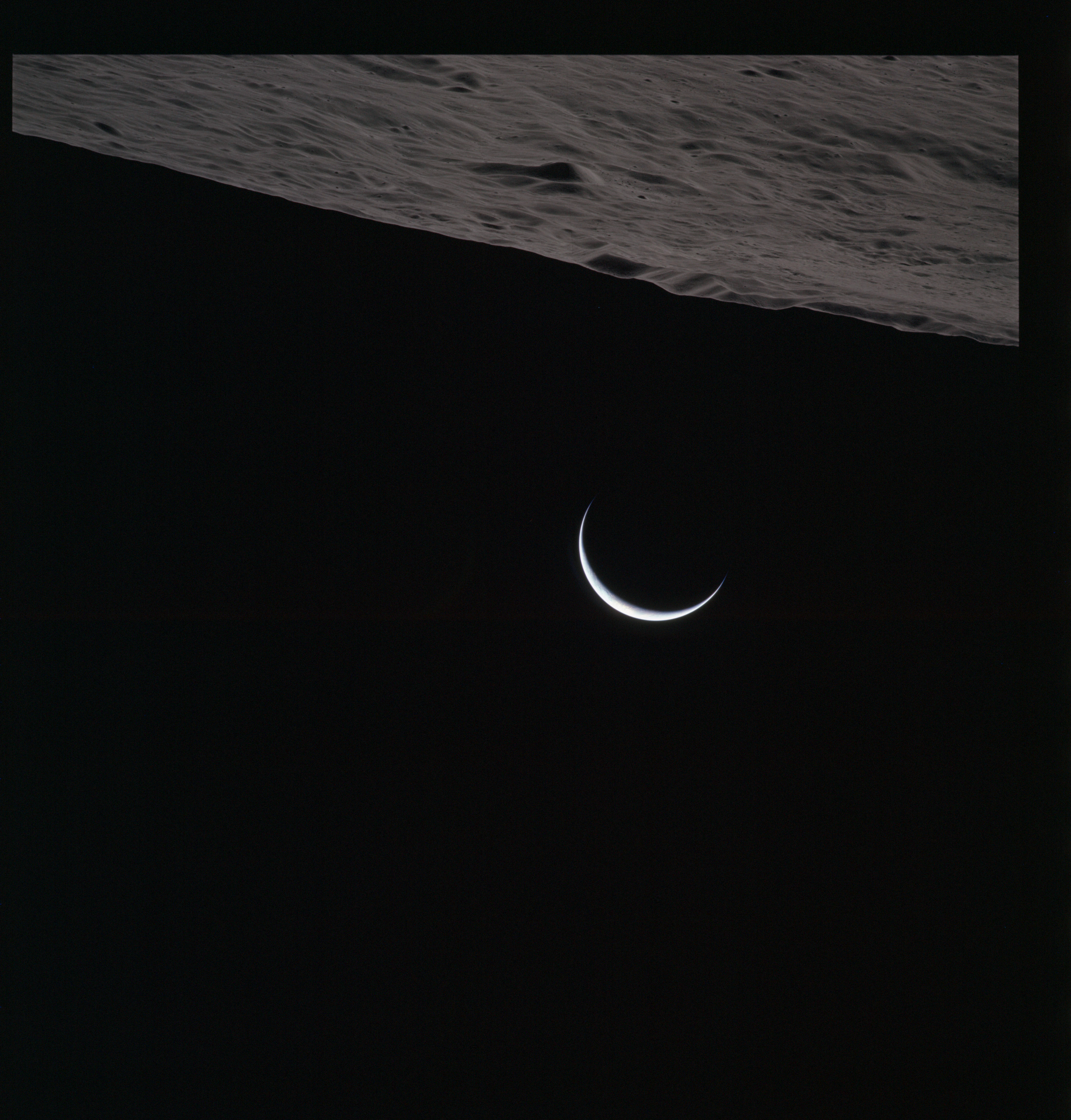 One of these is often composited with the above image of Curie that, in the opinion of this author (Woods), produces one of the most profound images of the Apollo program. Al used it for the cover of his book of poetry, 'Hello Earth, Greetings From Endeavour' and a similar composite also found its way into Michael Light's beautiful and lyrical collection of Apollo imagery, 'Full Moon'., Here, the previous two images have been composited.