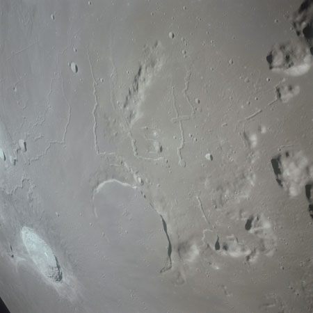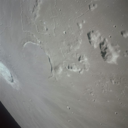 AS15-93-12632 - The southwestern end of Montes Agricola including Dorsa Burnet. Also includes crater Zinner on the extreme left and crater Raman on the extreme right - Image by NASA/Johnson Space Center.