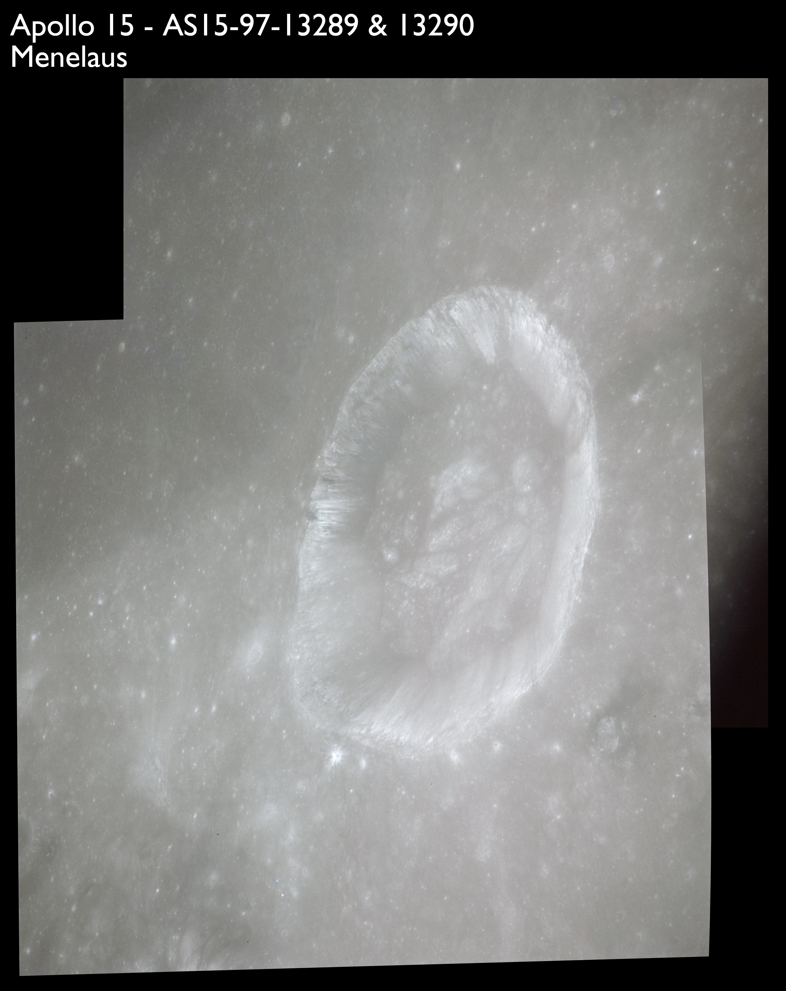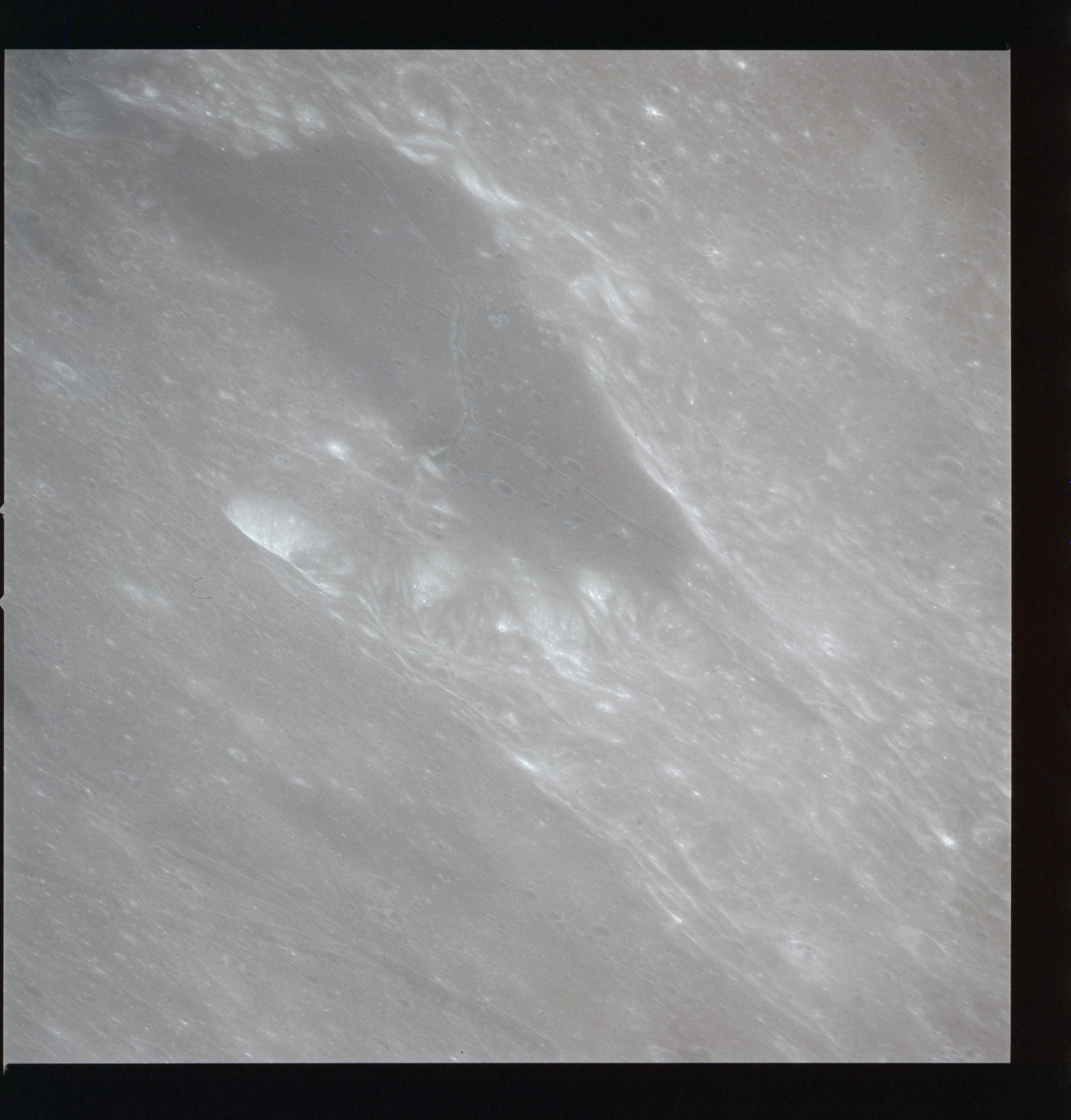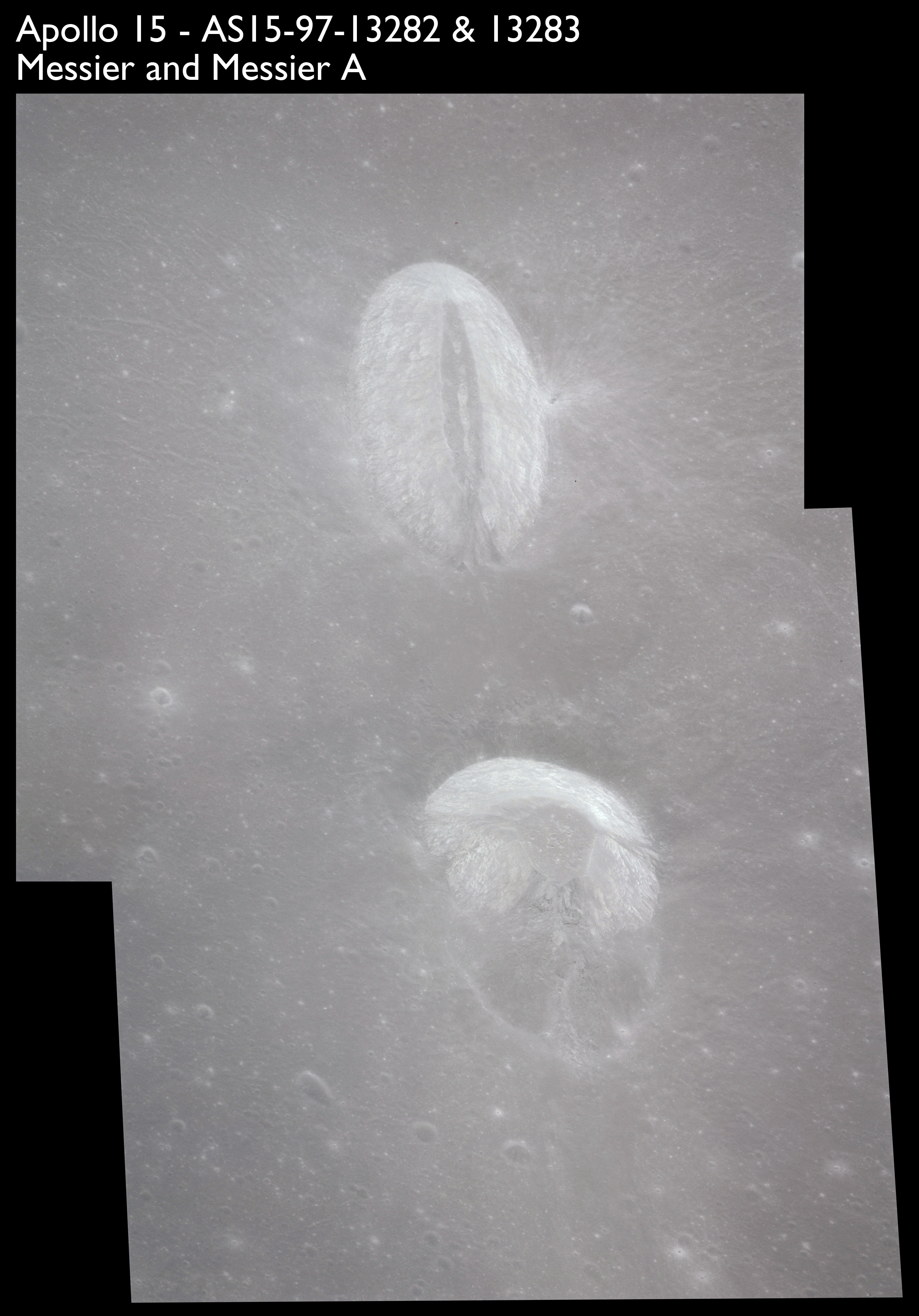 Looking a little to the left, AS15-97-13281 is an oblique shot of Messier asnd Messier A and the unique ray system surrounding the pair.