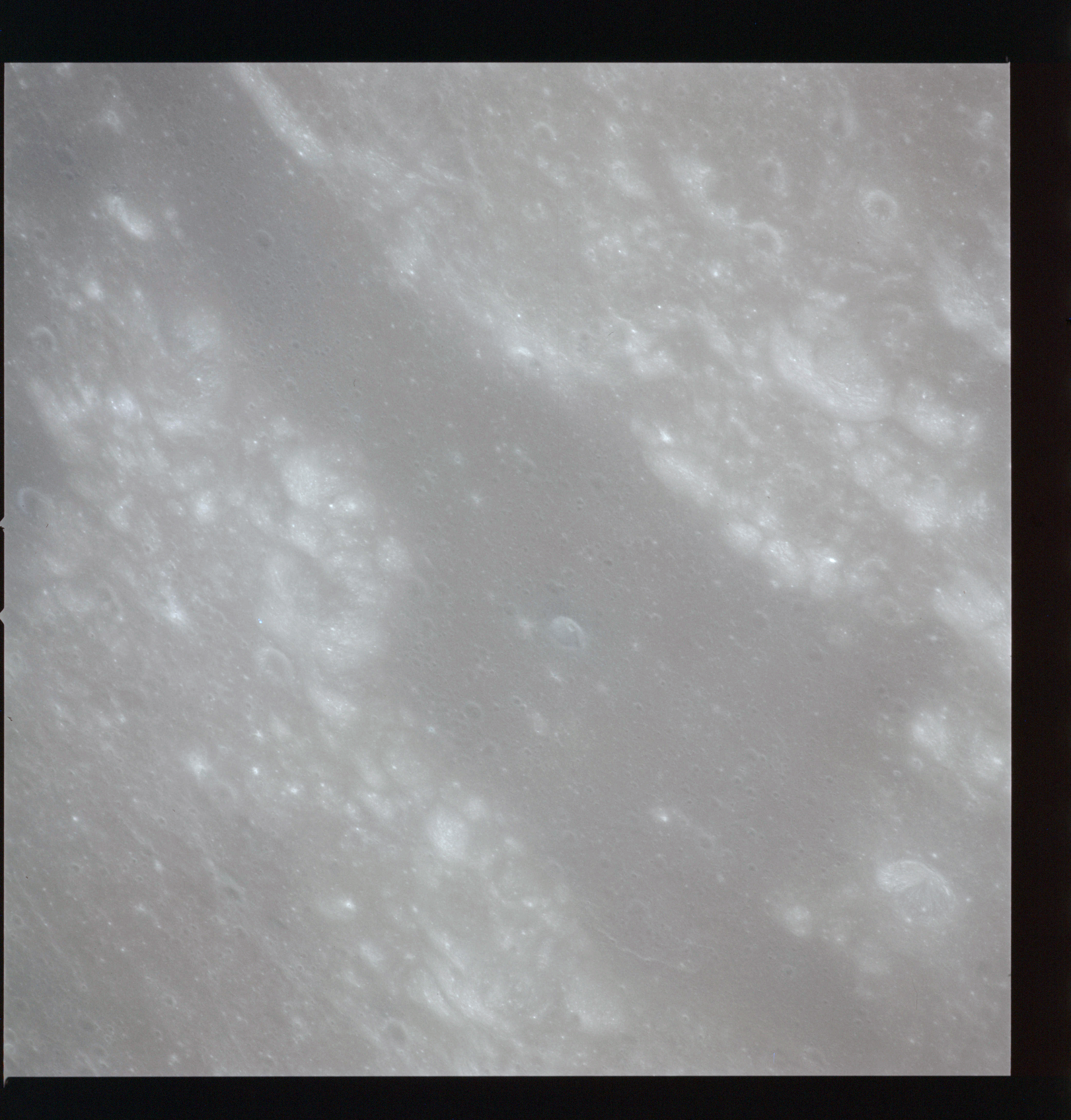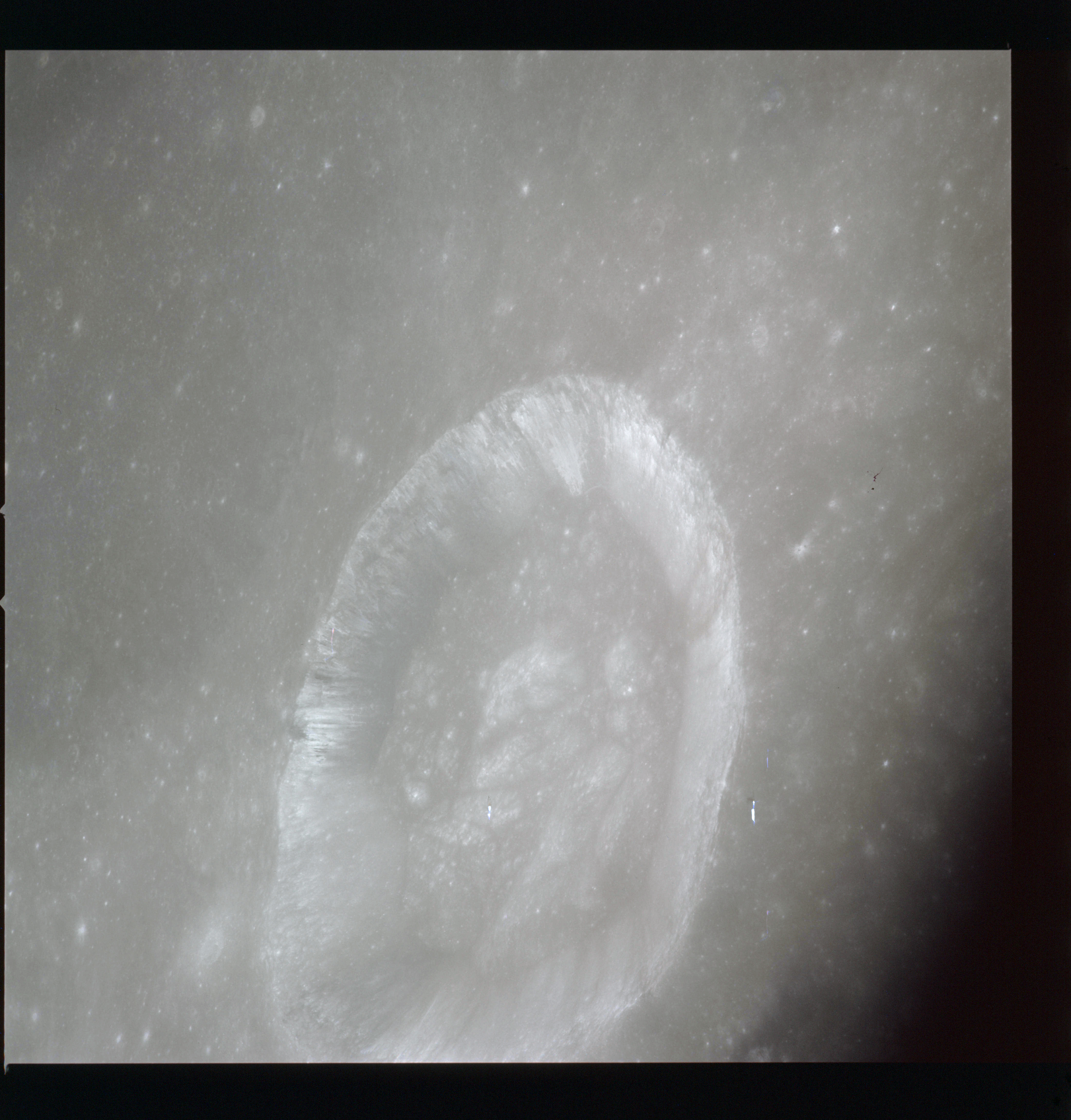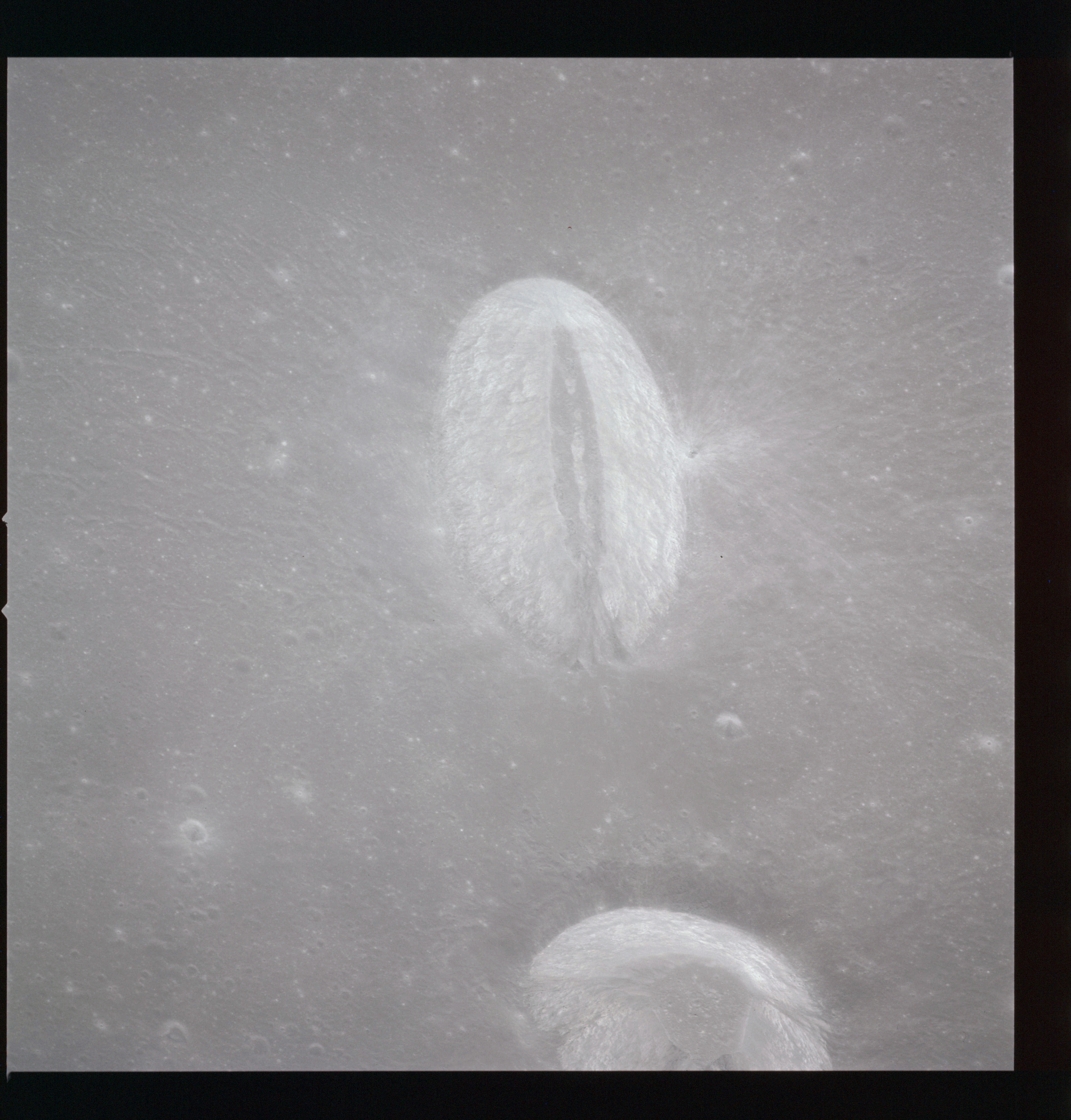 Looking a little to the left, AS15-97-13281 is an oblique shot of Messier asnd Messier A and the unique ray system surrounding the pair.