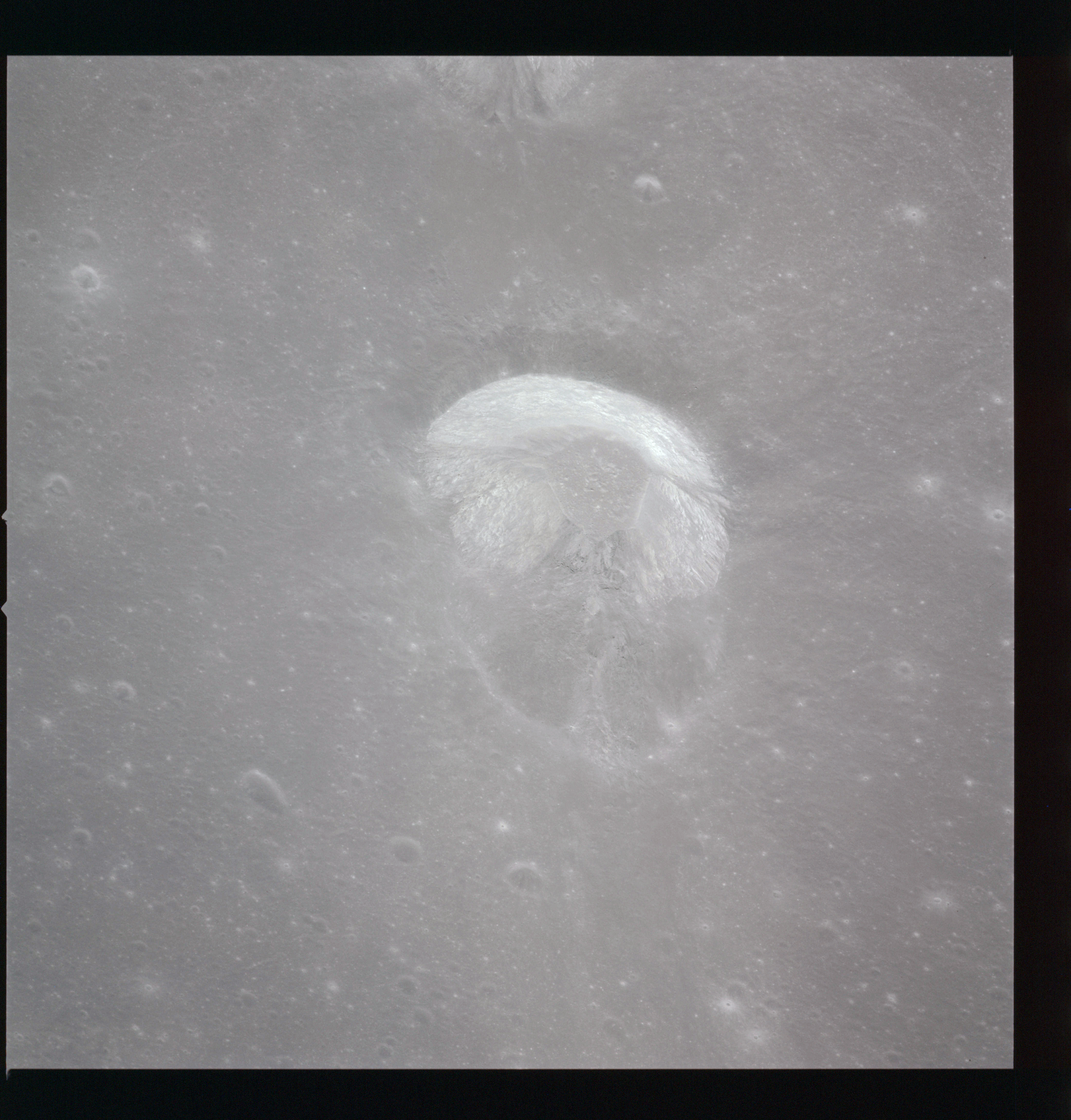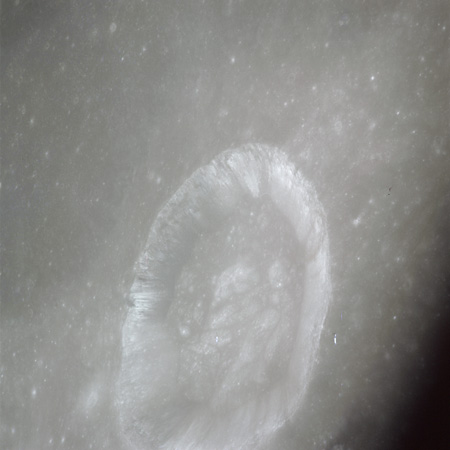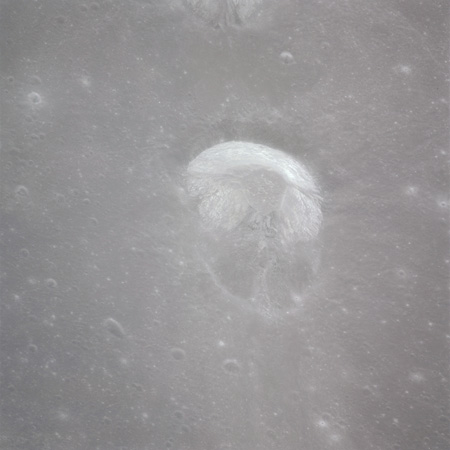 Worden, from 1971 Visual Observation Debrief: "Not the crater itself so much, but the crater was bright. That's an impression you get when you're coming up on it, because the only thing you see is the ejecta pattern. And that comes right straight at you out of the darkness as you're going over it. ... The inside of it is fairly bright too. But the thing that really catches your eye is this ejecta pattern that's out around it, with that big long tail that sticks out to the southwest. ... Cobra-Head looks like nothing but just a sheer cliff around there."