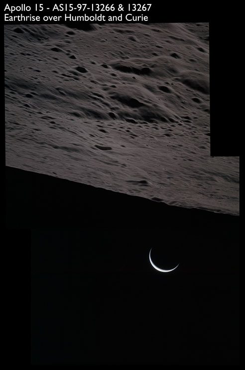 Composite image of Al Worden's Earthrise. Northwest rim of crater Humboldt is on the horizon. Crater Curie is in the foreground - Source images by NASA/Johnson Space Center.