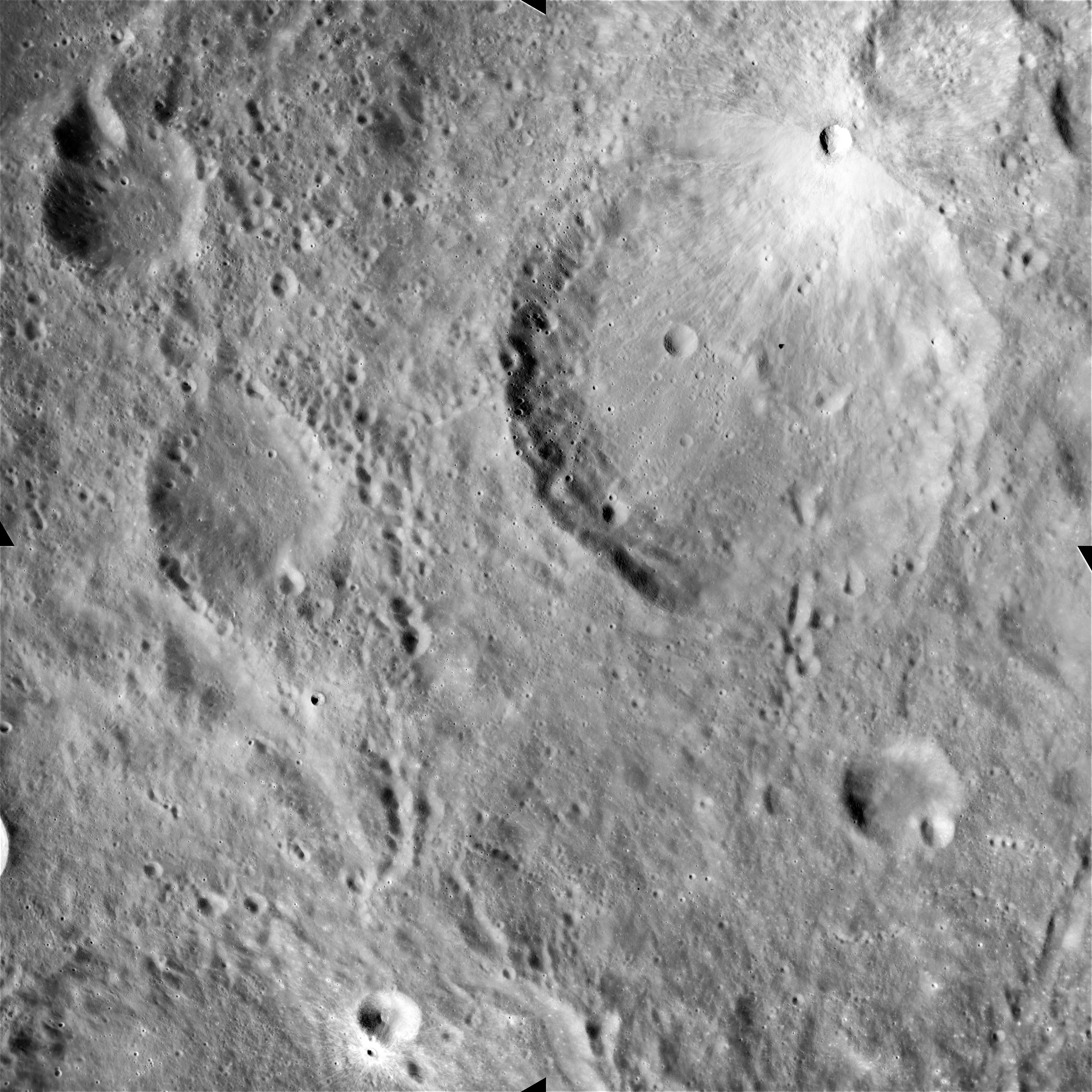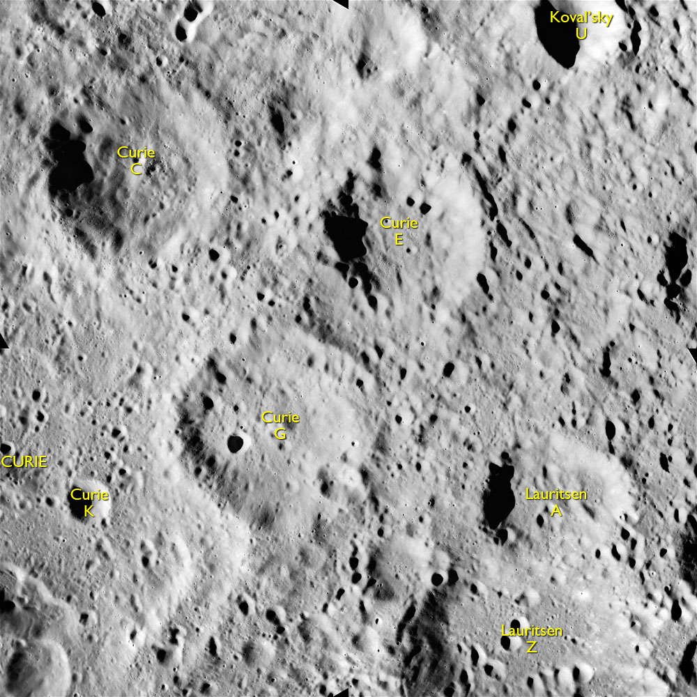 AS15-M-2364 - Metric Camera image of craters Curie C, E and G and Lauritsen A. Image taken at about 214:26. (250 megapixel version), (labelled version) - Image by NASA/ASU.