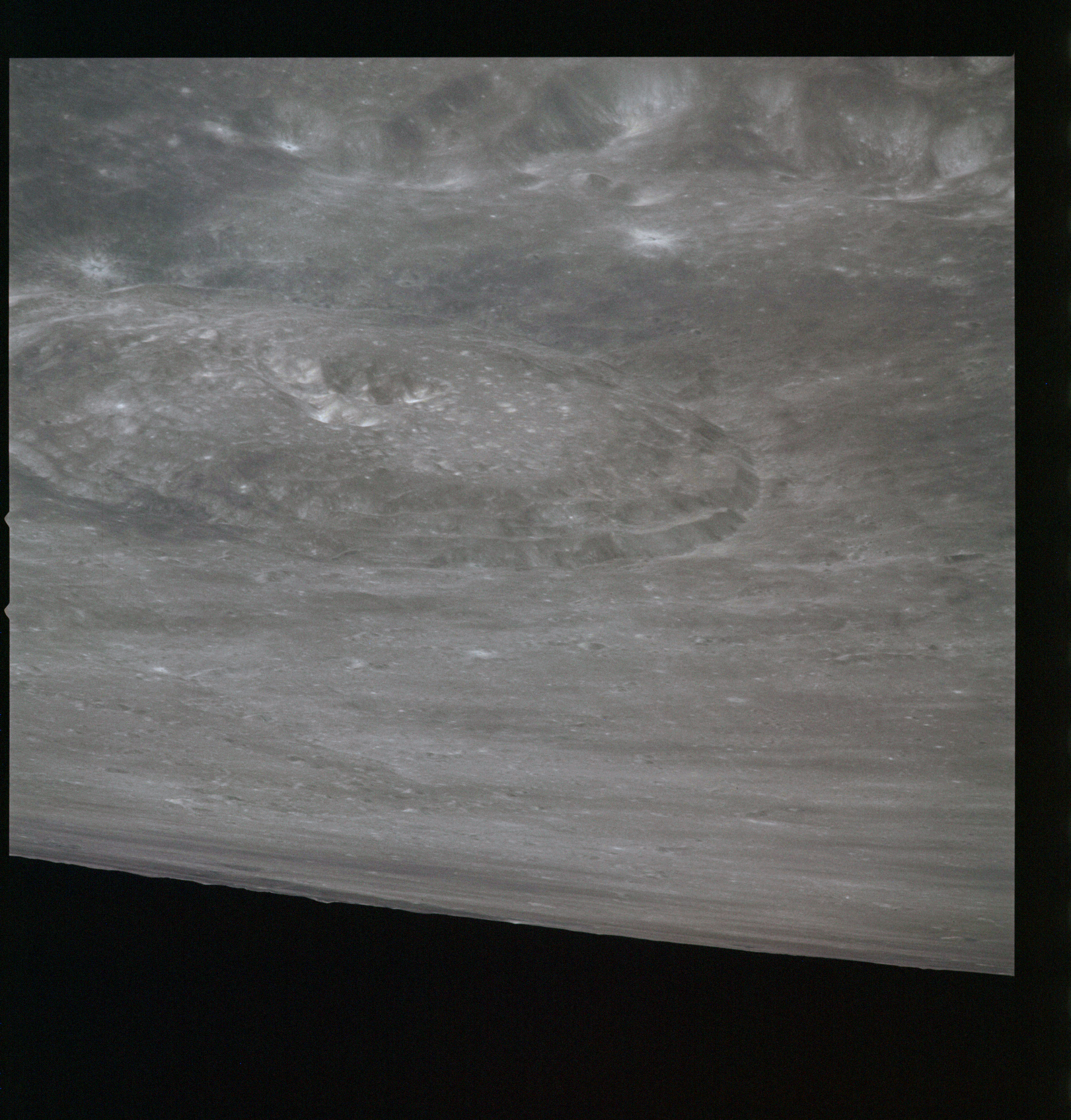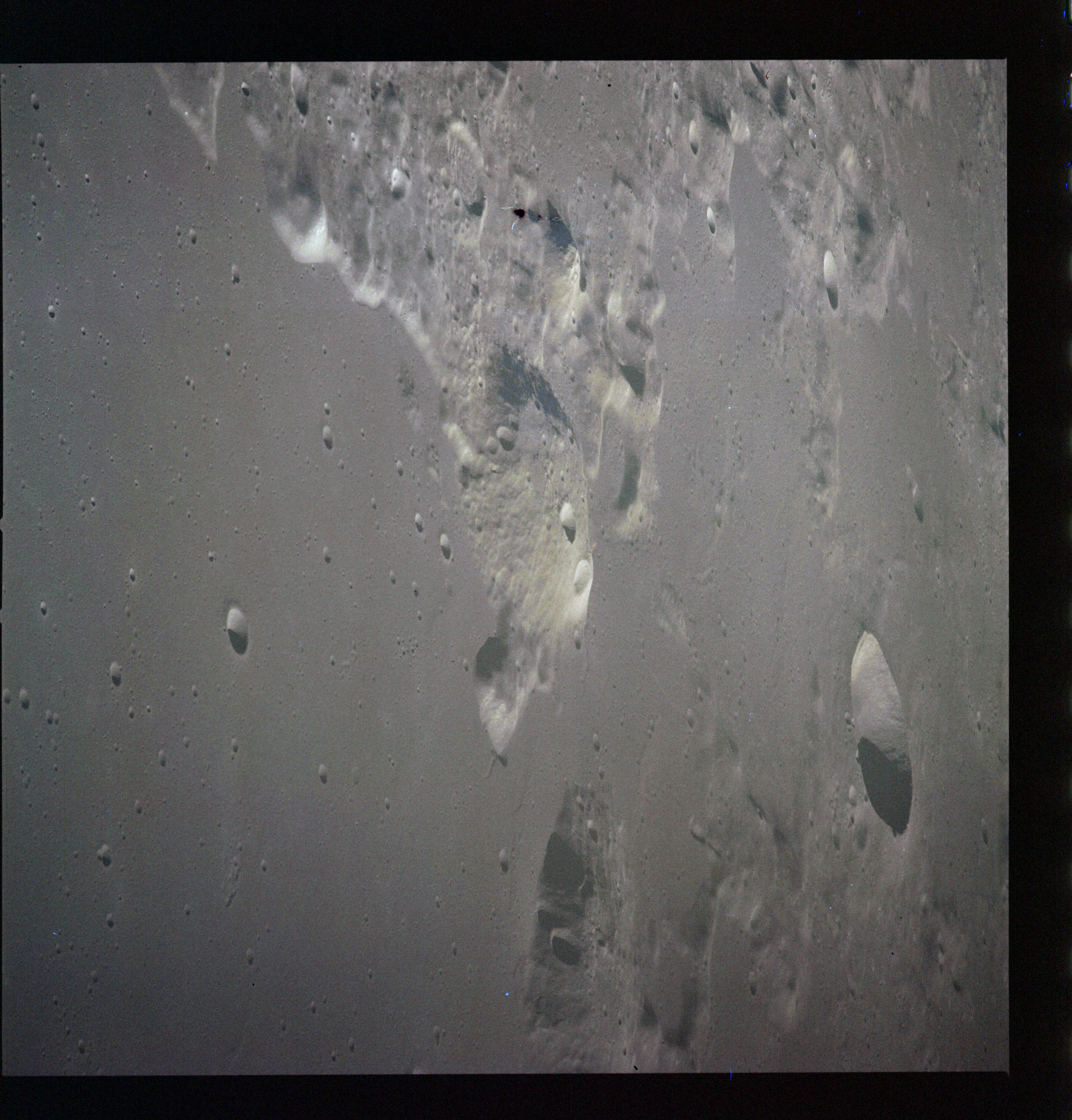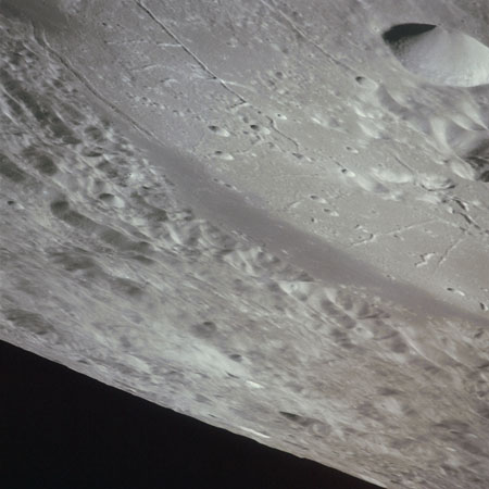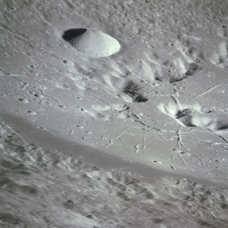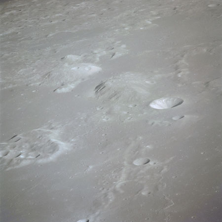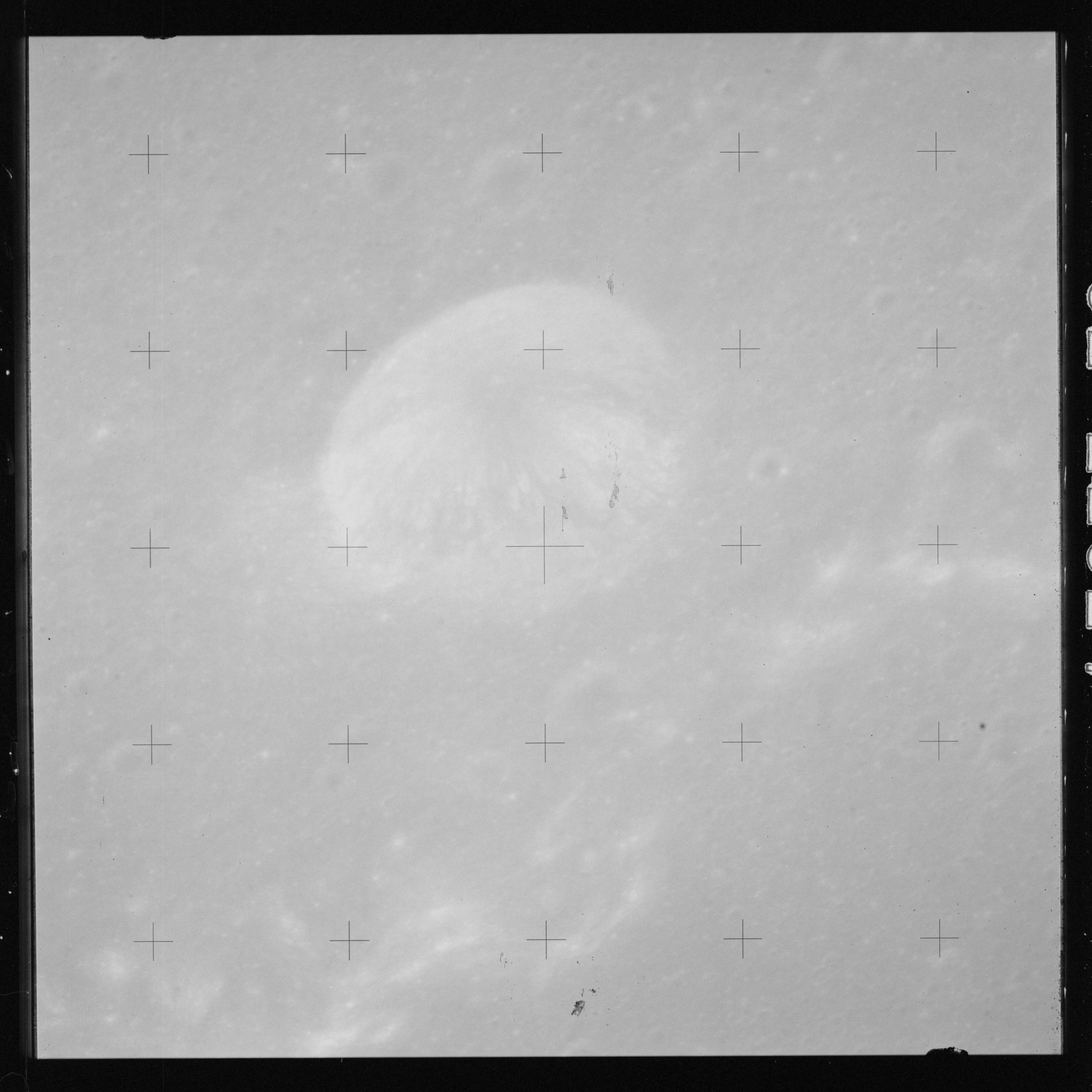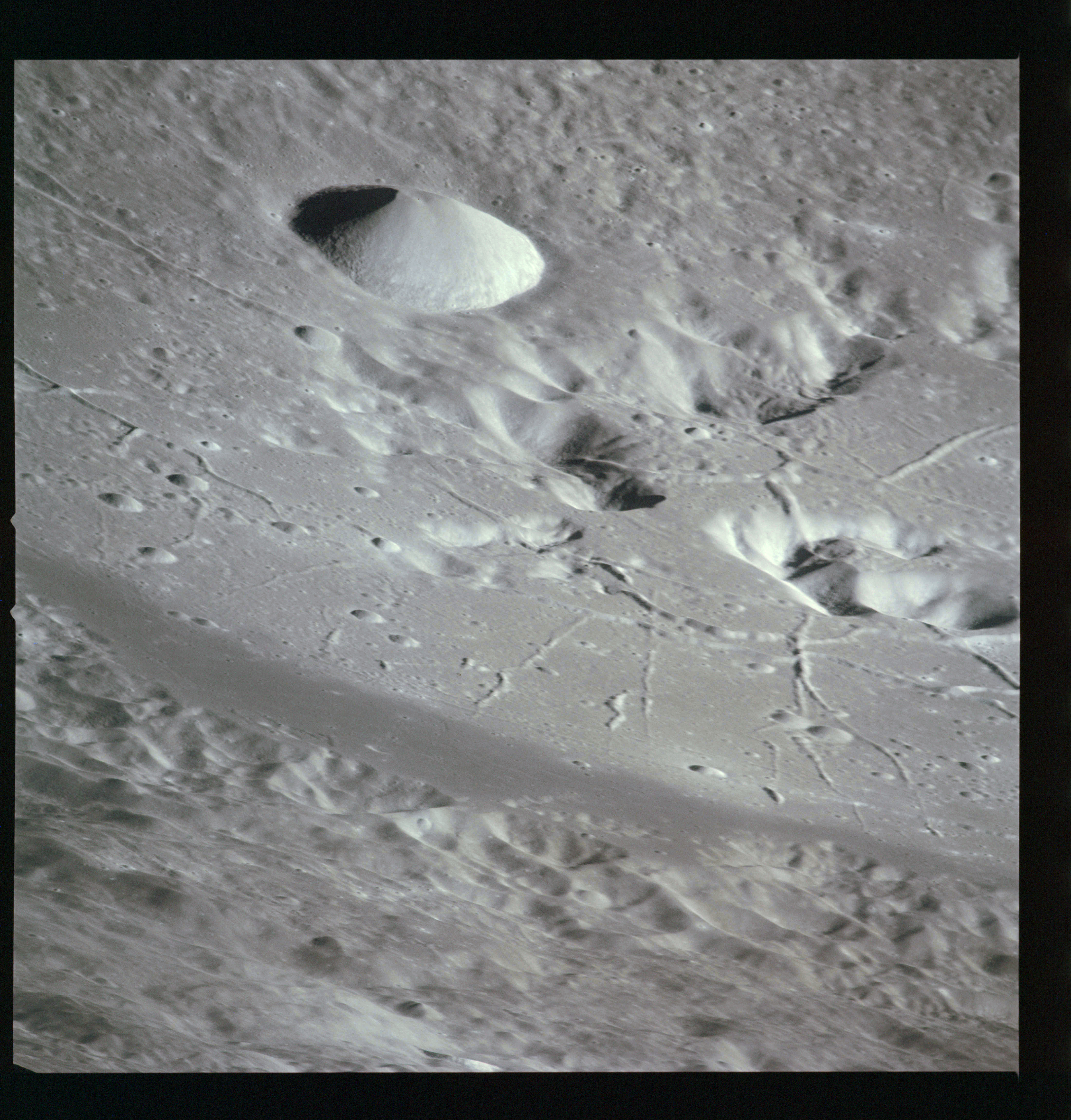 The 16-kilometre crater after which so many of these features are named is nicely framed in AS15-93-12719. Franz von Paula Gruithuisen, 1774-1852, was a German astronomer who pioneered lunar study in two opposing ways. He was the first to postulate an impact theory to explain the lunar craters, an idea now very widely accepted. However, through his active imagination, he announced the discovery of buildings and cities on the Moon, writing a book on the subject. Centuries later, there are still people who claim to detect non-human intelligent artifacts through close study of the imagery from manned and unmanned photography of the lunar surface, a concept that is very widely rejected. To the northwest of Gruithuisen is a large, dense cluster of small craters. These are likely to be secondary craters formed by the impact of a loose clump of debris, themselves ejected from a large, distant impact.