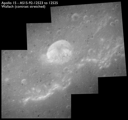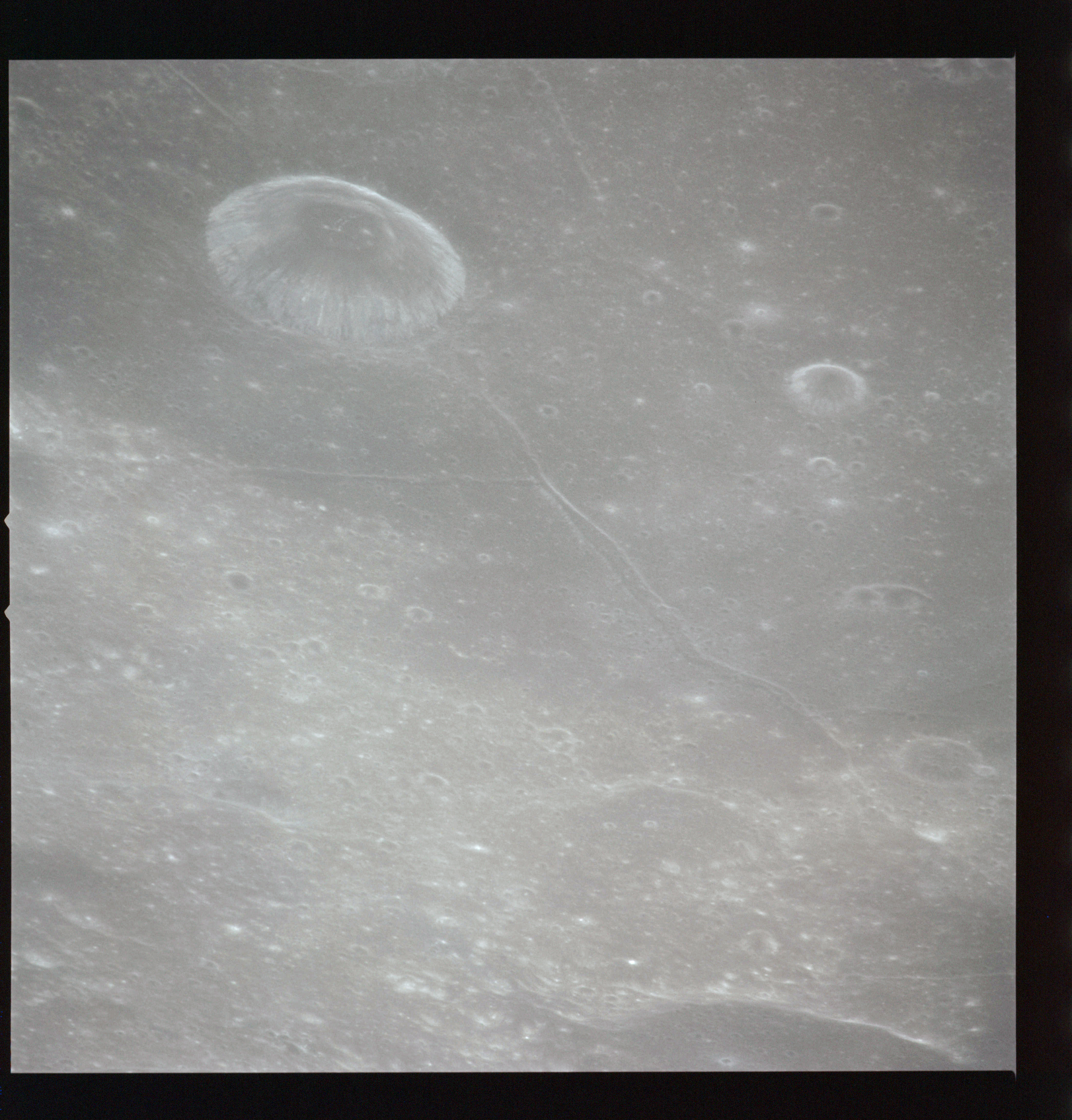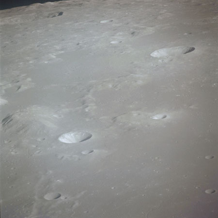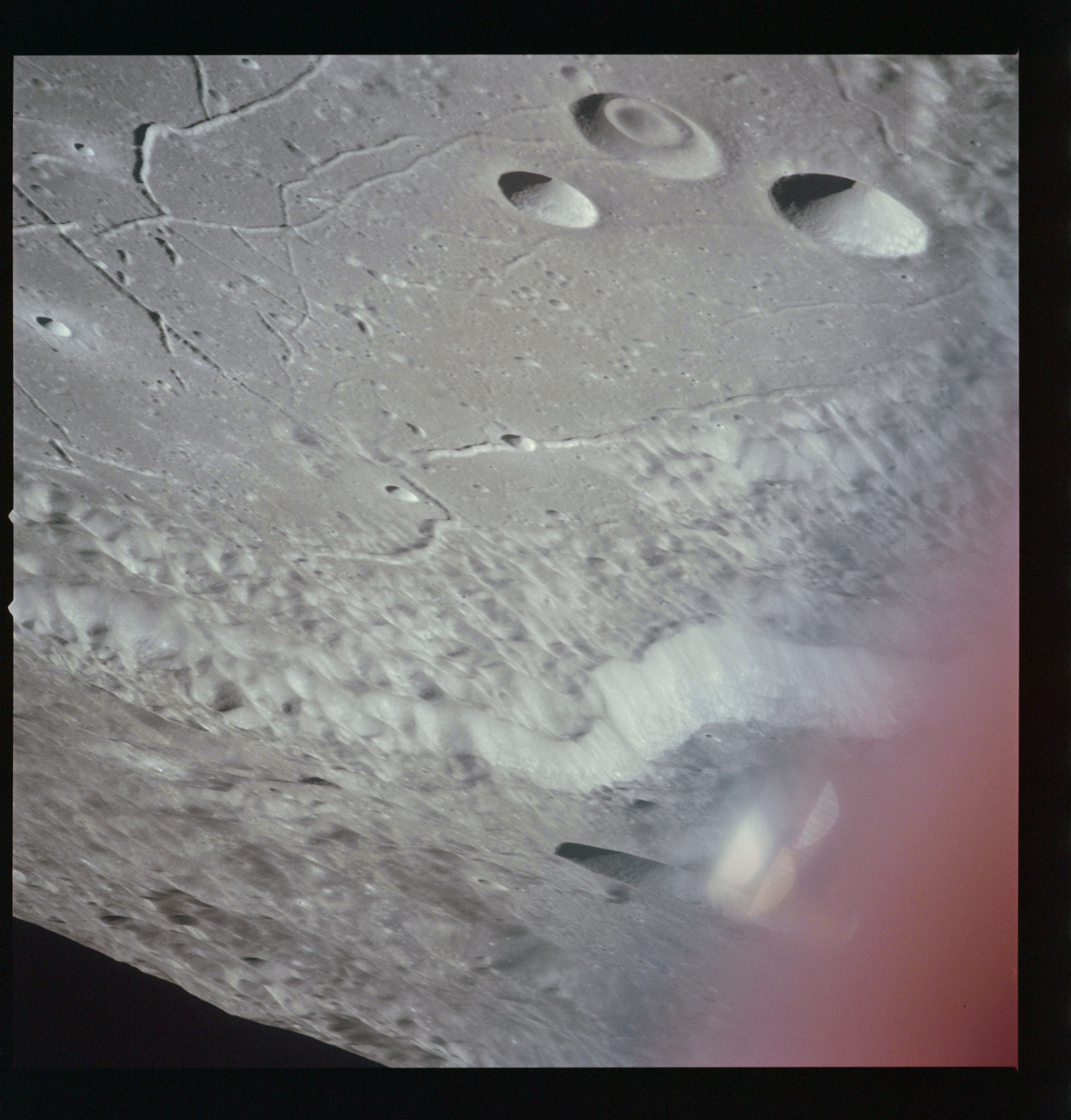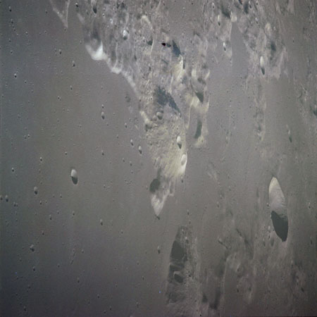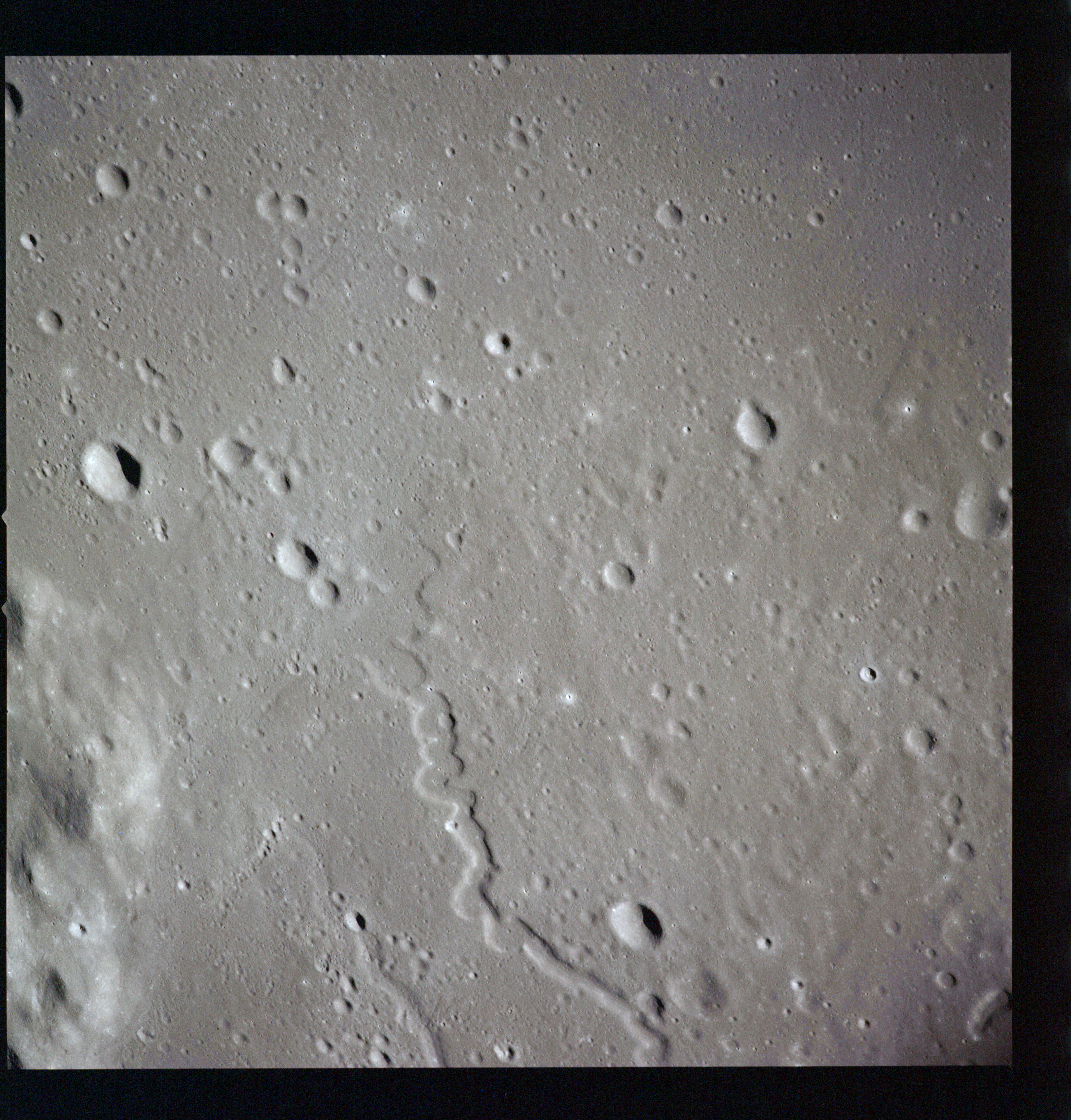 The 16-kilometre crater after which so many of these features are named is nicely framed in AS15-93-12719. Franz von Paula Gruithuisen, 1774-1852, was a German astronomer who pioneered lunar study in two opposing ways. He was the first to postulate an impact theory to explain the lunar craters, an idea now very widely accepted. However, through his active imagination, he announced the discovery of buildings and cities on the Moon, writing a book on the subject. Centuries later, there are still people who claim to detect non-human intelligent artifacts through close study of the imagery from manned and unmanned photography of the lunar surface, a concept that is very widely rejected. To the northwest of Gruithuisen is a large, dense cluster of small craters. These are likely to be secondary craters formed by the impact of a loose clump of debris, themselves ejected from a large, distant impact.