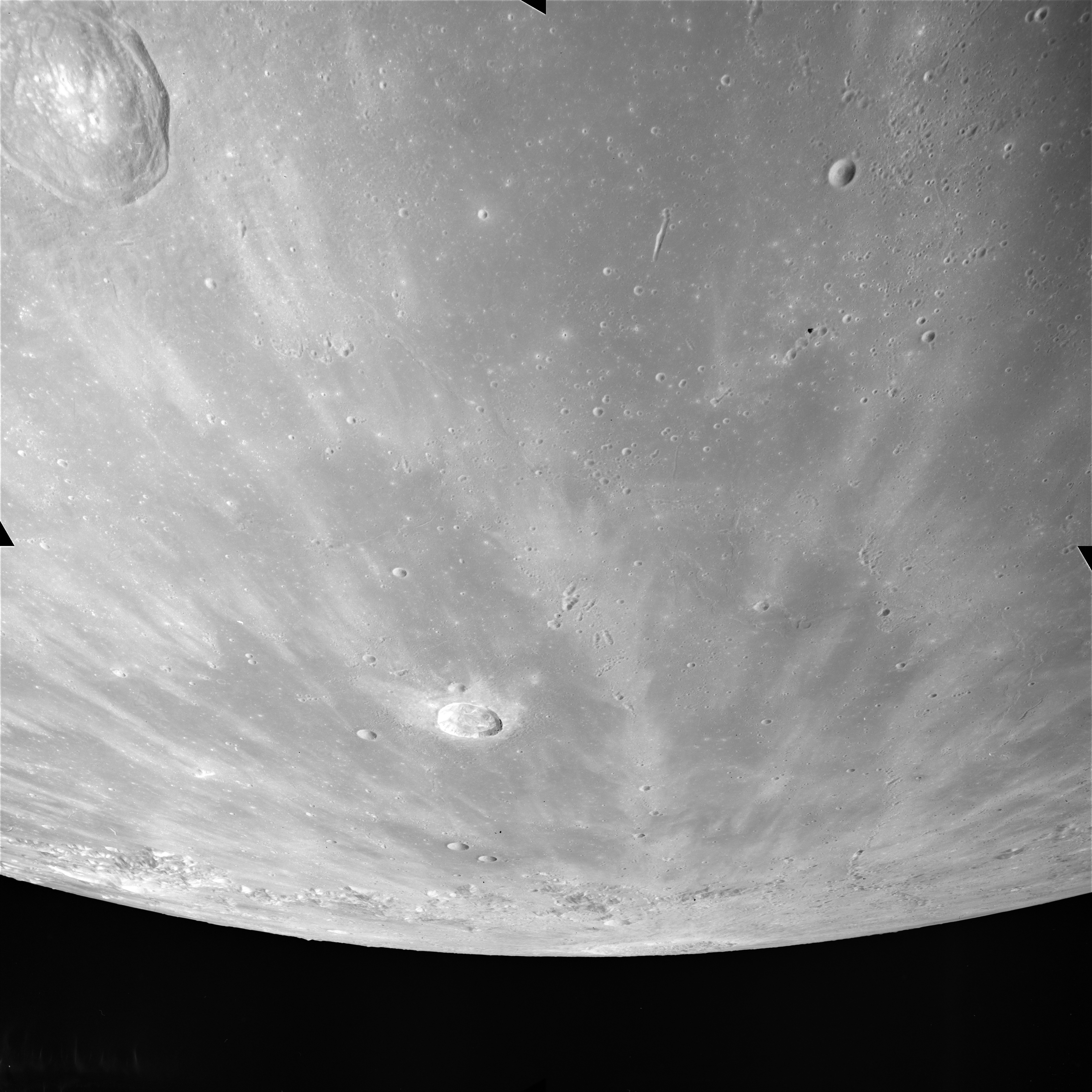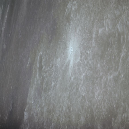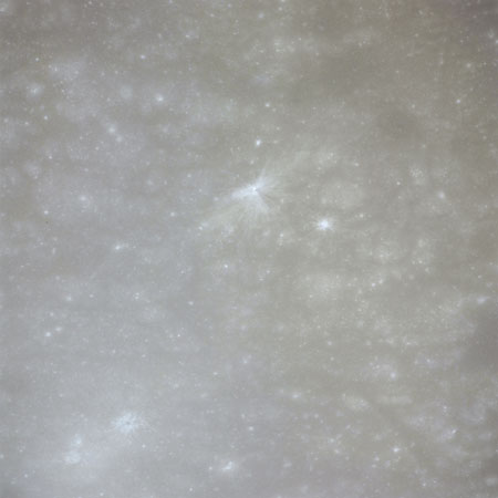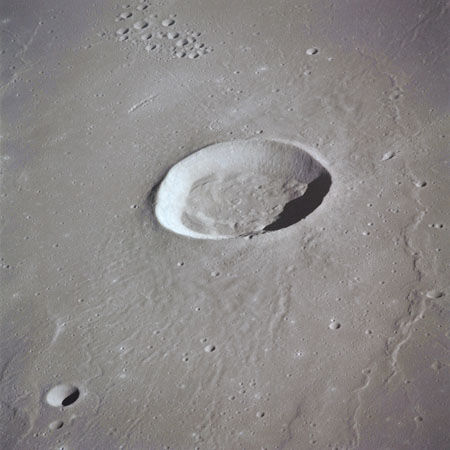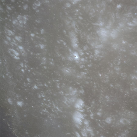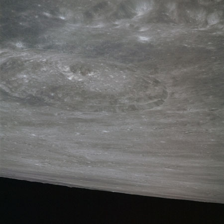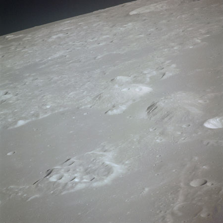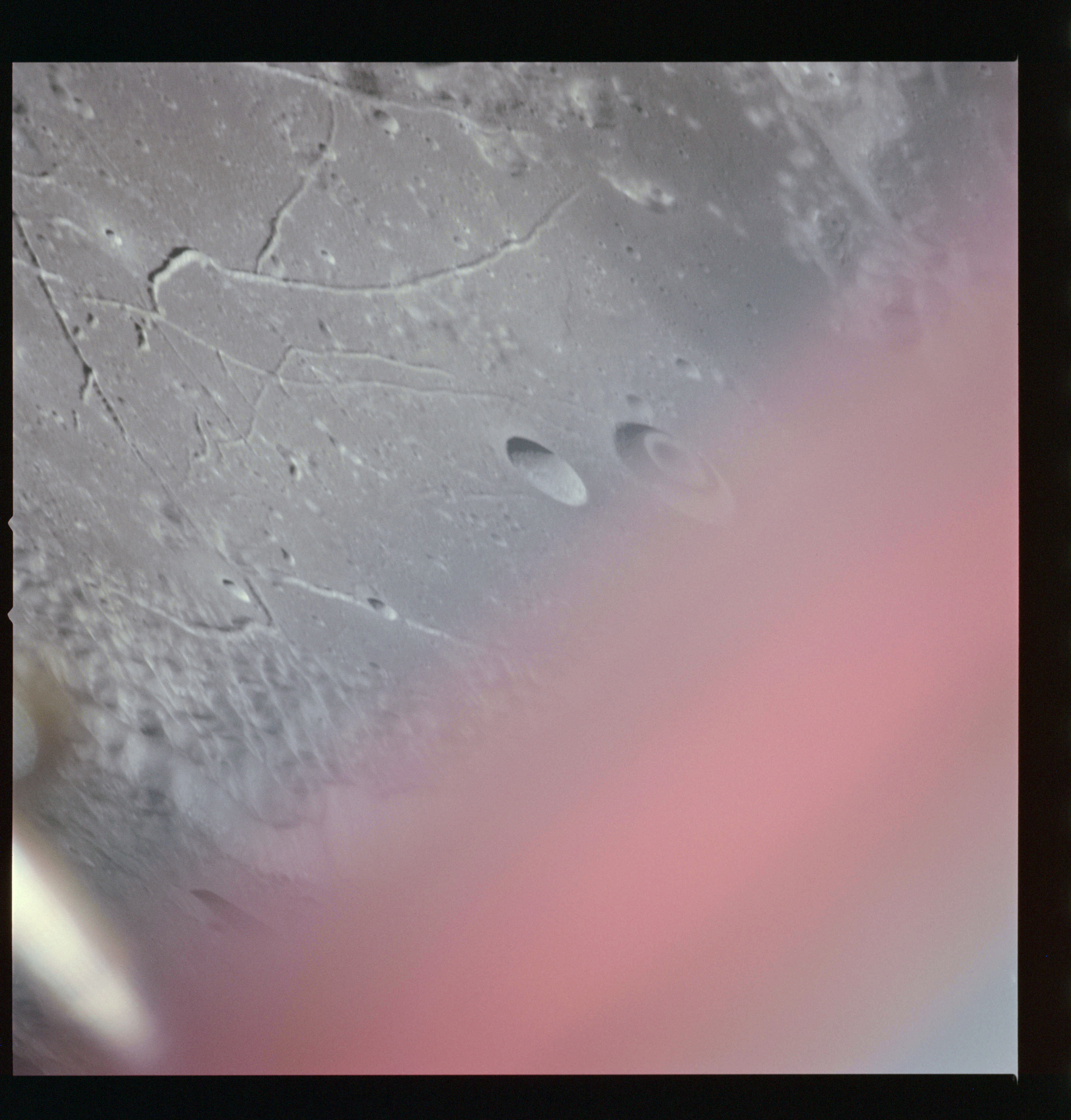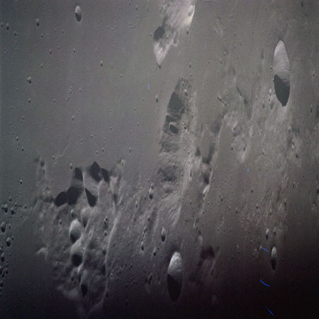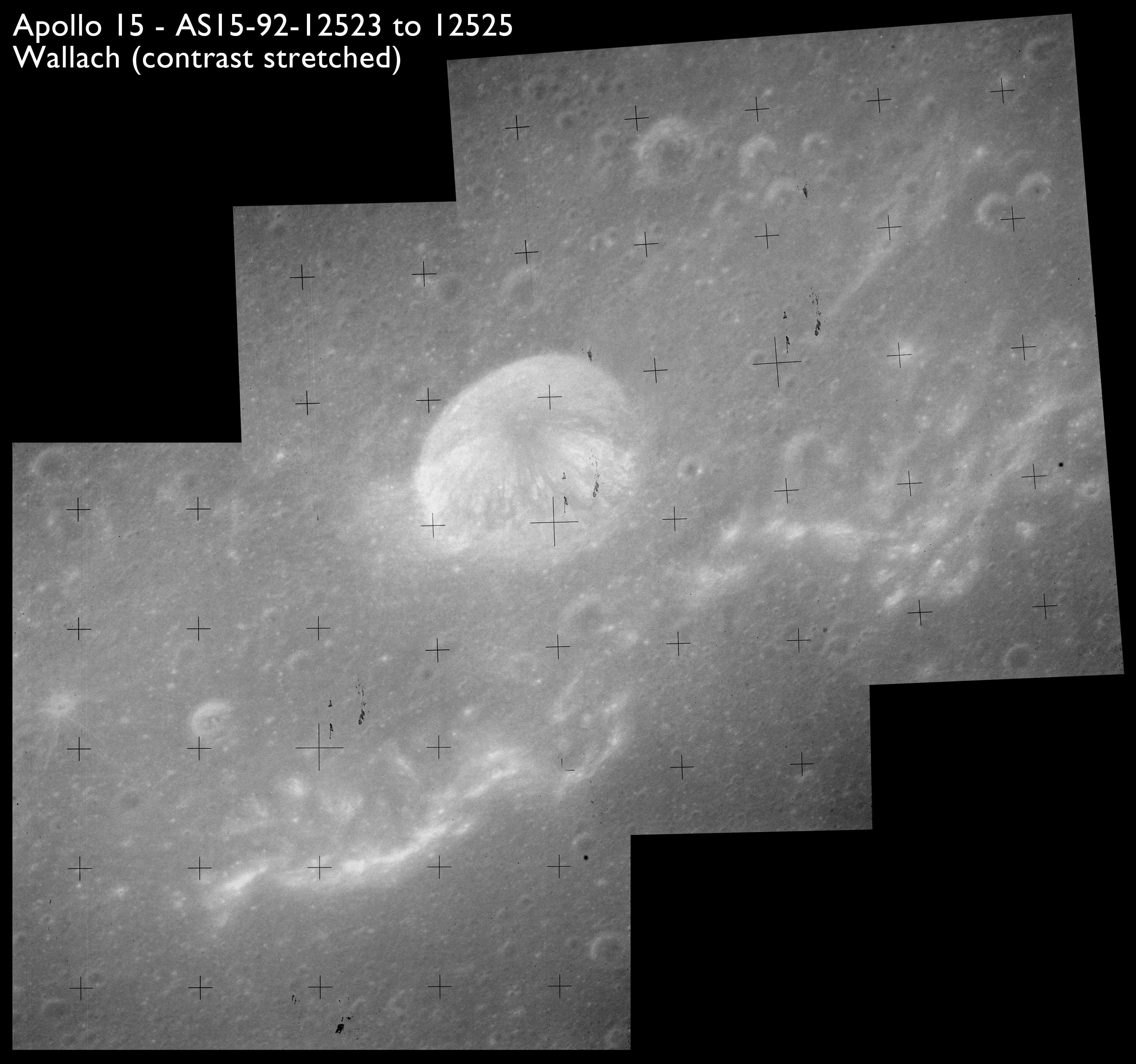 The 16-kilometre crater after which so many of these features are named is nicely framed in AS15-93-12719. Franz von Paula Gruithuisen, 1774-1852, was a German astronomer who pioneered lunar study in two opposing ways. He was the first to postulate an impact theory to explain the lunar craters, an idea now very widely accepted. However, through his active imagination, he announced the discovery of buildings and cities on the Moon, writing a book on the subject. Centuries later, there are still people who claim to detect non-human intelligent artifacts through close study of the imagery from manned and unmanned photography of the lunar surface, a concept that is very widely rejected. To the northwest of Gruithuisen is a large, dense cluster of small craters. These are likely to be secondary craters formed by the impact of a loose clump of debris, themselves ejected from a large, distant impact.