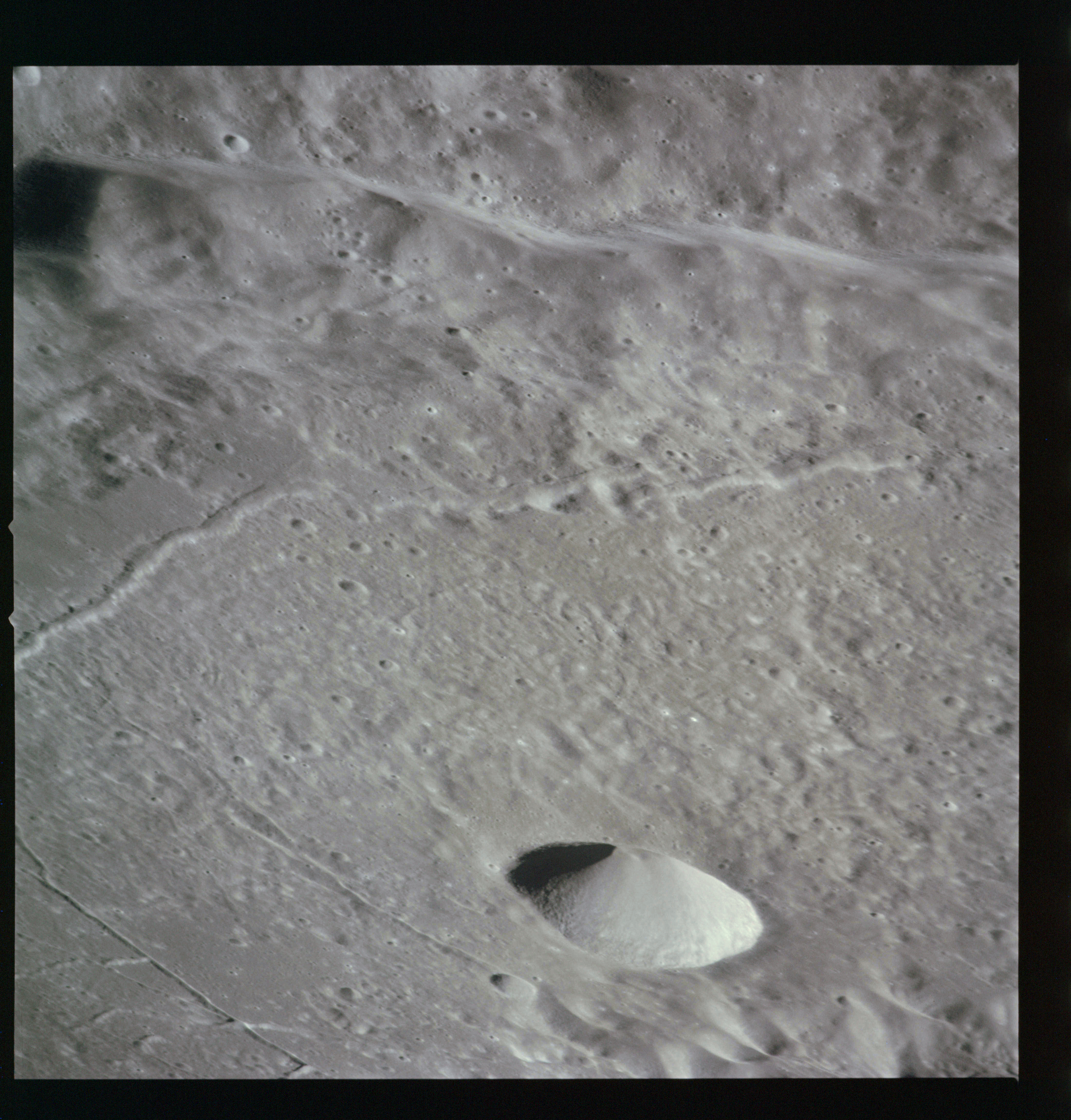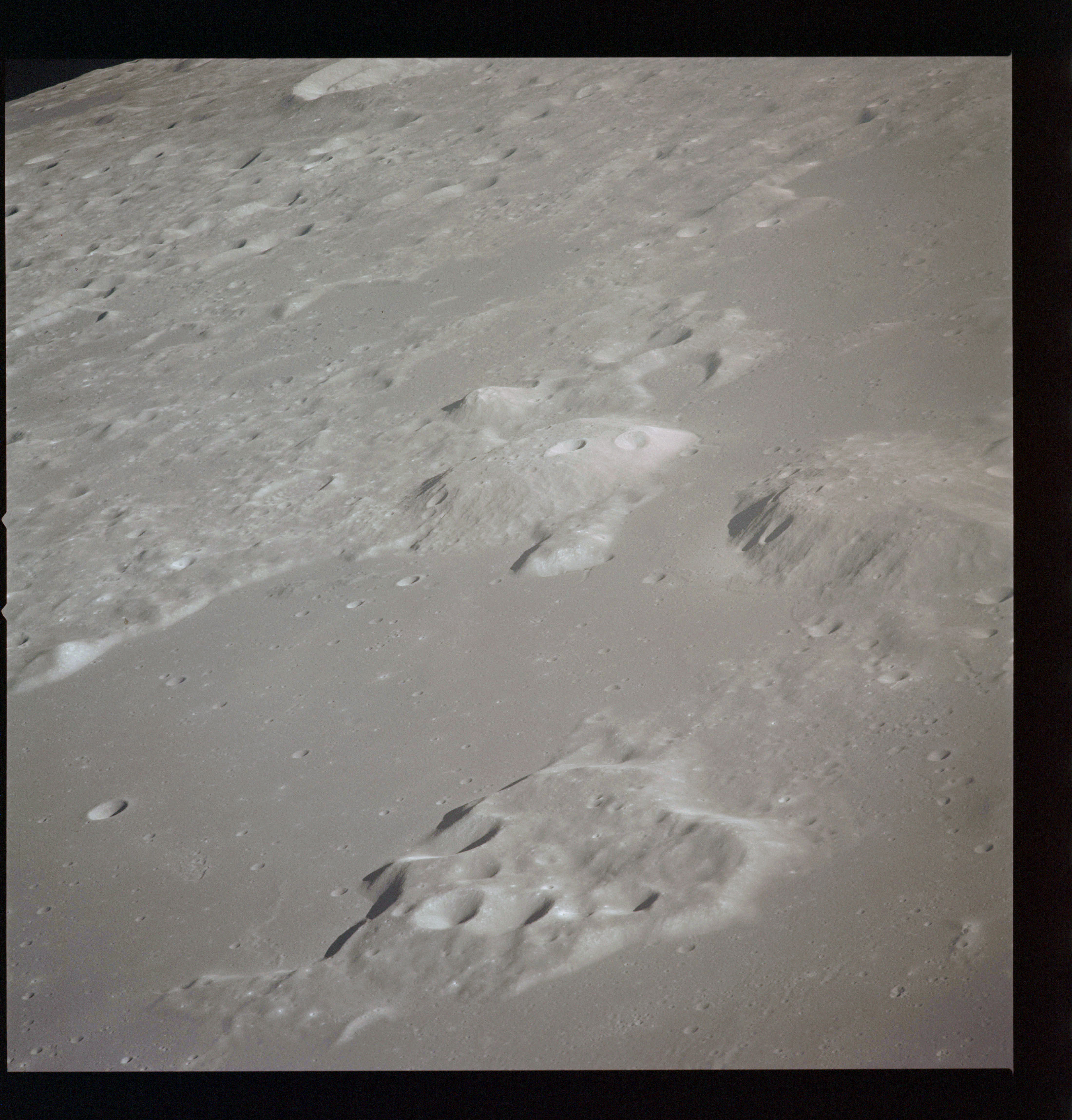 The Gruithuisen domes are well shown in AS15-93-12717 with Gruithuisen B to the right. The 900-metre craterlet atop Mons Gruithuisen Gamma is easily apparent. Mons Gruithuisen Zeta is at bottom left and is not dome-like in profile. It rises only about half of the height of the other two mountains.