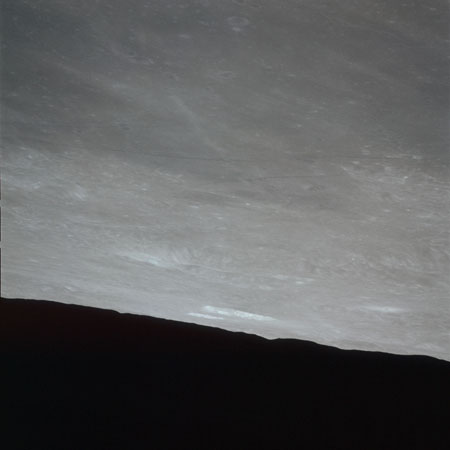 This is Apollo Control at 217 hours, 34 minutes. Endeavour's gone behind the Moon on the 71st revolution and we've had Loss Of Signal. And a Lunar Surface Science briefing is beginning now in the main MSC auditorium.