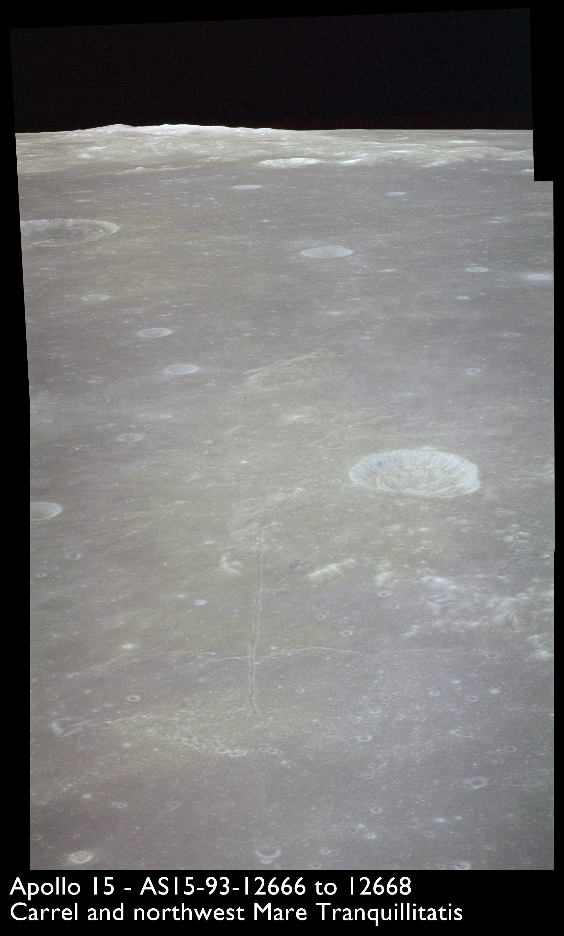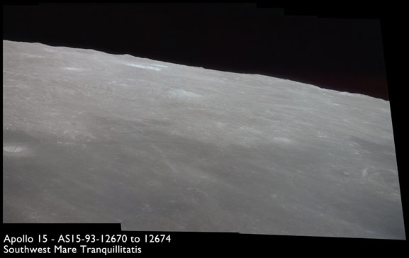The next five images, AS15-93-12730 to 12734, look north/northwest along the eastern shore of Oceanus Procellarum. All include Rima Mairan and the first four show Mairan T, an isolated hill rising about 700 metres above the mare, but with an irregular depression at its summit.