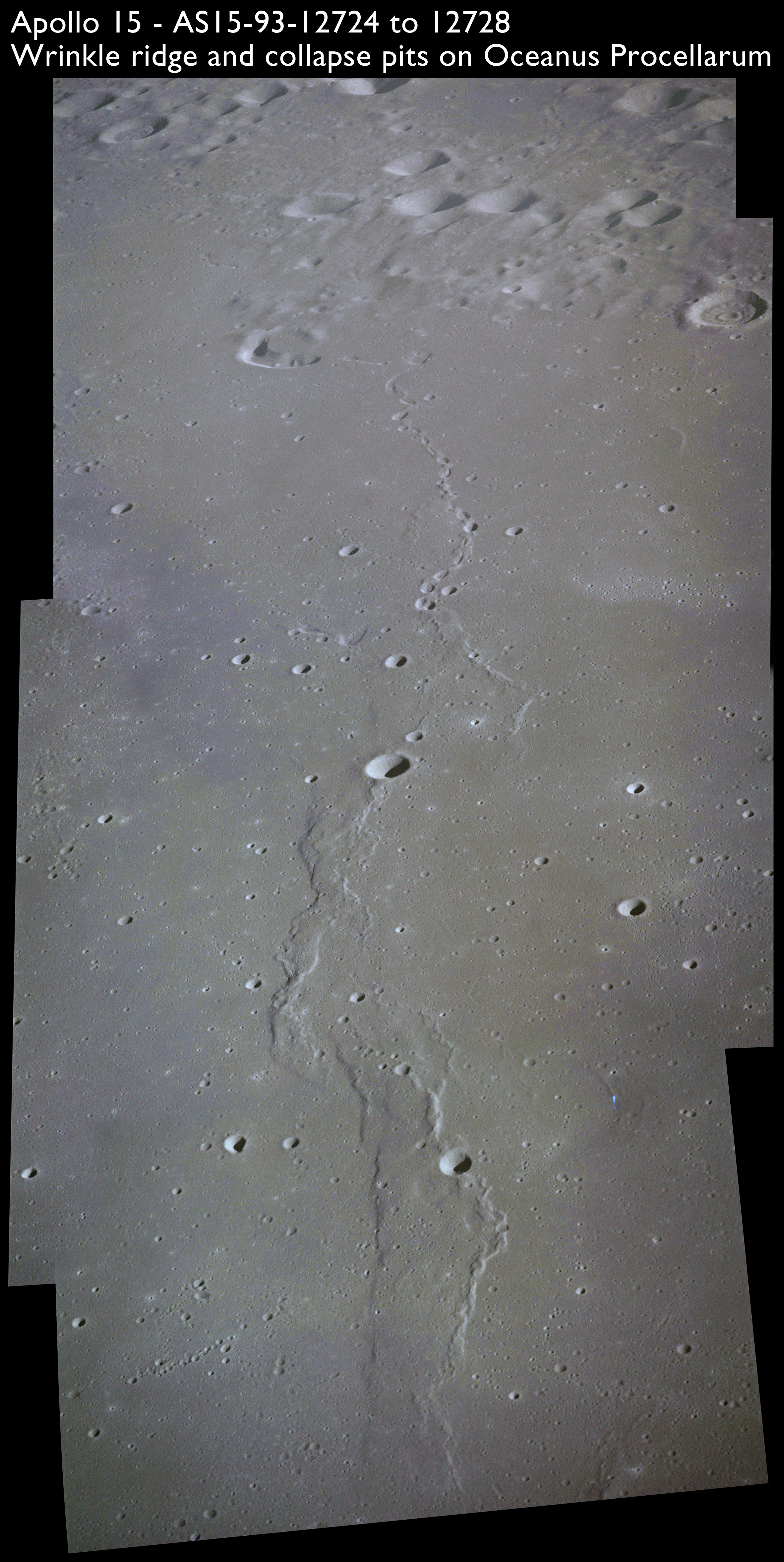 The next set of frames, AS15-93-12724 to 12728, follow a wrinkle ridge northwards across Oceanus Procellarum to where it becomes a string of collapsed pits, presumeably betraying a lava tube.