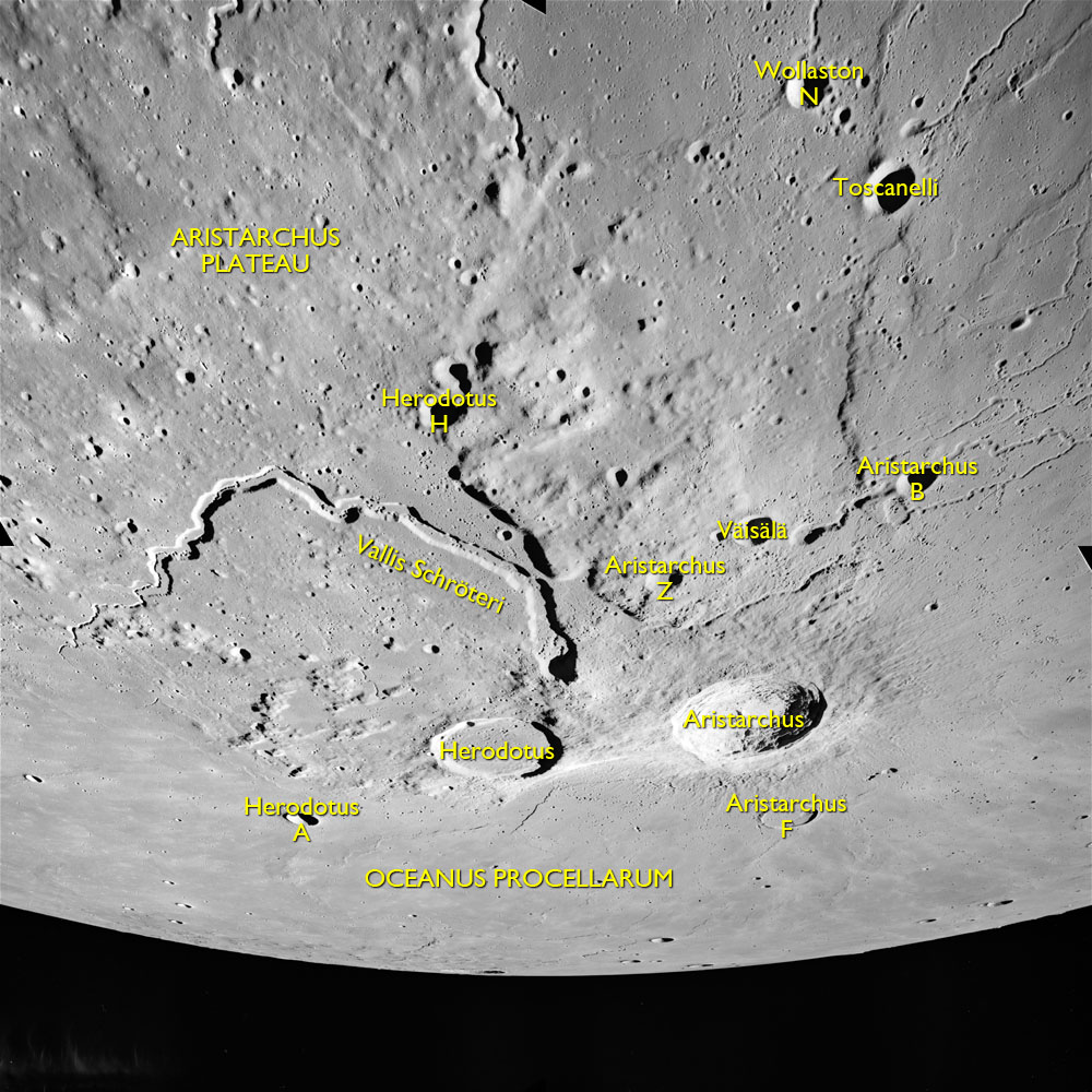 AS15-M-2610 - South oblique Metric Camera image of the Aristarchus Plateau and Oceanus Procellarum, including craters Aristarchus and Herodotus. Image taken at about 217:11. (250 megapixel version), (labelled version) - Image by NASA/ASU.