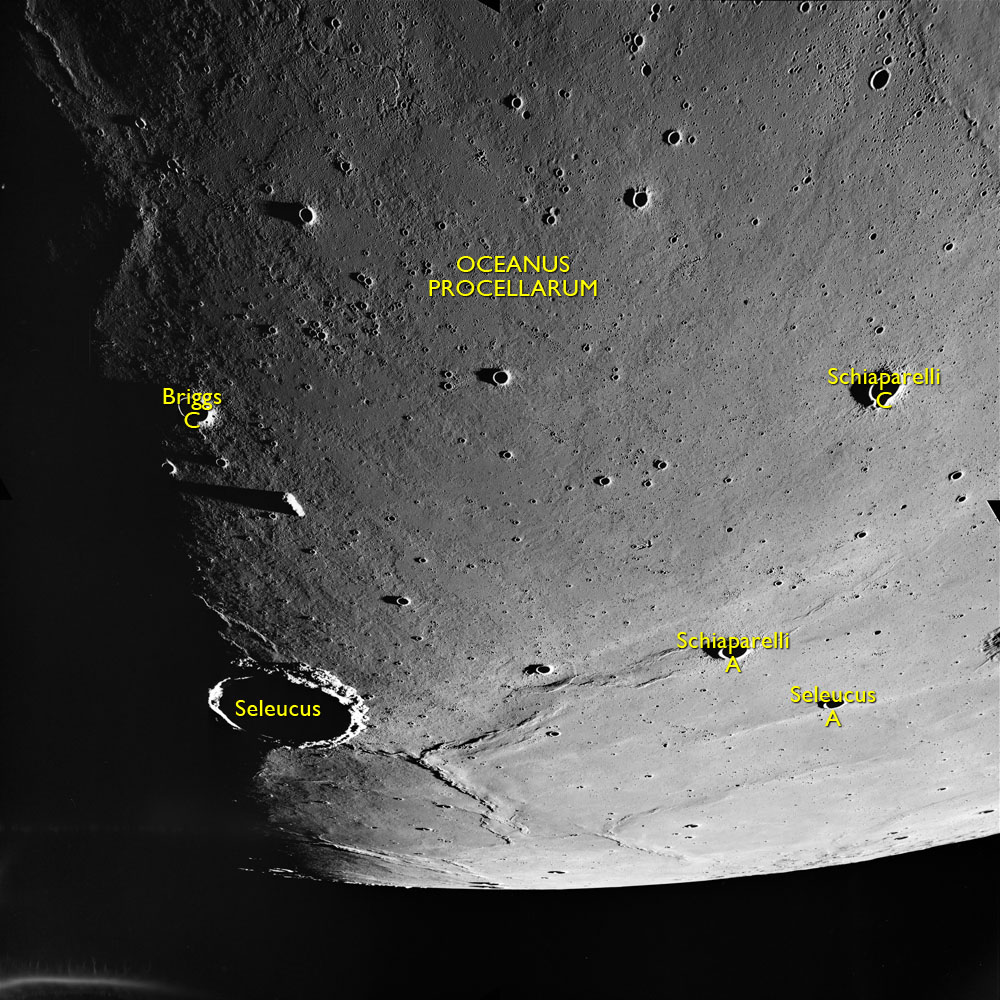 AS15-M-2622 - South oblique Metric Camera image of Oceanus Procellarum and the sunrise terminator including crater Seleucus and the sunlit eastern rim of crater Briggs. Image taken at about 217:17. (250 megapixel version), (labelled version) - Image by NASA/ASU.