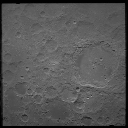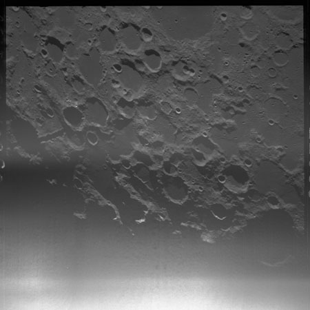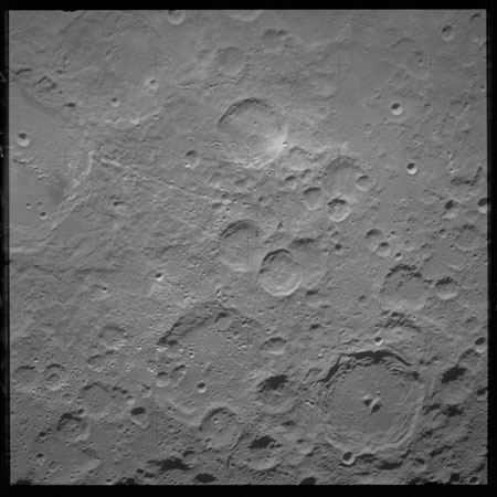 Although frame AS15-95-12980 is partially obscured, it manages to view some of the landscape near the Moon's south pole. Of particular note is Vallis Schrödinger, an enormous gash, 310 kilometres long, that cuts clean across Sikorsky crater on its way to a giant crater off the edge of the frame, also named after the Austrian physicist, Erwin Schrödinger, 1887-1961. Many of the craters towards the right of this frame have floors filled with mare-type material and are considered part of Mare Australe (Southern Sea), especially Lyot, named after a French astronomer, Bernard Lyot, 1897-1952.