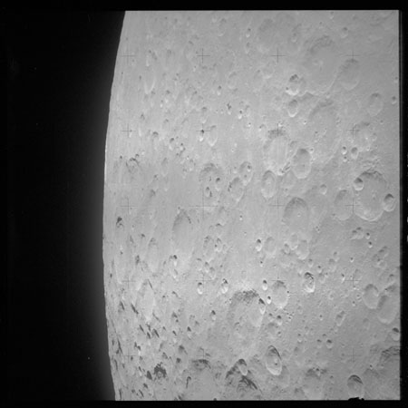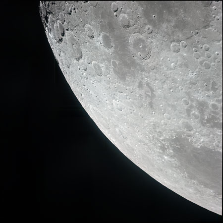 By this time, Endeavour is about 2,300 nautical miles (4,300 km) from the Moon. The occasional photography that the crew have been carrying out since TEI continues with four images taken on colour magazine Q using a 250mm lens.