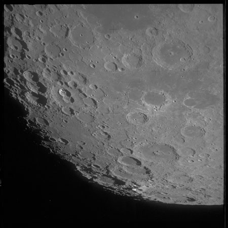 Mare Crisium is well shown in AS15-95-12999. From Earth, we are used to seeing this mare heavily foreshortened along its E-W axis. In this picture, the viewpoint foreshortens its N-S axis instead, but it also suggests the truth that Mare Crisium is indeed elliptical in shape along its E-W axis. The ray crater, Proclus, is just to the left and its rays dust the western half of the mare surface.