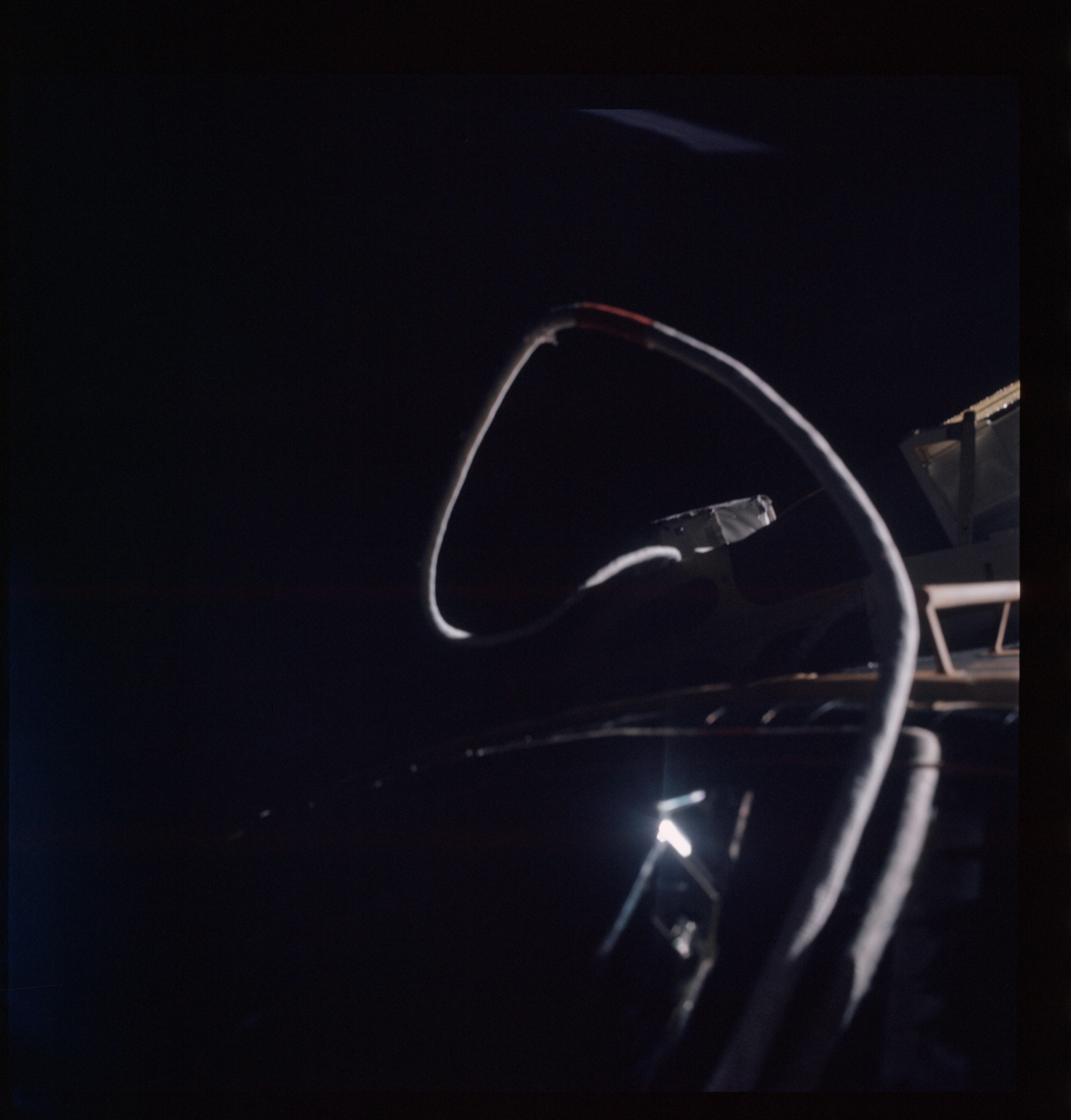 Worden, from the 1971 Technical debrief: "I think the concern at the time was that the Laser Altimeter/Mapping Camera contamination cover was binding against the side - forcing it to stay in the Extend position. I went back out and looked, and there was about three-fourths of an inch to maybe 1 inch clearance between the cover and the Mapping Camera itself. From that, I concluded that the cover hadn't anything to do with it. I looked underneath the Mapping Camera, and I looked around all of the edges to see if there was something binding, maybe something that had lodged alongside the Mapping Camera. Everything looked clean to me. There was nothing that was impinging on the Mapping Camera at all. The stellar shield was still out, but of course, it would be with the camera extended. At that point, it was maybe 12 to 15 inches away from the SIM bay mold line. So, there was nothing I could tell from there that would shed any light on why the Mapping Camera did not retract."