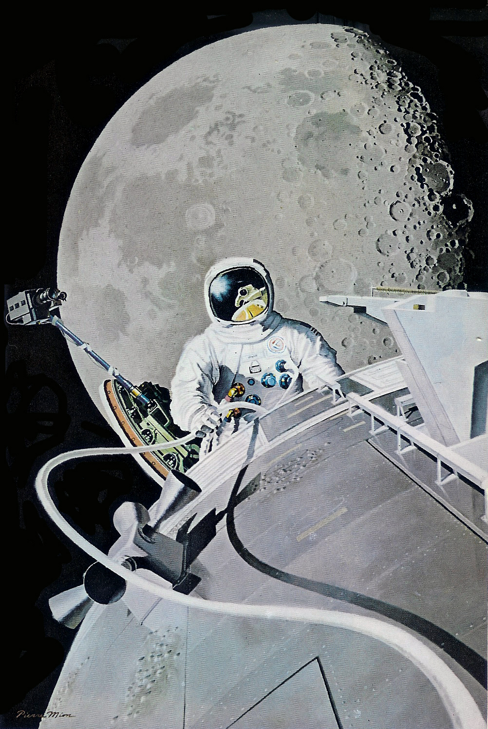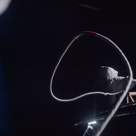 So that Mission Control, and the public too, can watch the progress of Al's excursion along the Service Module, a pole has been provided so that the colour TV camera and the 16-mm movie camera can be mounted far enough from the CM main hatch to gain a reasonable view of his activities around the SIM bay. The pole will be attached to the inside of the open hatch.