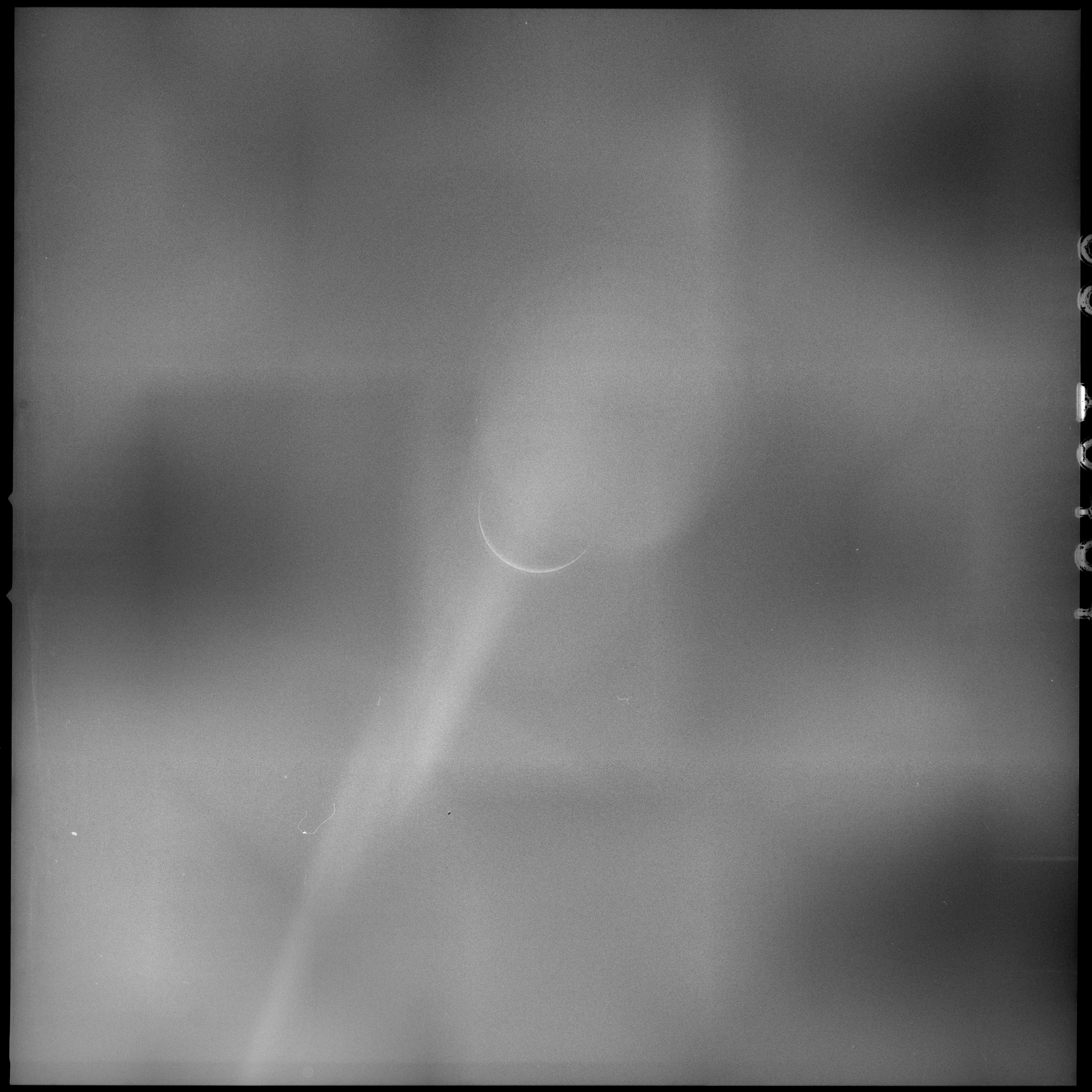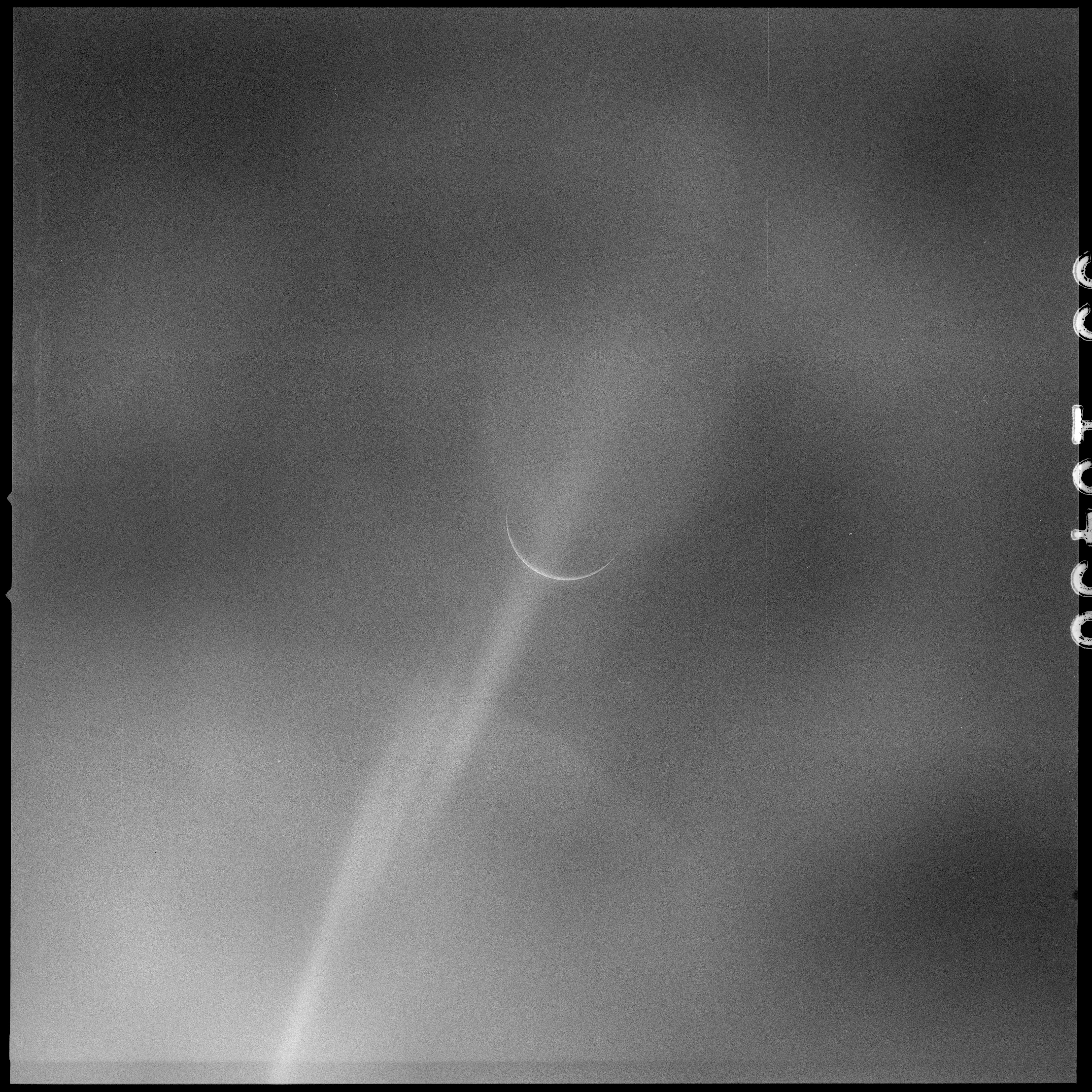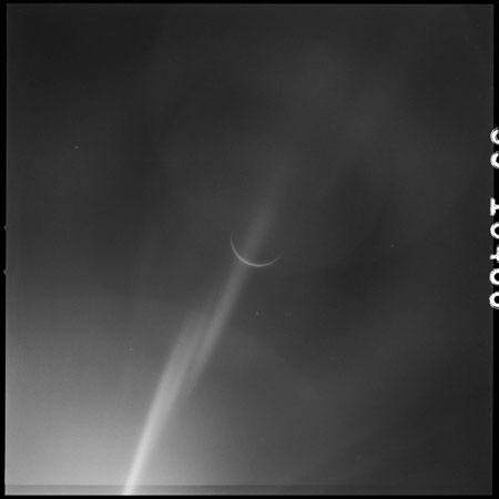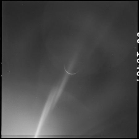 Eight images, AS15-99-13483 to 13490 are planned in this sequence; two each through four filters. In the pair taken through filter 2, the crescent Earth is virtually invisible. Other images in the sequence do show Earth better but a streak of flare, probably caused by the Sun reflecting off wipe marks on the window, runs across the images. With Earth presenting such a thin crescent, the Sun is very near the camera's field of view and causes a lot of light spill. An additional colour frame on magazine Q is taken for comparison. By measurement of the size of Earth's image on the film, the spacecraft's distance is calculated to be about 112,000 nautical miles (207,500 km).