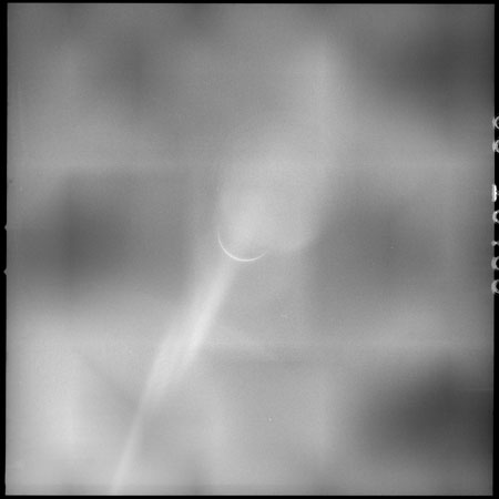 Next, by the Flight Plan, the magazine on the back of the Hasselblad camera body is changed to colour film and a reference shot taken through the same camera/lens combination. An earlier change in the Flight Plan asked for magazine P to be used instead of M. However, this magazine was finished three orbits before Endeavour left the Moon. Magazine Q is substituted.