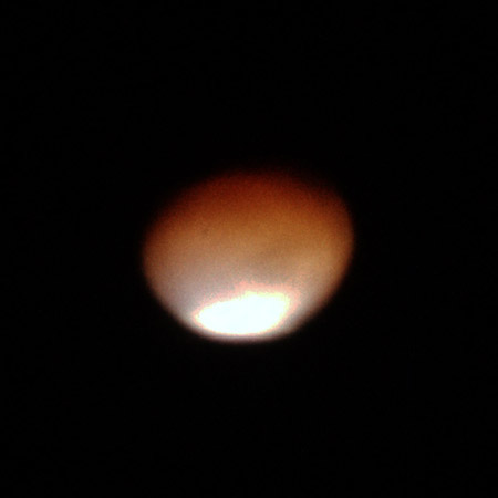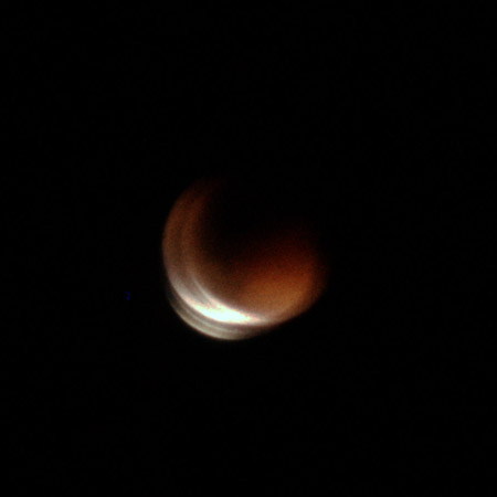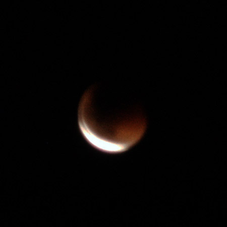 One interesting point to note in these photographs is the apparent shape of the shadow as it crosses the Moon. As seen from Earth, the effect of the Moon's spherical shape on the shadow can be ignored because it is being viewed from the same vantage point as the source of the shadow. Indeed, the apparent curvature of Earth's shadow is a very simple proof that Earth is round. Endeavour, however, is providing a new vantage point for this event, well off to the side of the Earth/Moon line. The spherical shape of the Moon alters the apparent line of Earth's shadow such that at the start of the eclipse, the curve of Earth is more than cancelled out. In two hours time, when the exiting Moon is photographed again, the shape of the Moon will reinforce the curve of Earth and produce a very strong crescent effect. Note also that the shaded part of the Moon has a reddish hue.
