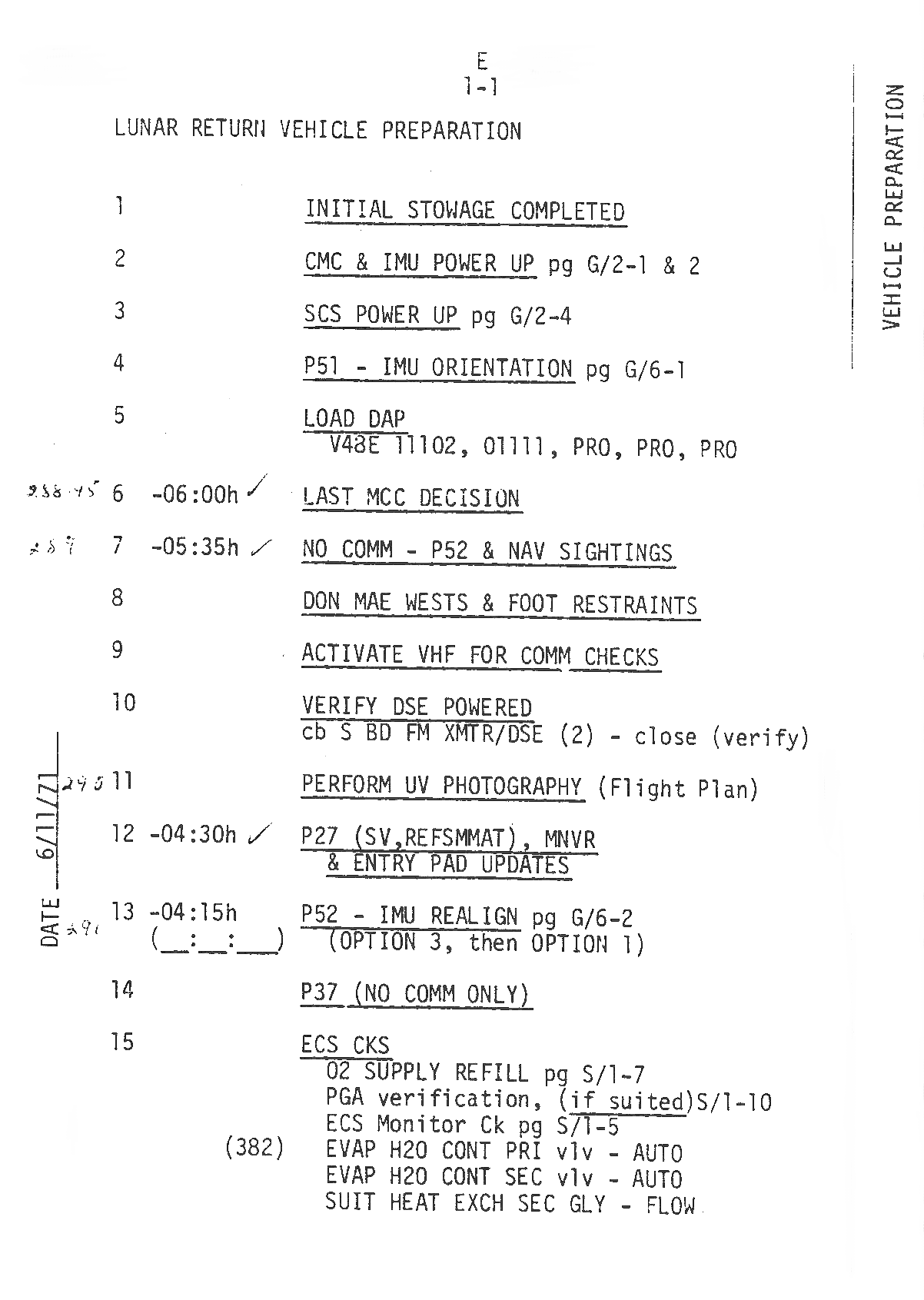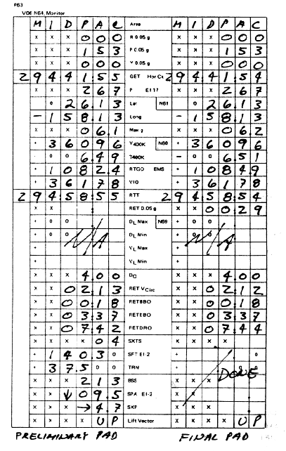289:34:06 Parker: Okay. And next, on the second line under the Noun 68, there's a comment that says "negative [if plus: EMS]." And there's a certain amount of happiness with that statement down here. They say that you can have a positive H dot in P67 nominally and, therefore, the statement on the cue card that this is a fail indication is not a good idea. I understand [Apollo 15 backup CMP] Vance [Brand] discuss[ed] this with Al beforehand.