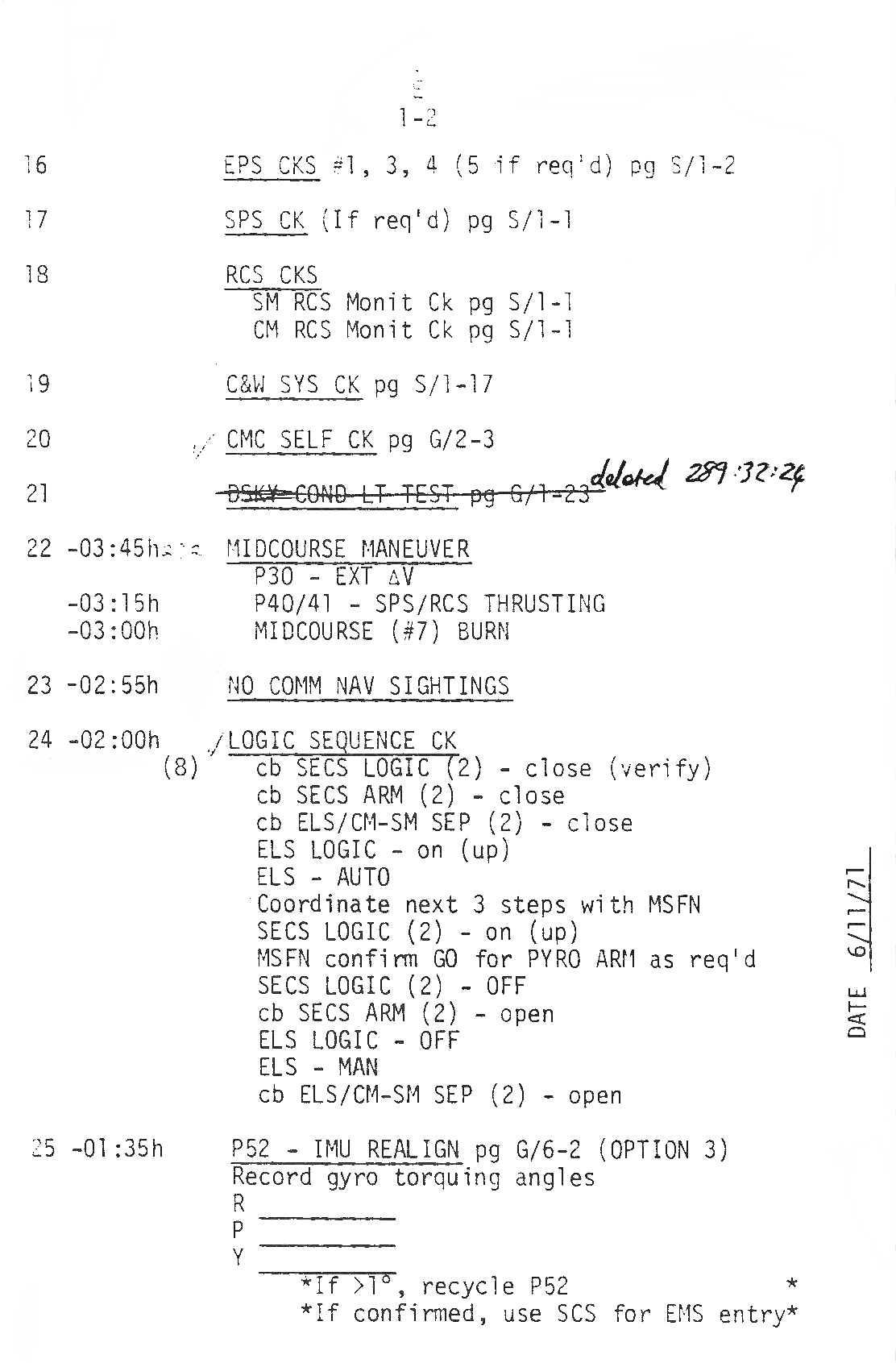 289:33:45 Parker: Okay. Down there near the middle where it says "Steering commands downrange error minus 6 to 0," that should be changed to "Downrange error minus 24 to 0." Over.