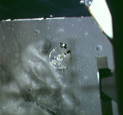Higher resolution: the landing site is visible as a light smudge within the centre of the circle. The lightness is due to the disturbance of the soil by the LM's descent engine. The Fresnel Rilles are at the top of the image and crater Conon is half obscured at the bottom left.AS15-9802P.jpg (864k)