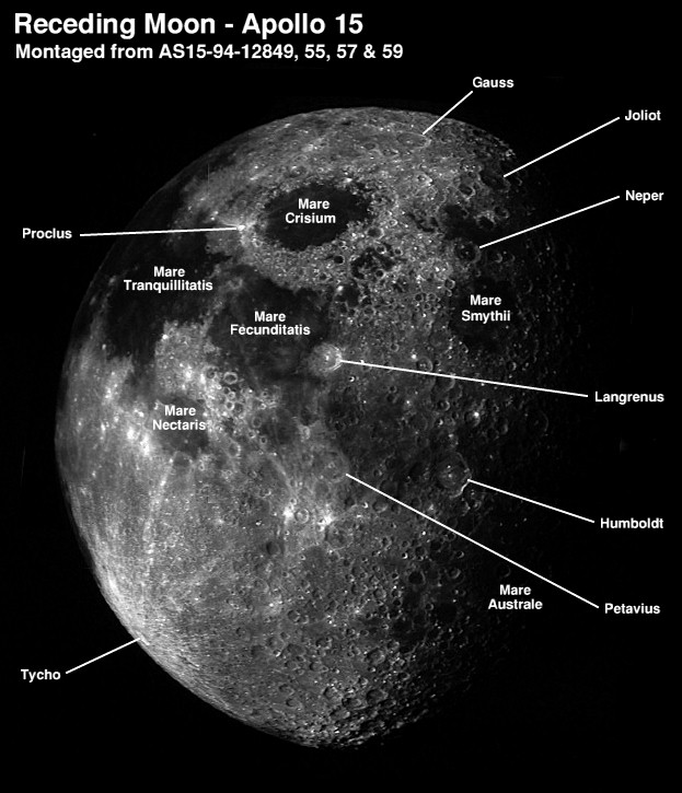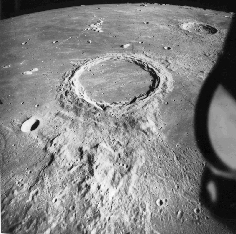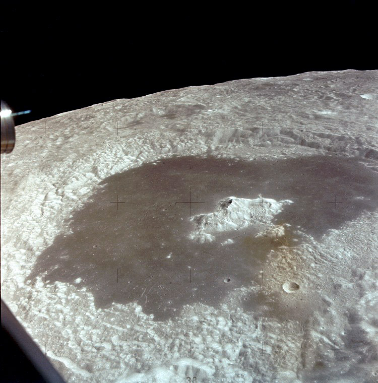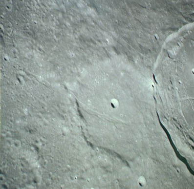 Dawes Crater (diameter 18 km) between the Seas of Serenity and Tranquillity.AS15-9811P.jpg (784k)